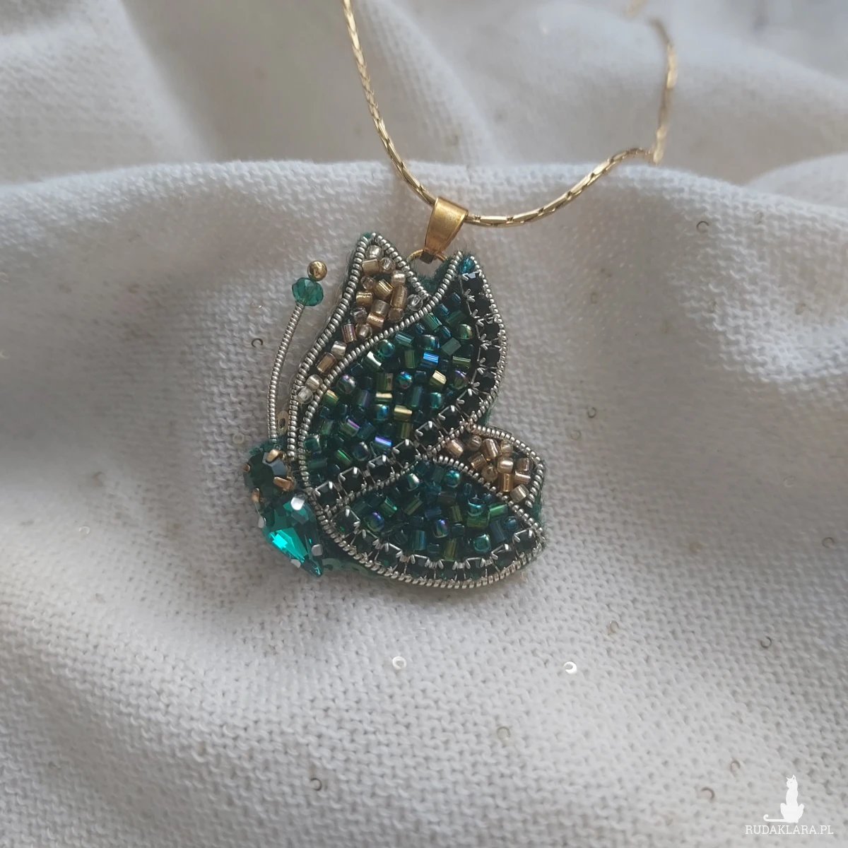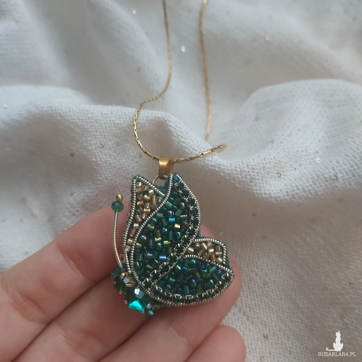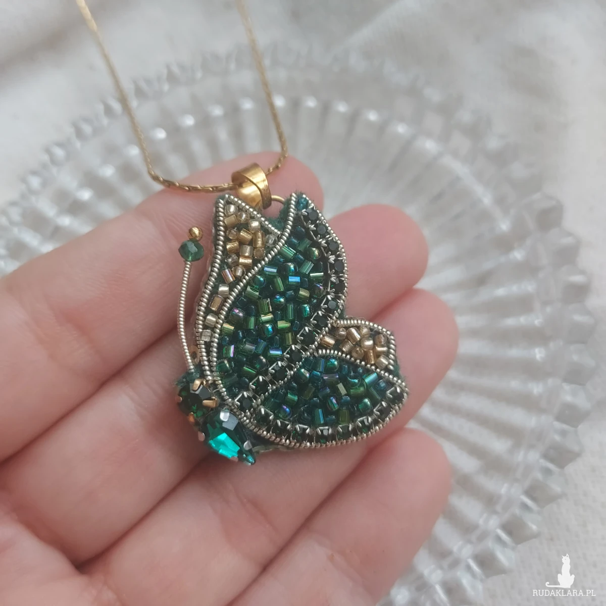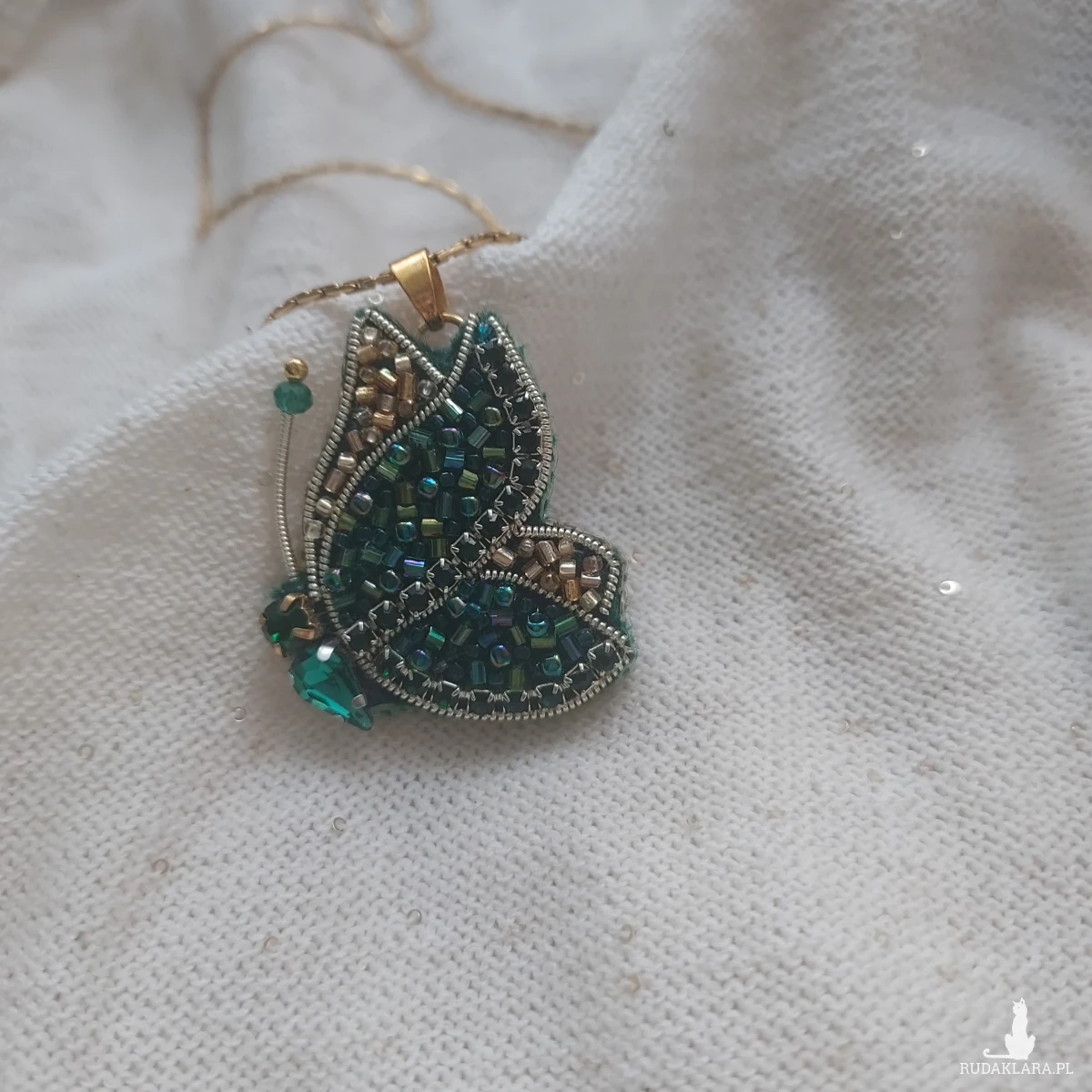 Mam dla Ciebie niezwykle lekki, niepowtarzalny, uroczy wisior motyla w kolorze szmaragdowo- złotym wyszywany haftem koralikowym. To połączenie kolorystyczne sprawdzi się idealnie do wiosennej, a takze letniej stylizacji.