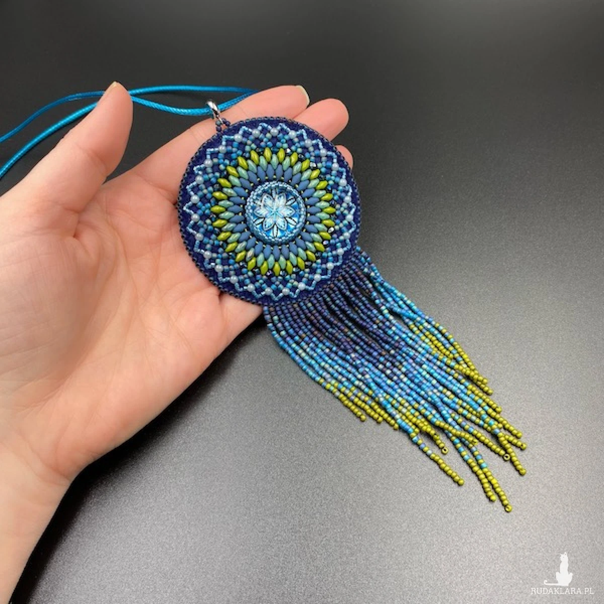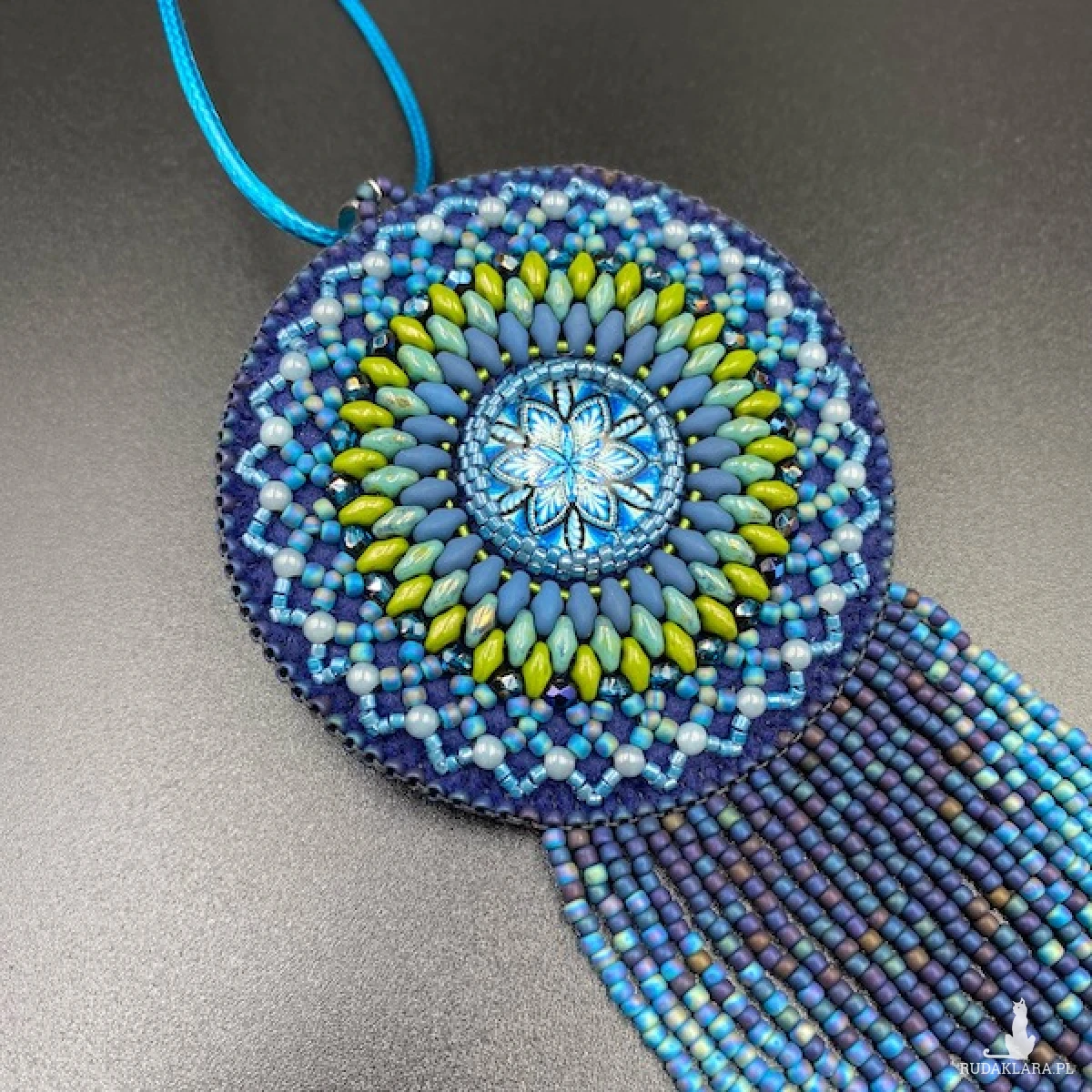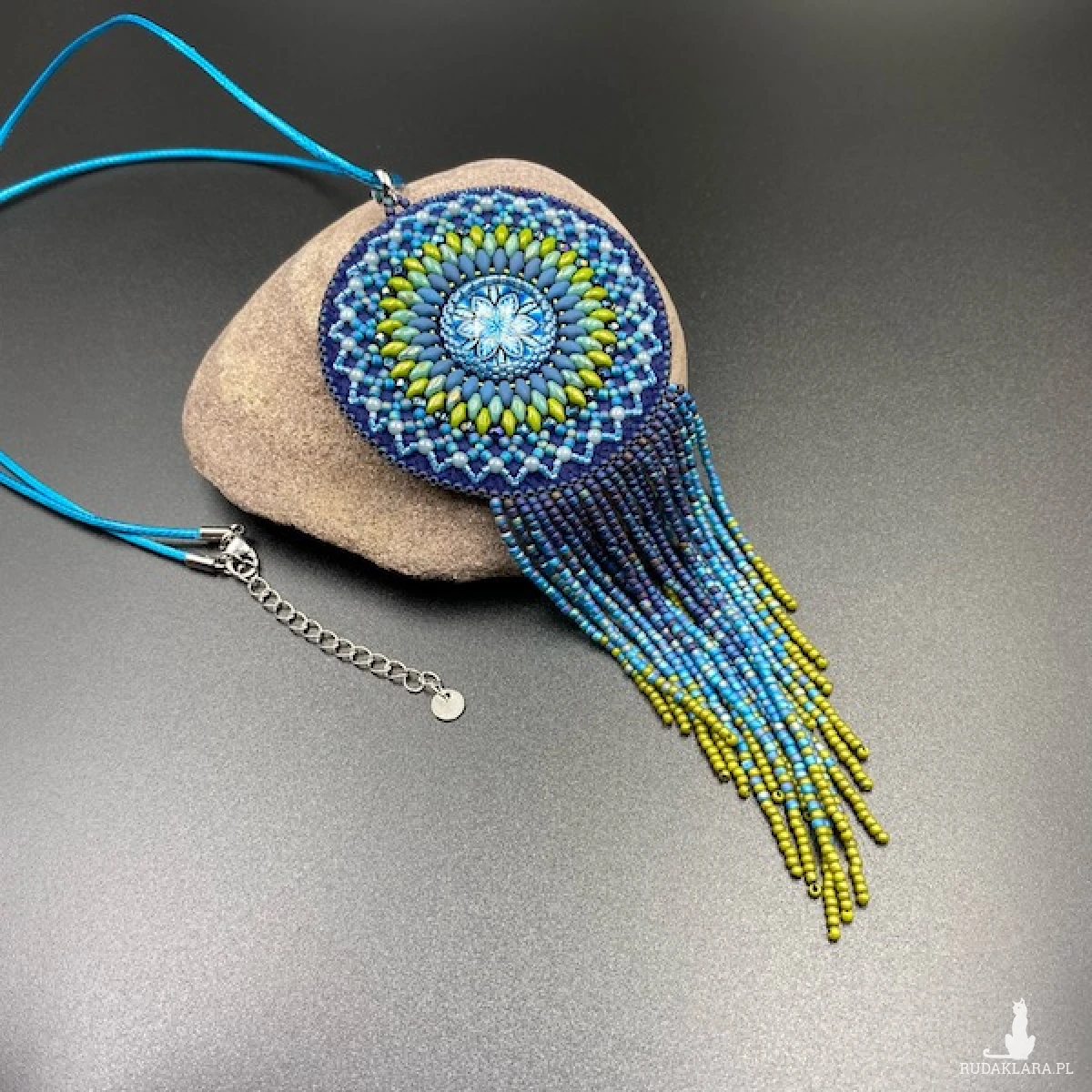 Medalion został wykonany techniką haftu koralikowego w kolorze granatowym, zielonym, niebieskim, morskim. Jego centrum to szklany kaboszon z grafiką 20 mm, opleciony koralikami Toho, Fire Polish, SuperDuo. Całość zakończona ozdobnymi frędzelkami z efektem cieniowania. Medalion zawieszony został na sznurku lakierowanym w kolorze morskim. Tył podszyty chabrową eko skórką. Elementy metalowe ze stali chirurgicznej w kolorze srebrnym.