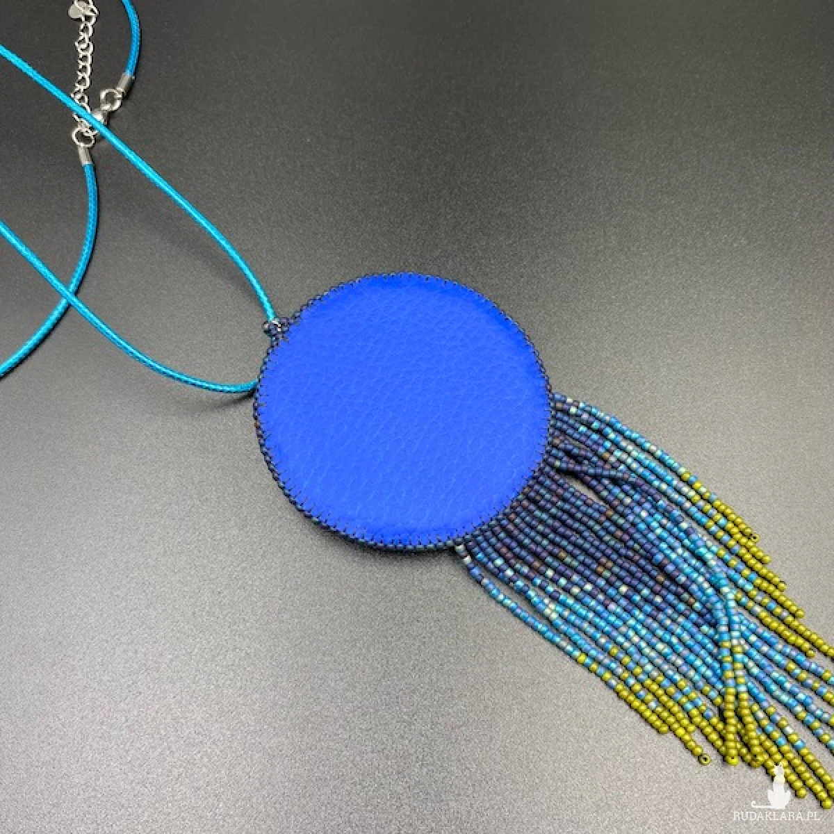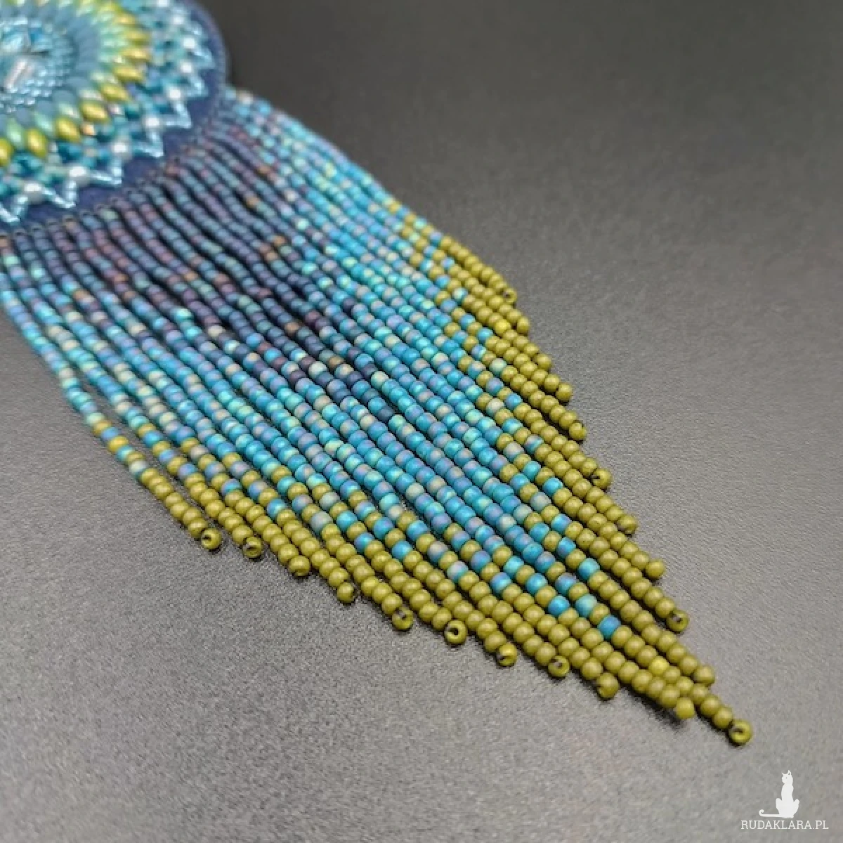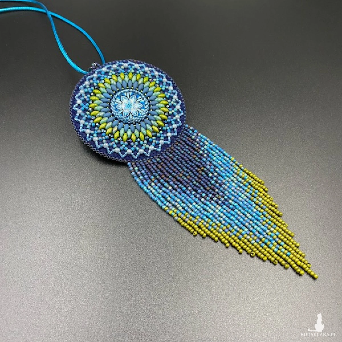 Medalion został wykonany techniką haftu koralikowego w kolorze granatowym, zielonym, niebieskim, morskim. Jego centrum to szklany kaboszon z grafiką 20 mm, opleciony koralikami Toho, Fire Polish, SuperDuo. Całość zakończona ozdobnymi frędzelkami z efektem cieniowania. Medalion zawieszony został na sznurku lakierowanym w kolorze morskim. Tył podszyty chabrową eko skórką. Elementy metalowe ze stali chirurgicznej w kolorze srebrnym.