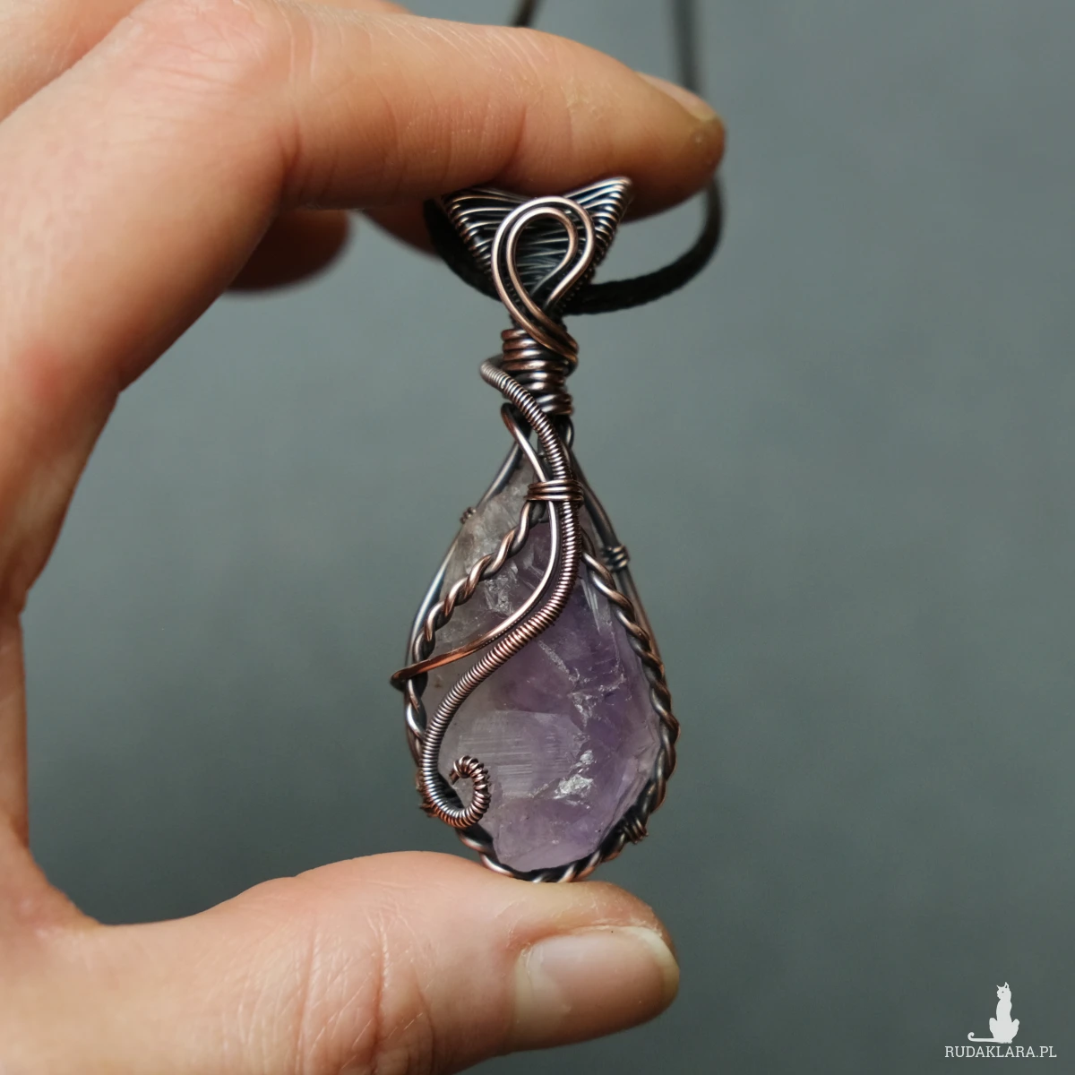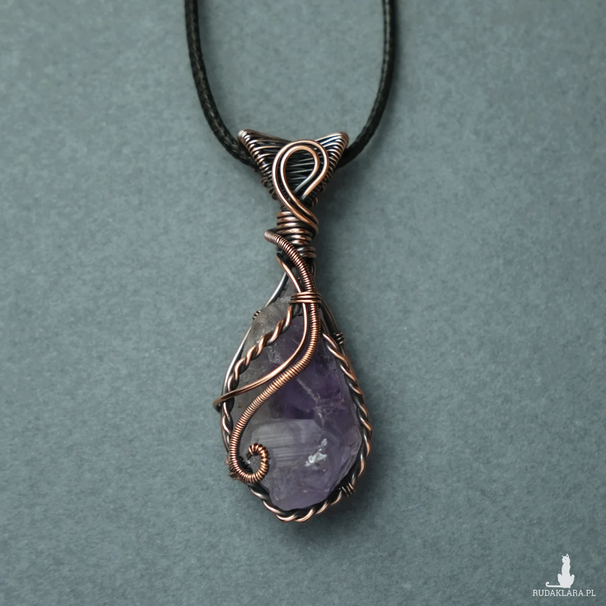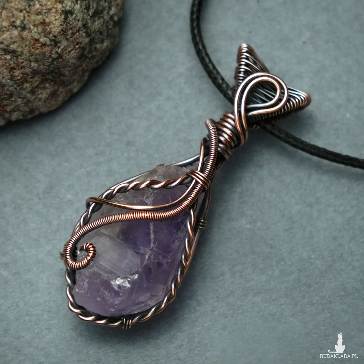 Wisiorek mieści w sobie surową bryłkę ametystu. Oplatają go, z przodu oraz z tyłu, delikatne sploty miedzianego drutu podkreślające dziewczęcy charakter wisiorka.