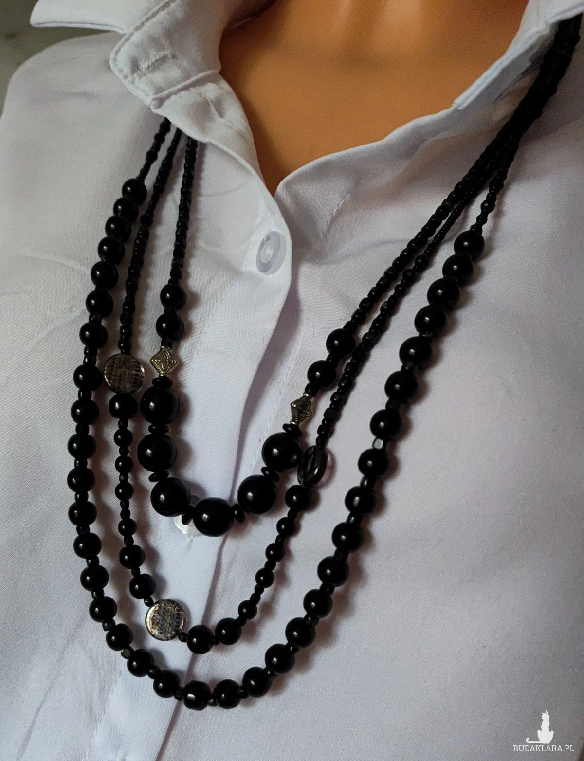 Naszyjnik , trzy sznury korali czarnych szklanych i kulek onyxu gładkiego 8 i 12 mm, korale na sznurku syntetycznym, bezpieczne dla alergików, zapięcie z mała regulacją ok 2 cm, długość korali 32 cm