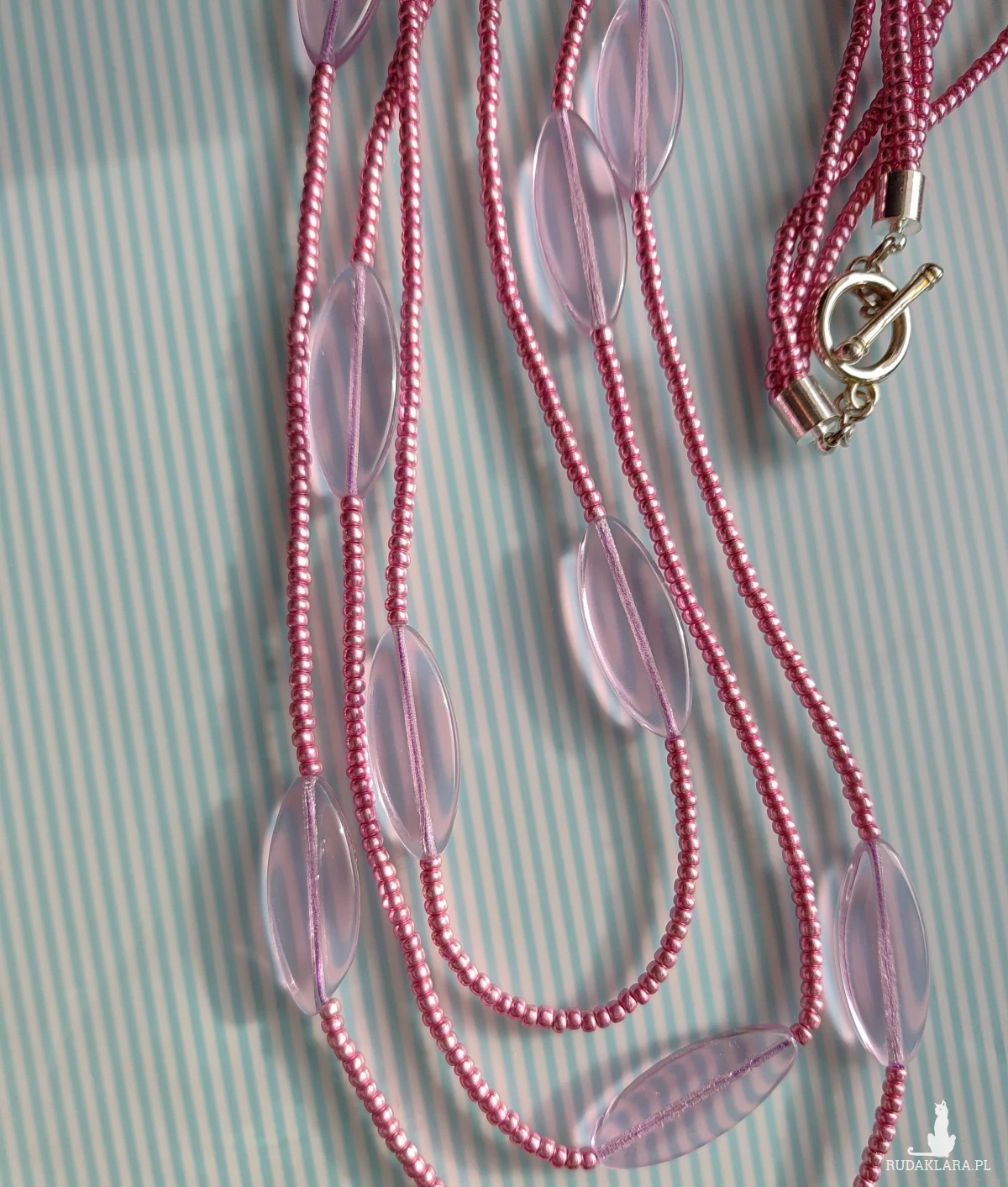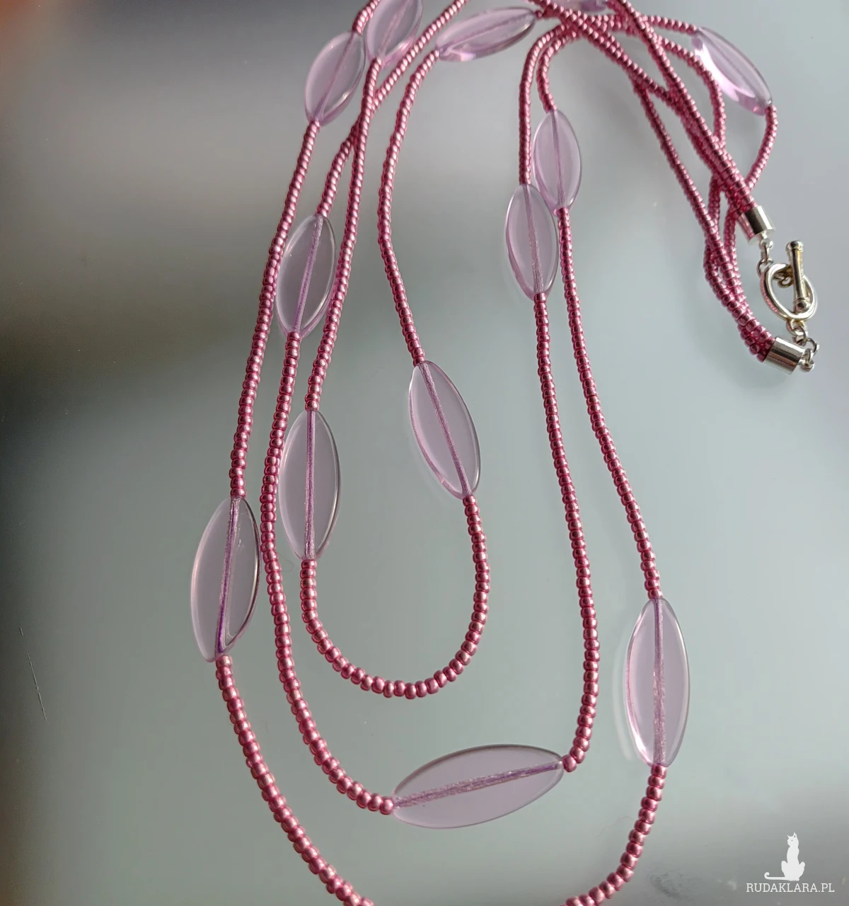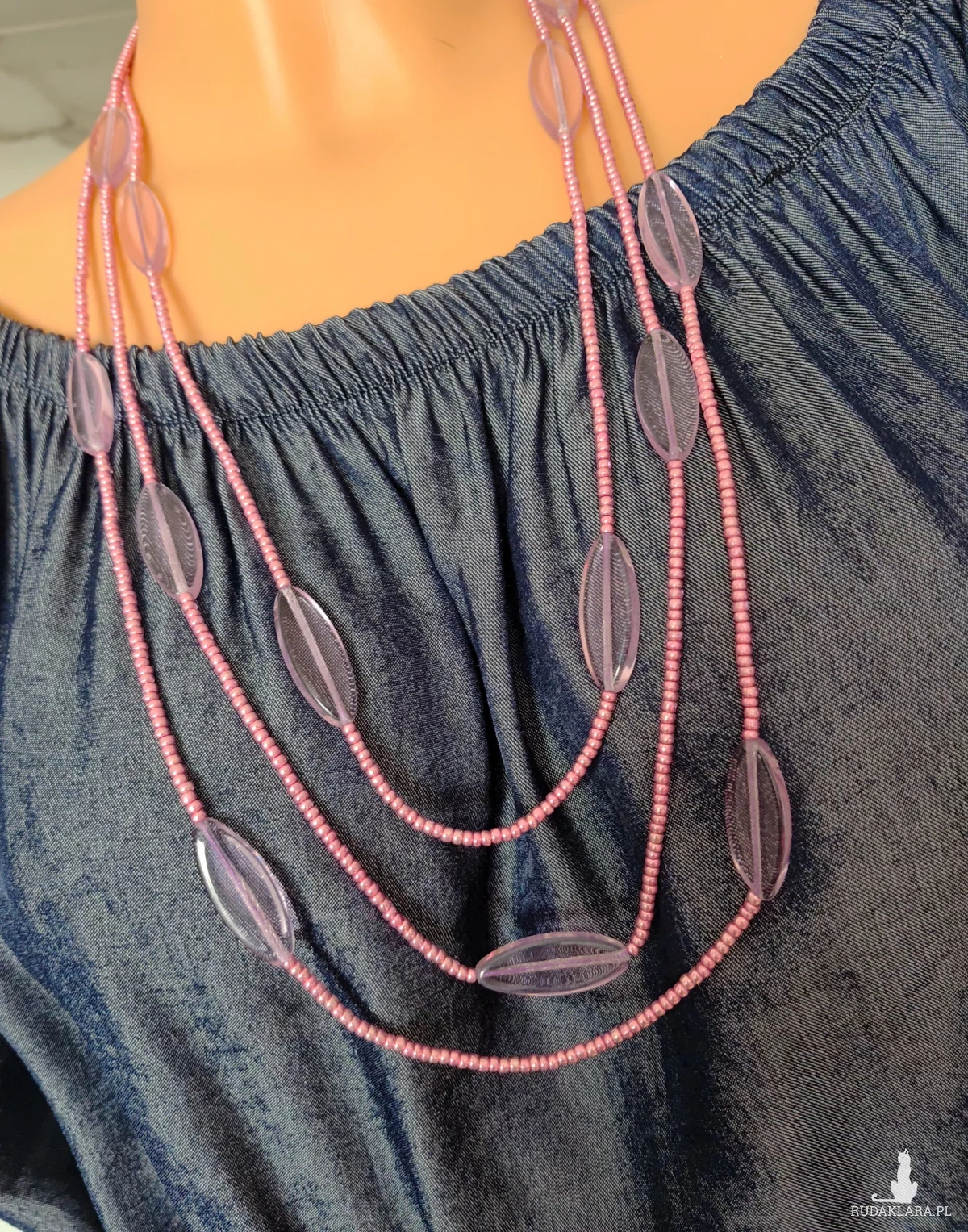 Korale z różowych oliwek płaskich dużych 3x1,2 cm, na sznur syntetyczny jubilerski nawleczone drobne koraliki czeskie Preciosa Jablonex metalizowane. Sznur najdłuzszy ma 39 cm, delikatne , lekkie, polecam
