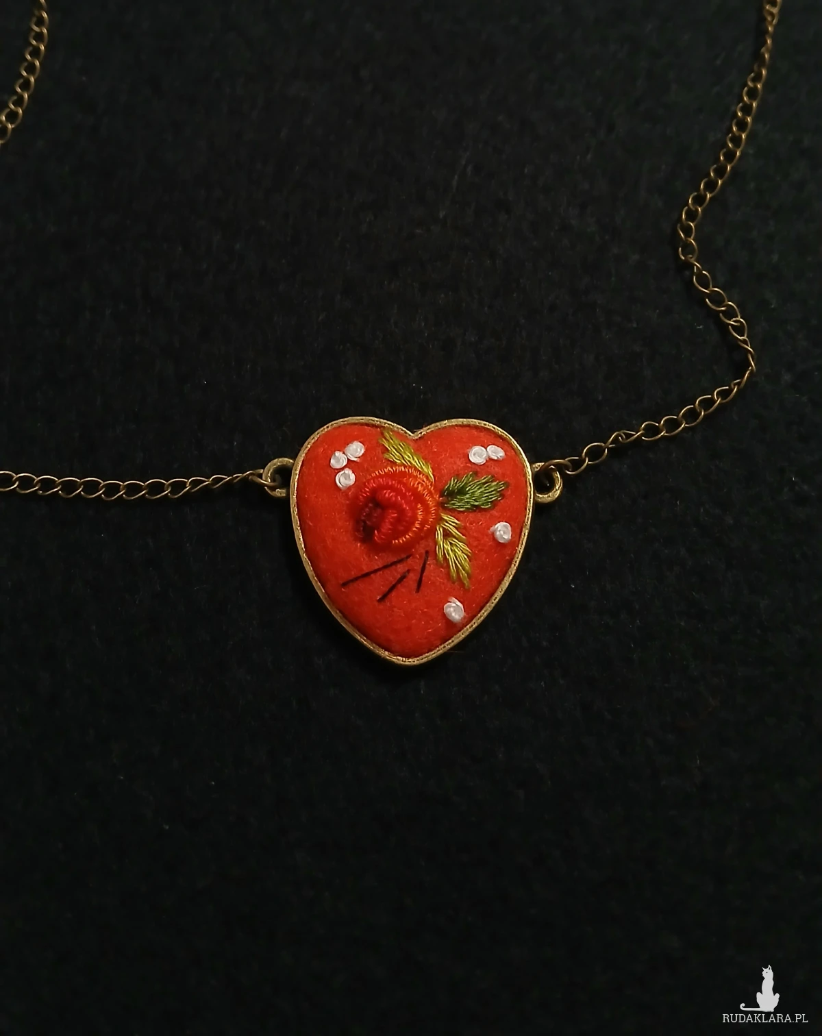Osobliwe słodkie serduszko. Prostota i elegancja. Wyhaftowana z pasją maleńka różyczka w czerwonym serduszku to zawsze trafiony upominek od niego dla niej.