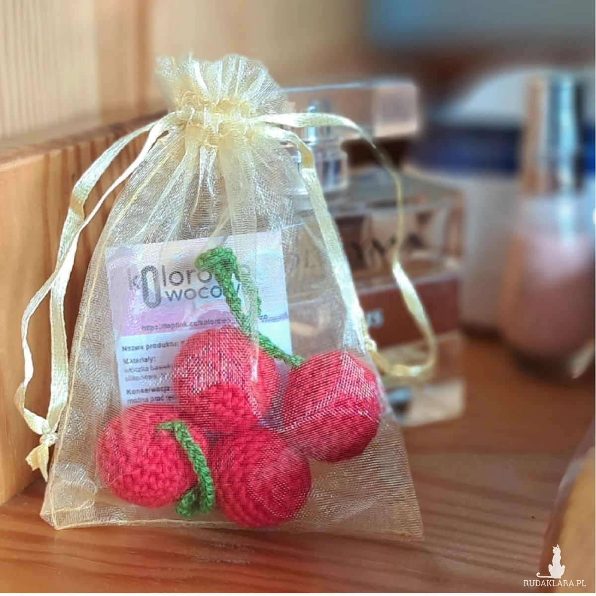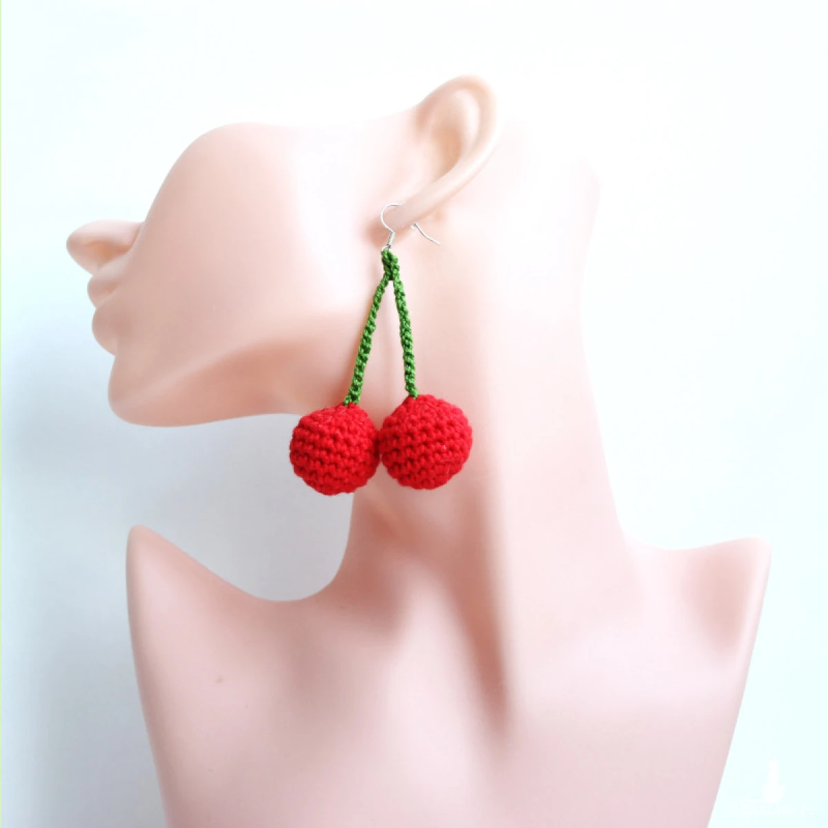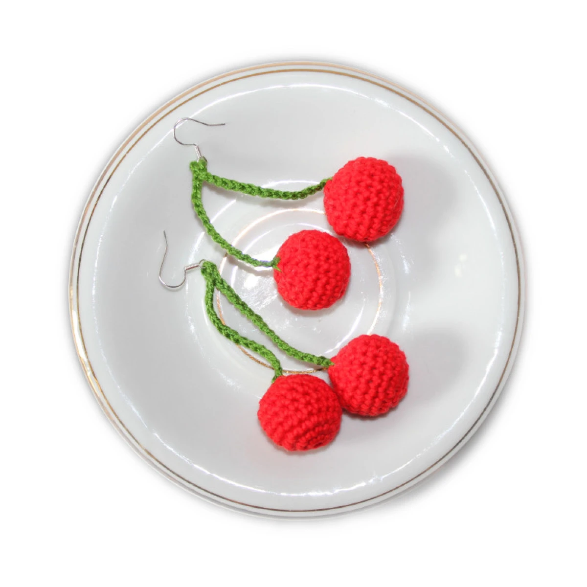 Proszę, oto kolczyki wisienki zrobione na szydełku, przywołujące wspomnienia z dzieciństwa.