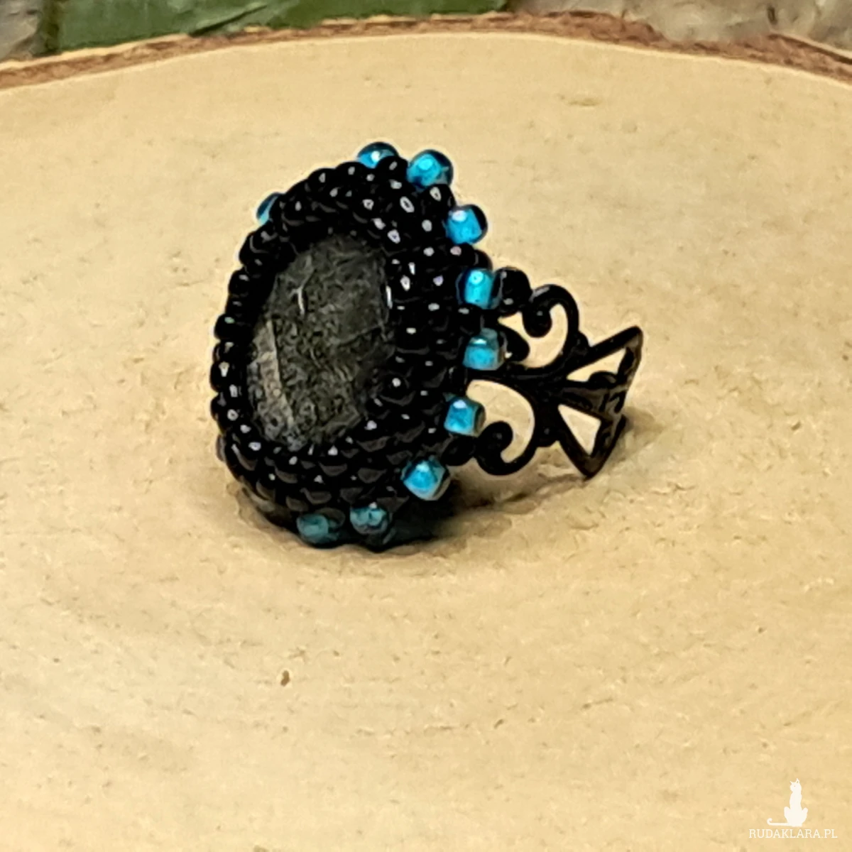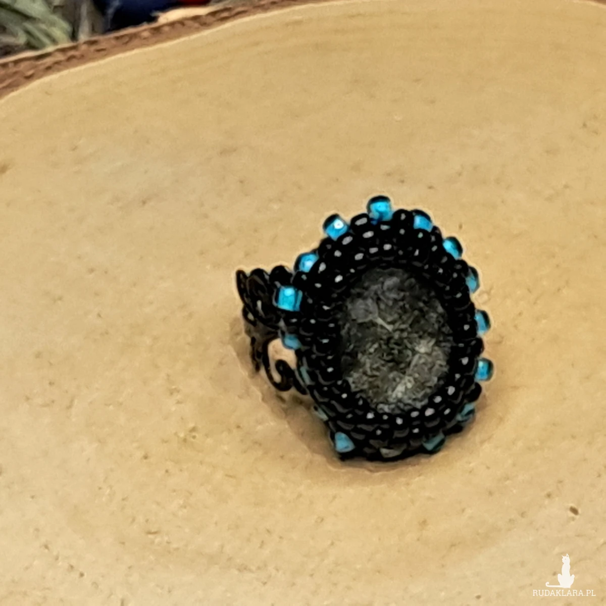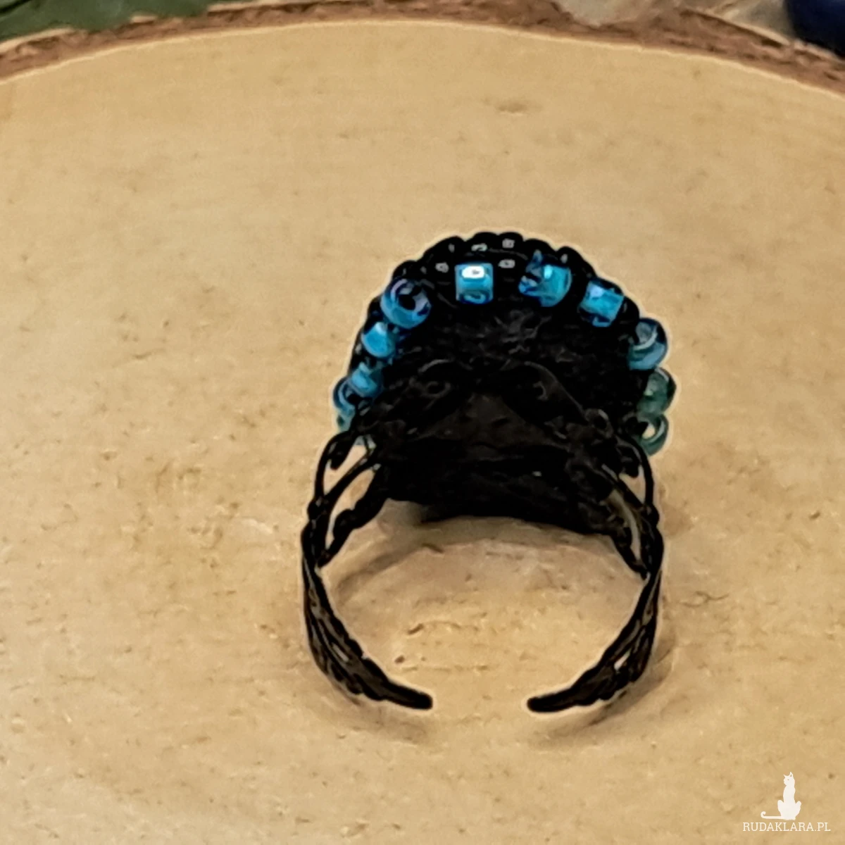 Pierścionek posiada regulowaną, ażurową obrączkę, dzięki której doskonale dopasowuje się do każdego rozmiaru palca, zapewniając komfort noszenia. Centralnym punktem jest piękny, obszyty koralikami srebrny, fasetowany kaboszon, który przyciąga wzrok i nadaje pierścionkowi elegancji.