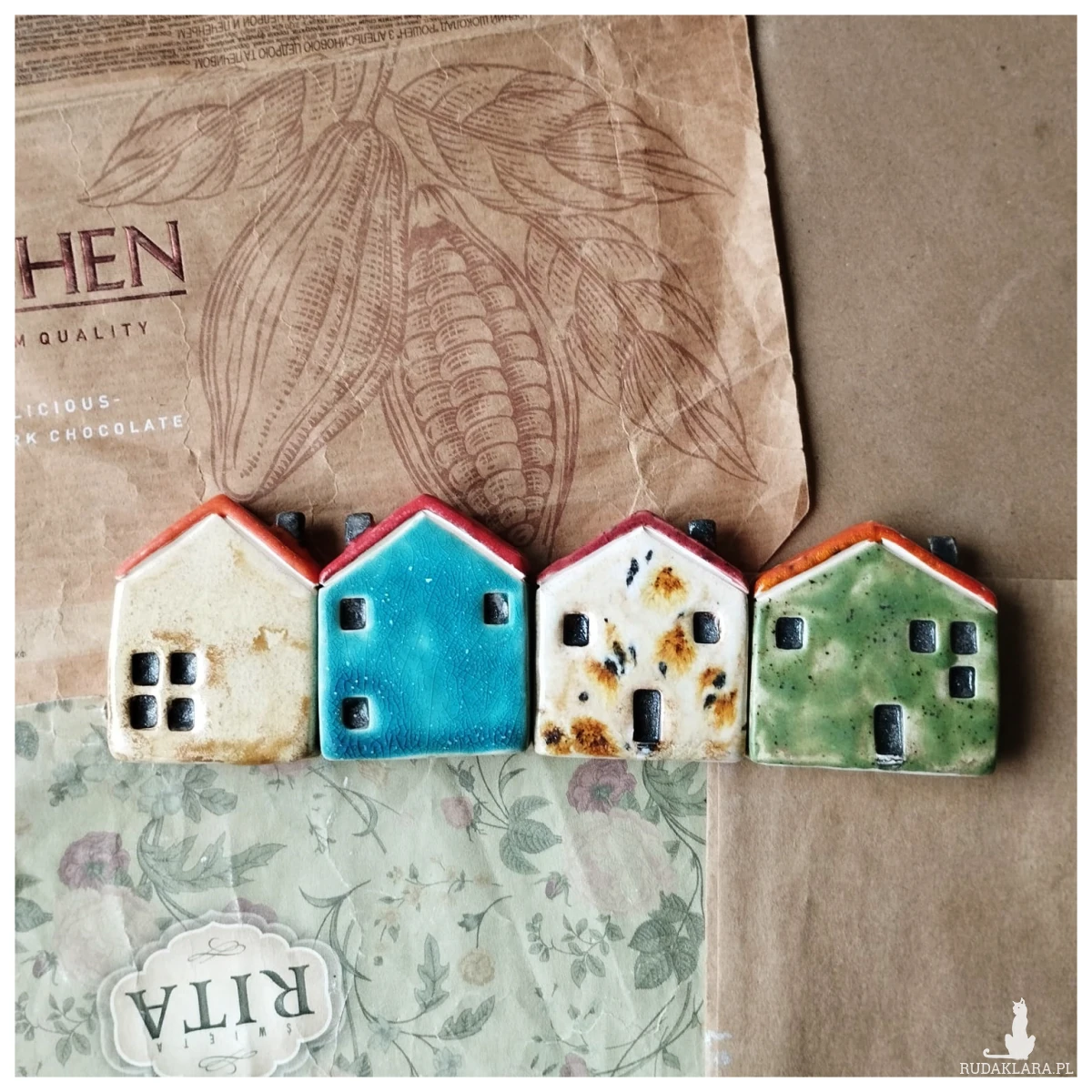 Zestaw 4 domków wykonanych z gliny szamotowej wypalonych na biskwit, a następnie szkliwionych w temperaturze ok 1260 stopni C. Wysokość od 4 do 5 cm. W wesołych kolorach. idealne do postawienia na półeczce. Serdecznie polecam! Domki również do kupienia osobno.