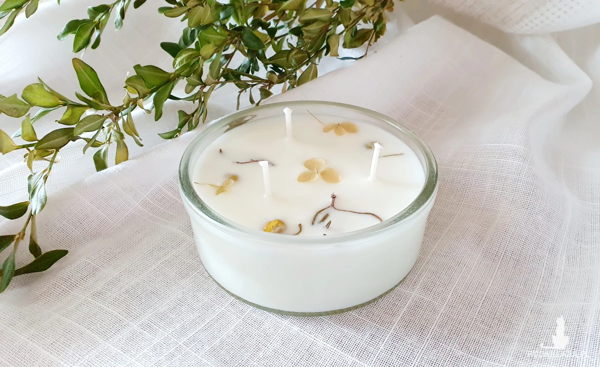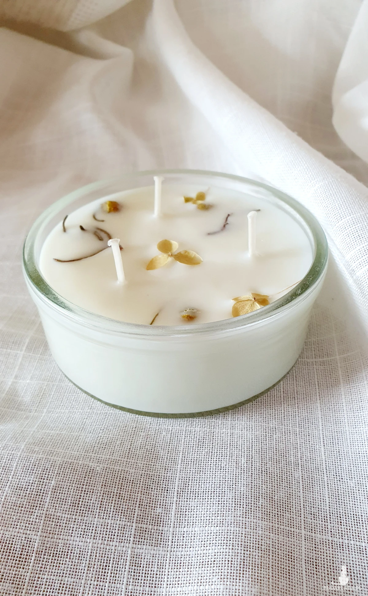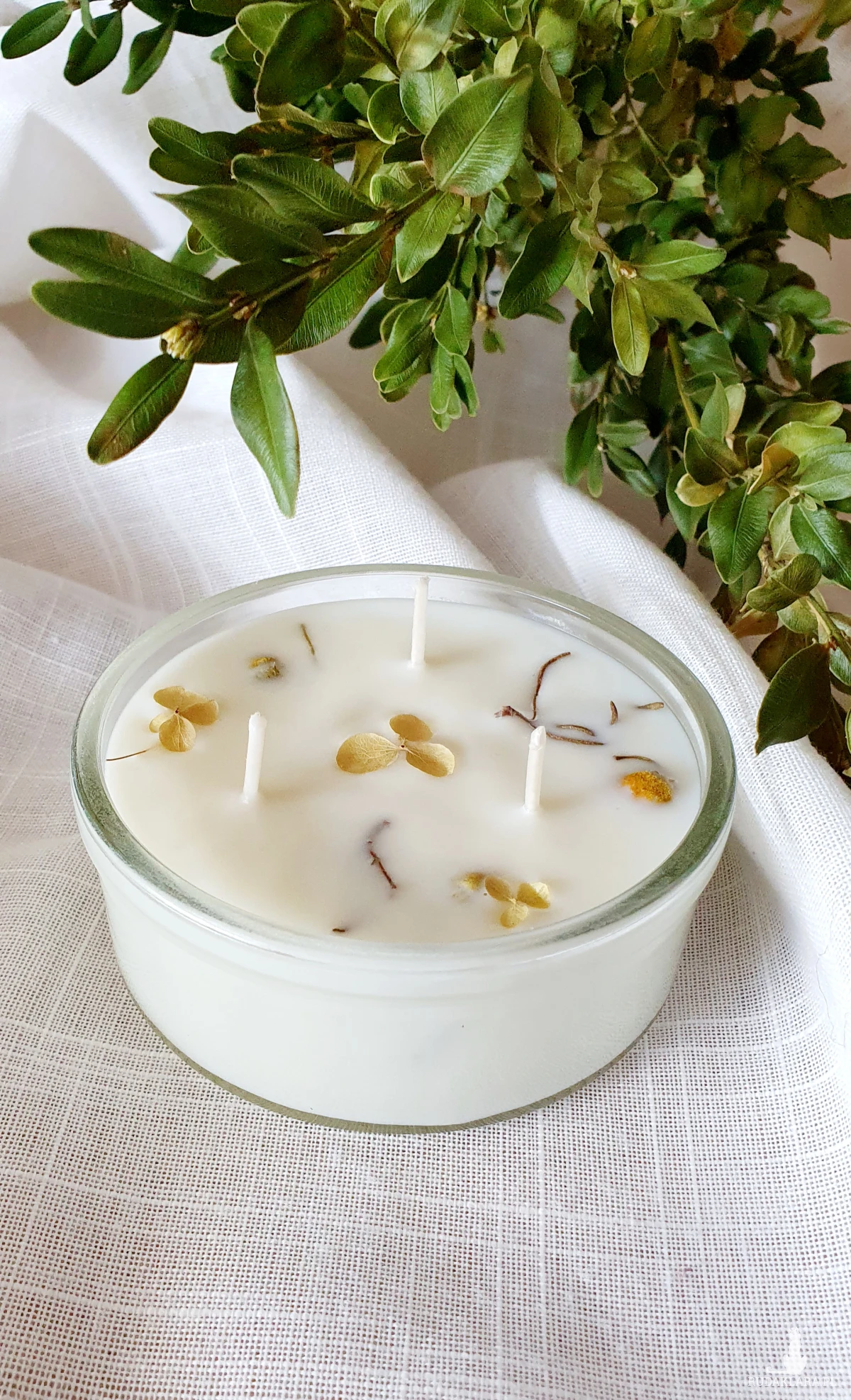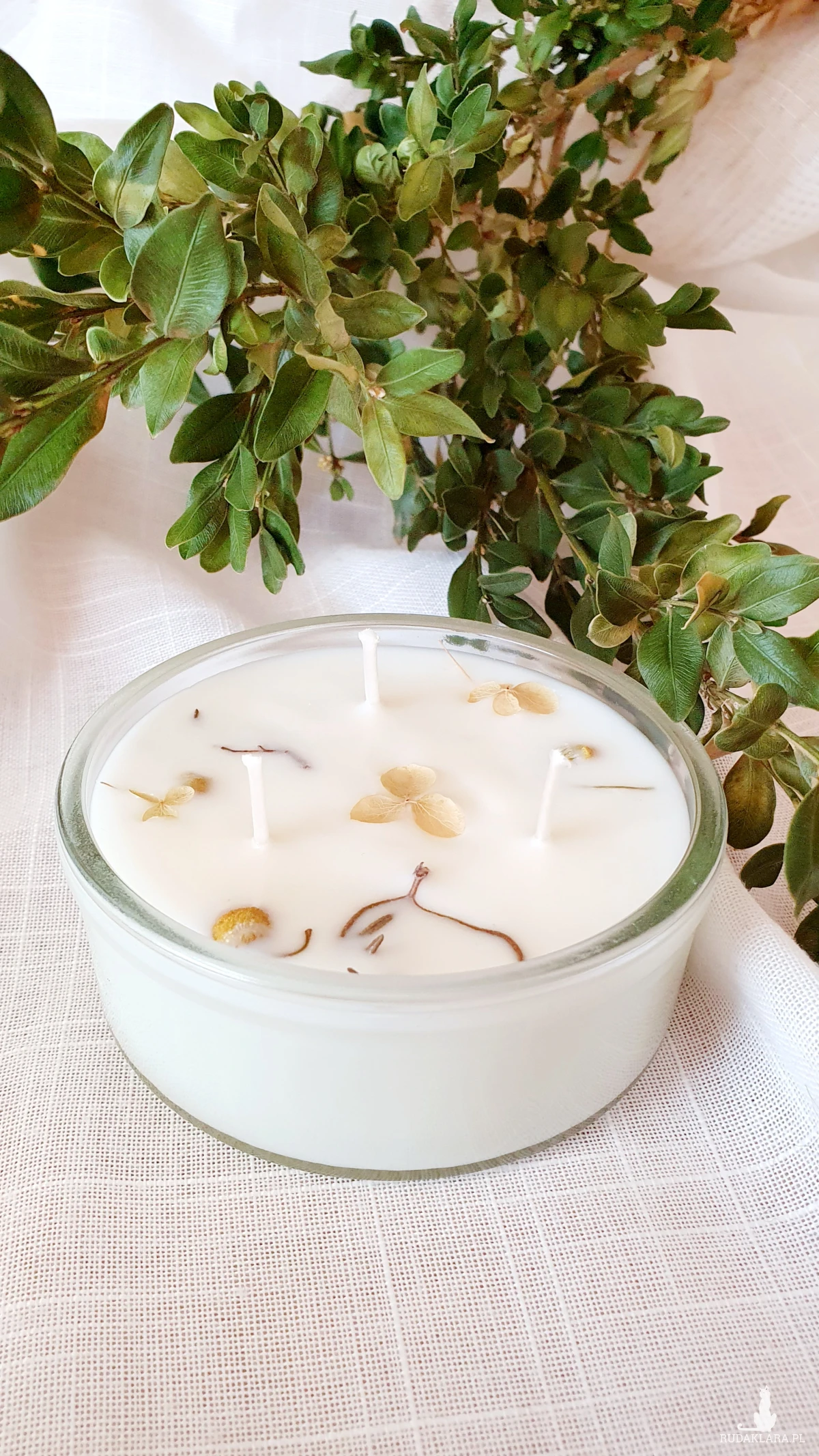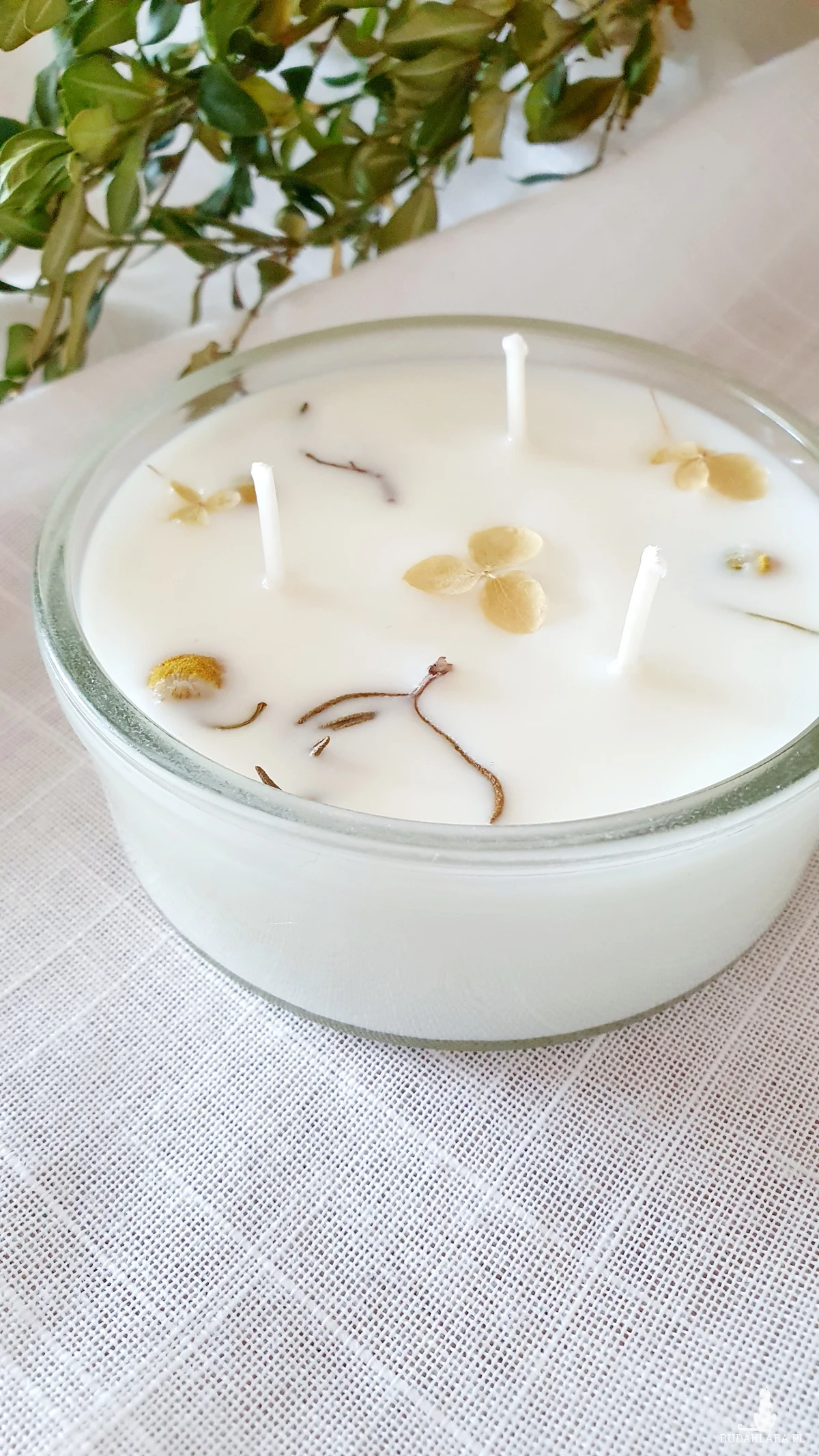 Świeca sojowa wykonana ze 100% wosku sojowego z dodatkiem olejku o zapachu rozmarynu, udekorowana suszonymi kwiatkami hortensji, rozmarynem i rumiankiem. Lekkie nierówności na wierzchu świecy świadczą o własnoręcznym jej wykonaniu.