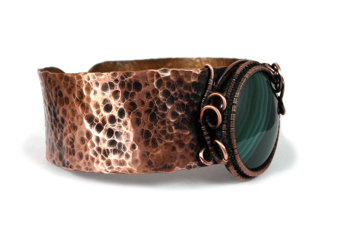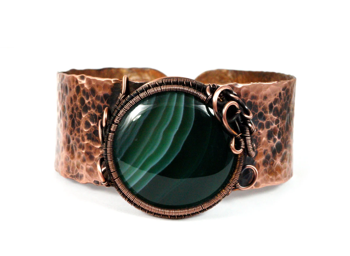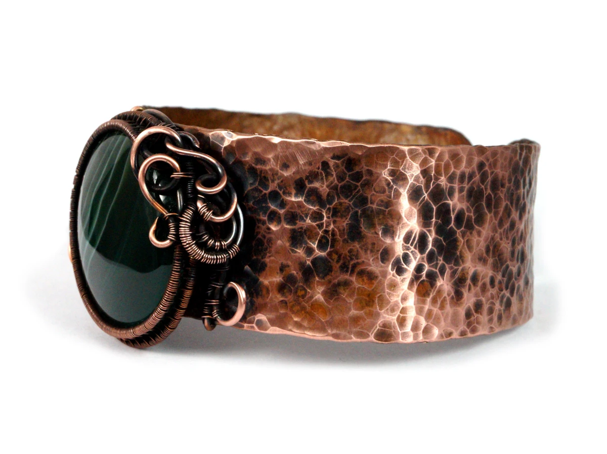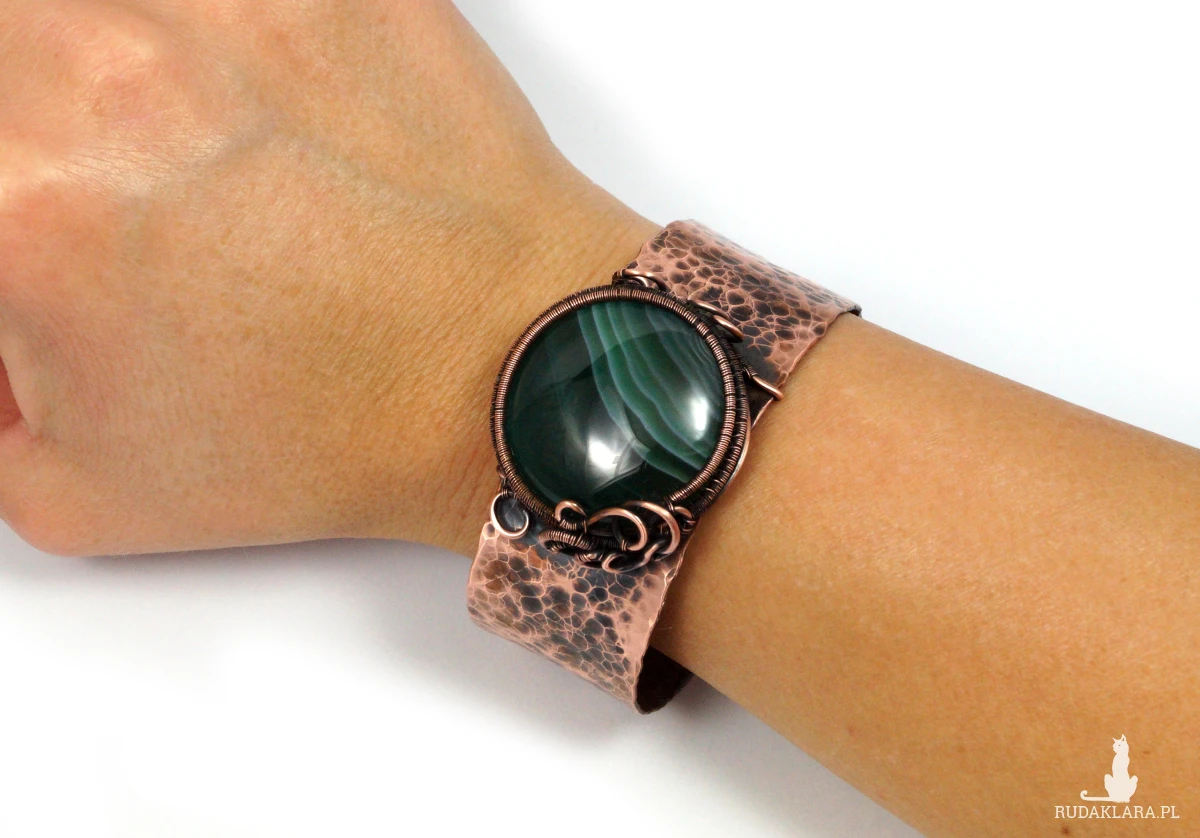 Bajeczna, misternie wykonana bransoletka z patynowanej miedzi z kaboszonem agatu zielonego. Bransoletka wykonana z młotkowanej miedzi i z kaboszonu agatu osadzonego w technice wire wrapping. Bransoletka regulowana. Miedz młotkowana, patynowana polerowana i przecierana.