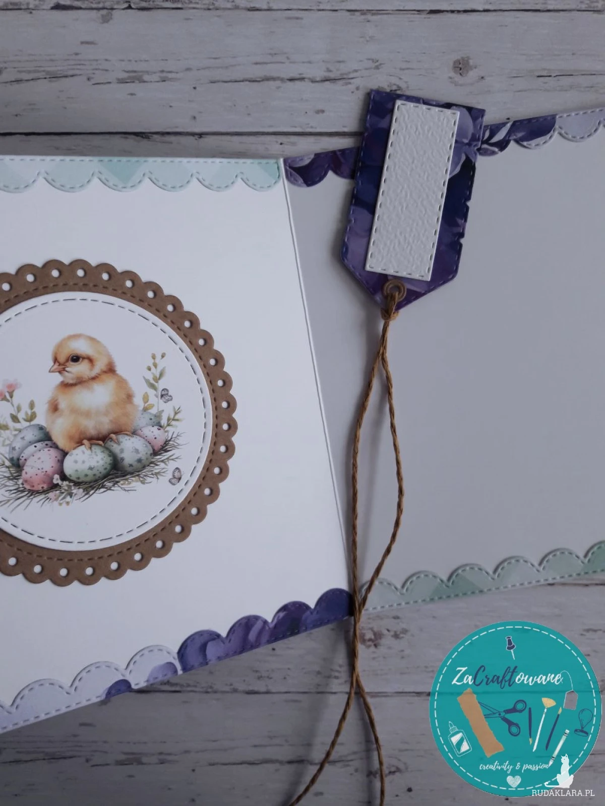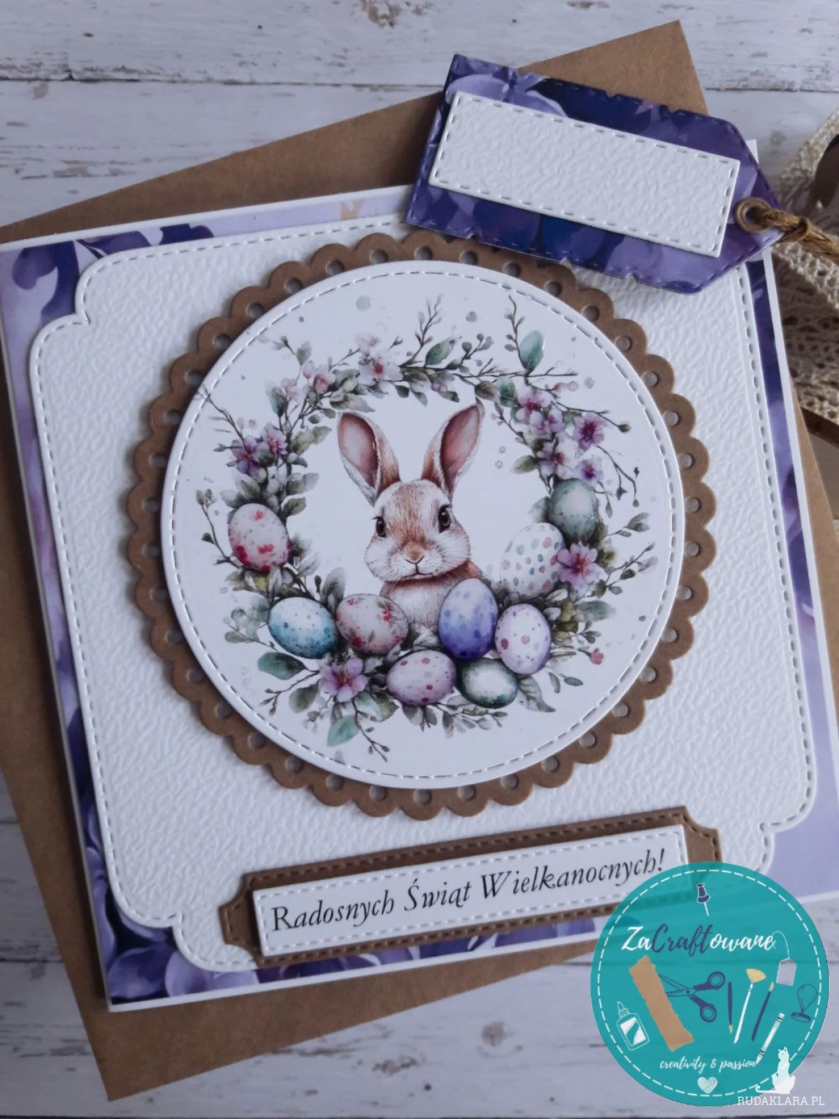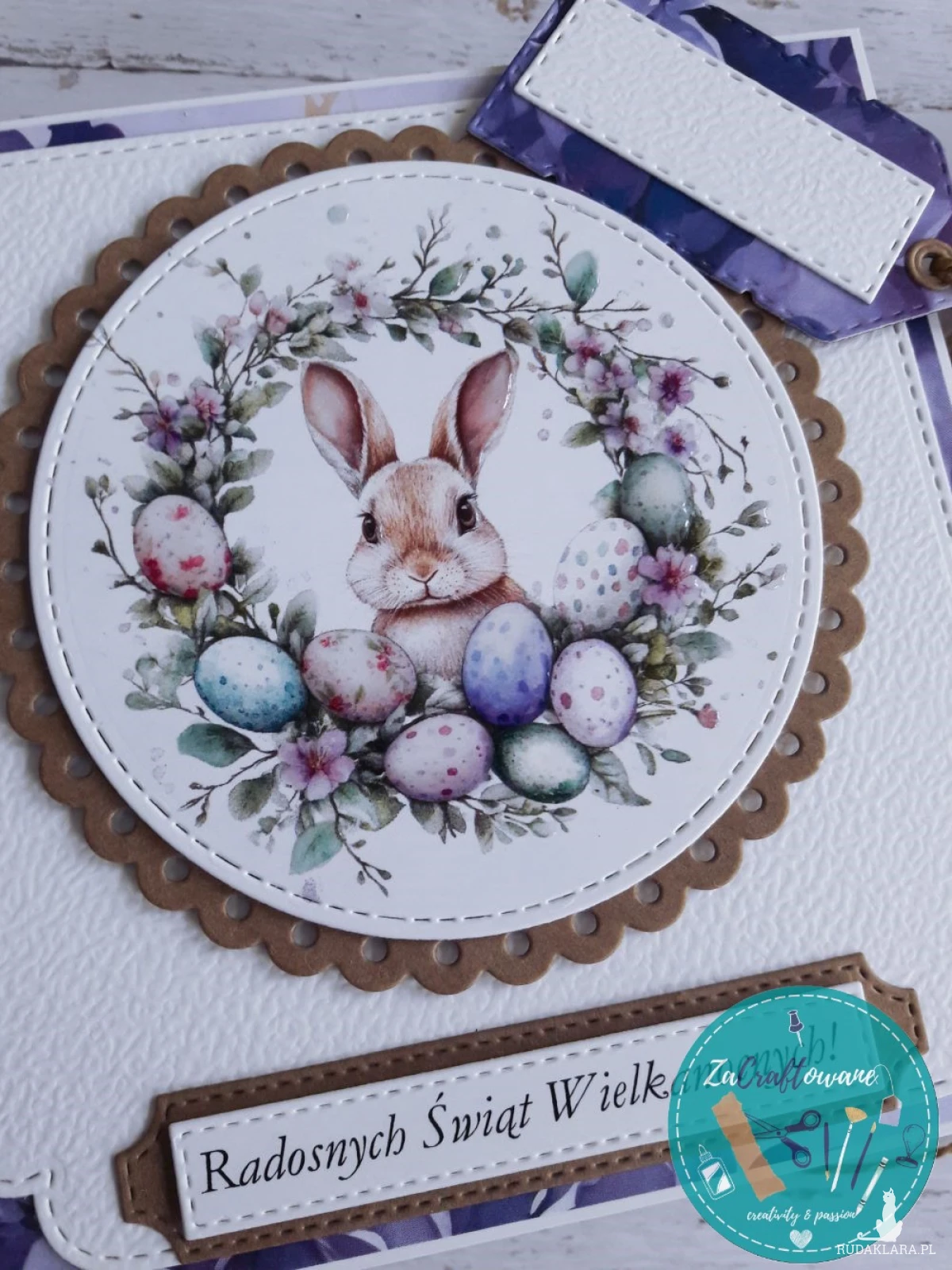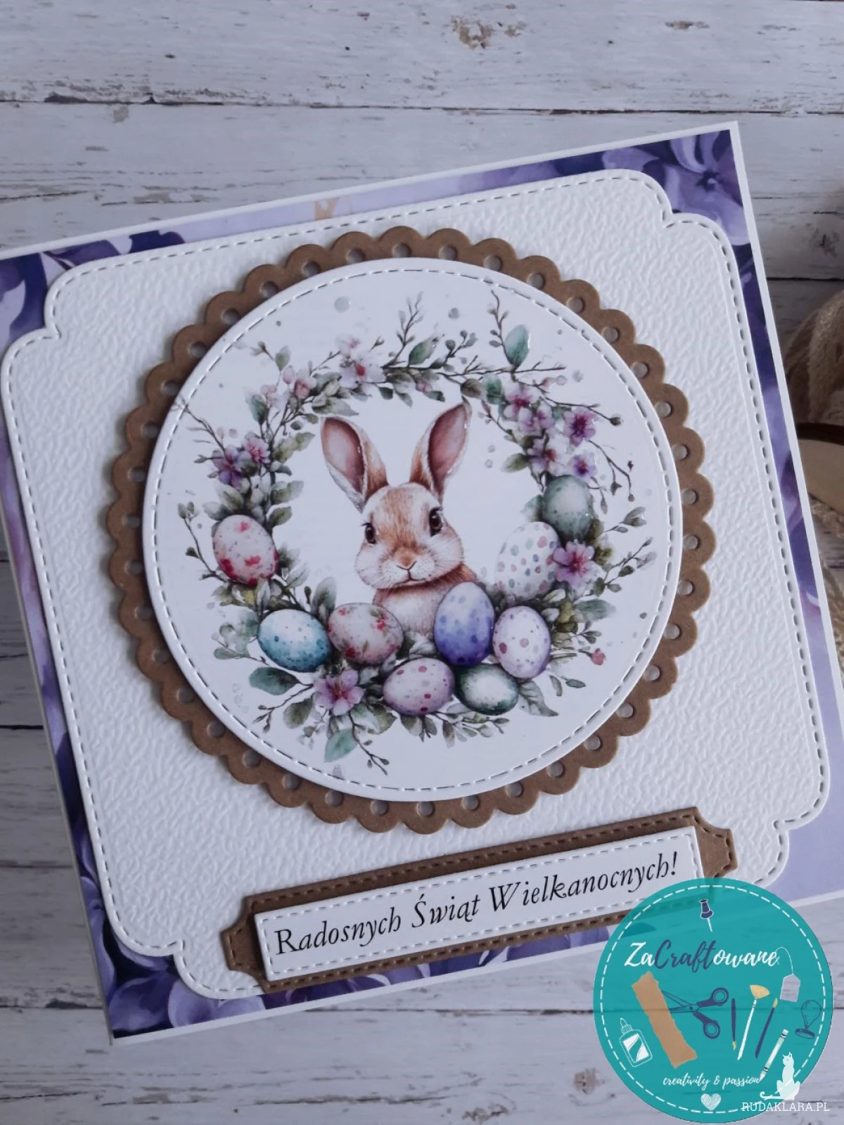 Ręcznie robiona kartka wielkanocna z króliczkiem wykonana metodą scrapbookingu, z dbałością o każdy szczegół.