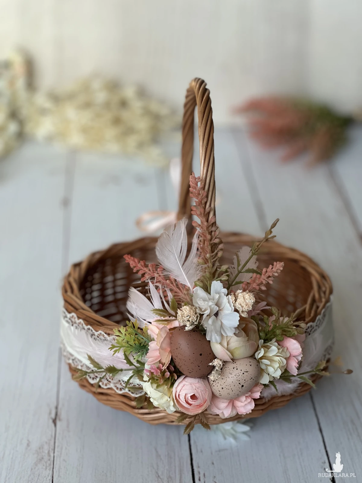 Koszyczek wielkanocny z naturalnej wikliny, ozdobiony kwiatami i dodatkami sztucznymi. Dekoracja na stałe przymocowana do koszyczka, przygotowana przeze mnie ręcznie :)