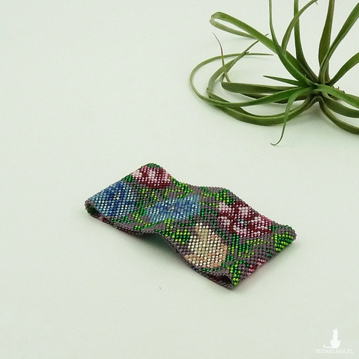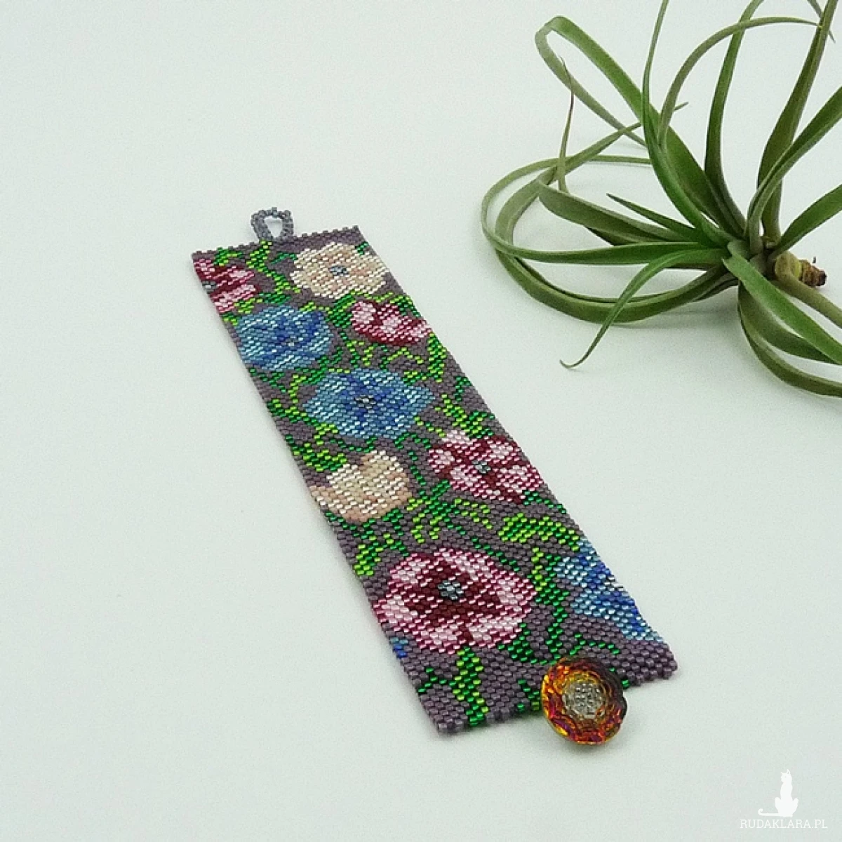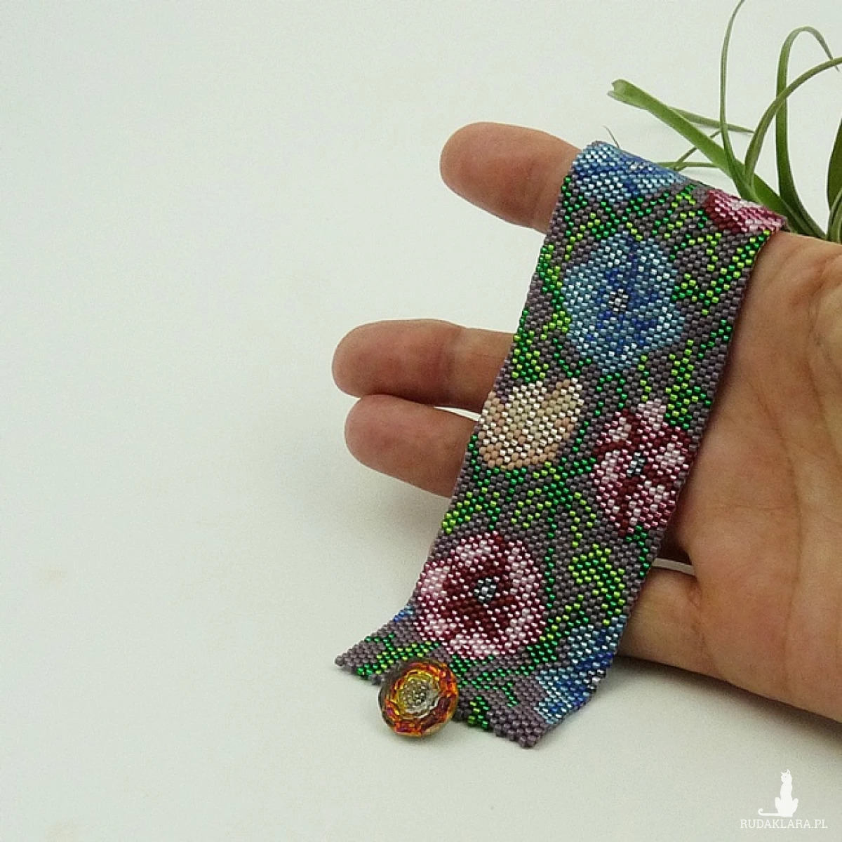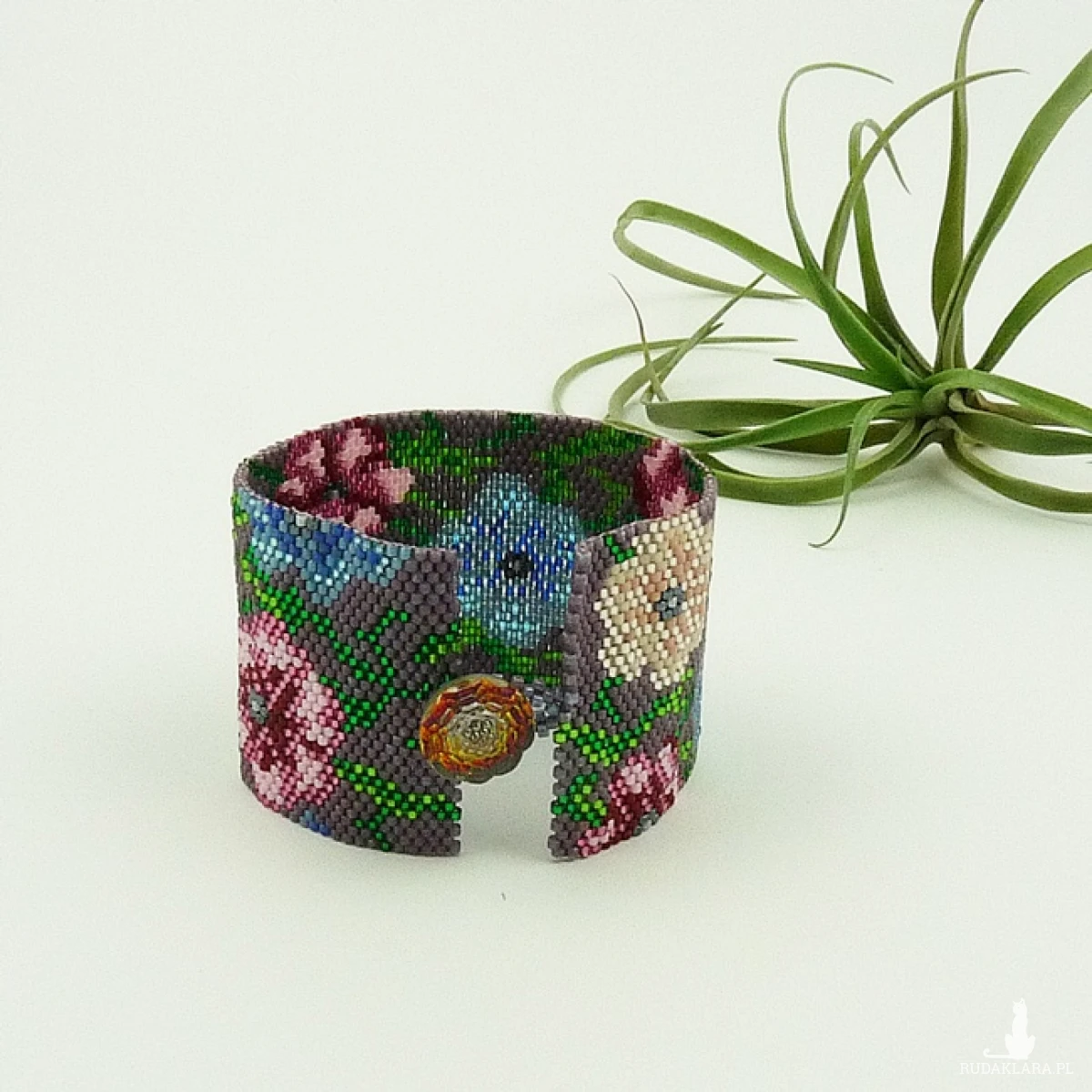 Szeroka, płaska bransoletka wykonana ręcznie według autorskiego projektu z japońskich koralików Toho i Miyuki. W tej bransoletce jest ich trochę ponad trzy tysiące. Te malutkie, szklane koraliki mają cylindryczny kształt i są bardzo równe, przez co doskonale układają się w pracy. Piękne kolory i różne powłoki (matowe, błyszczące, silver) pozwalają tworzyć małe dzieła sztuki. Tu wykorzystałam koraliki z błyszczącą powłoką, matową oraz ze srebrnym środkiem (silver) w czternastu kolorach/odcieniach. Taką biżuterię można założyć do pracy, do szkoły, na małe i duże wyjścia, te nieformalne i oficjalne, na rodzinne uroczystości i romantyczne wieczory. Każda kobieta poczuje się wyjątkowa w biżuterii, która jest niepowtarzalna. Tylko jeden egzemplarz. Bransoletka nie jest sztywna, miękko układa się na ręce. Miła w dotyku. Pięknie błyszczy. Z Kolekcji Kwiaty polne polecam również bransoletkę Maki z chabrami oraz Chabry.
