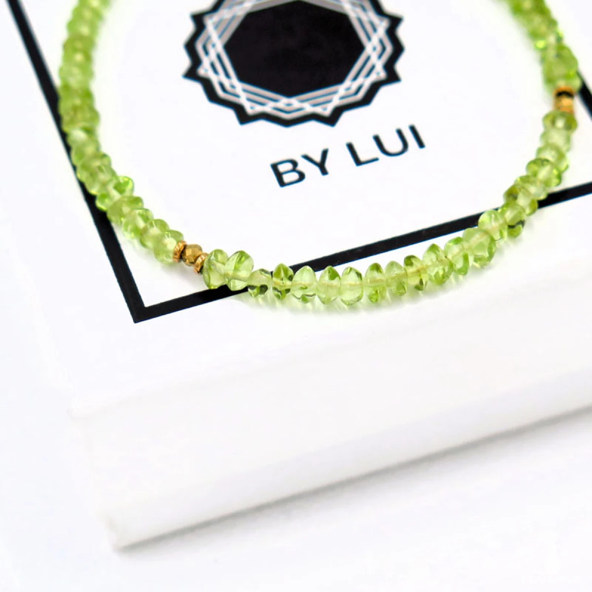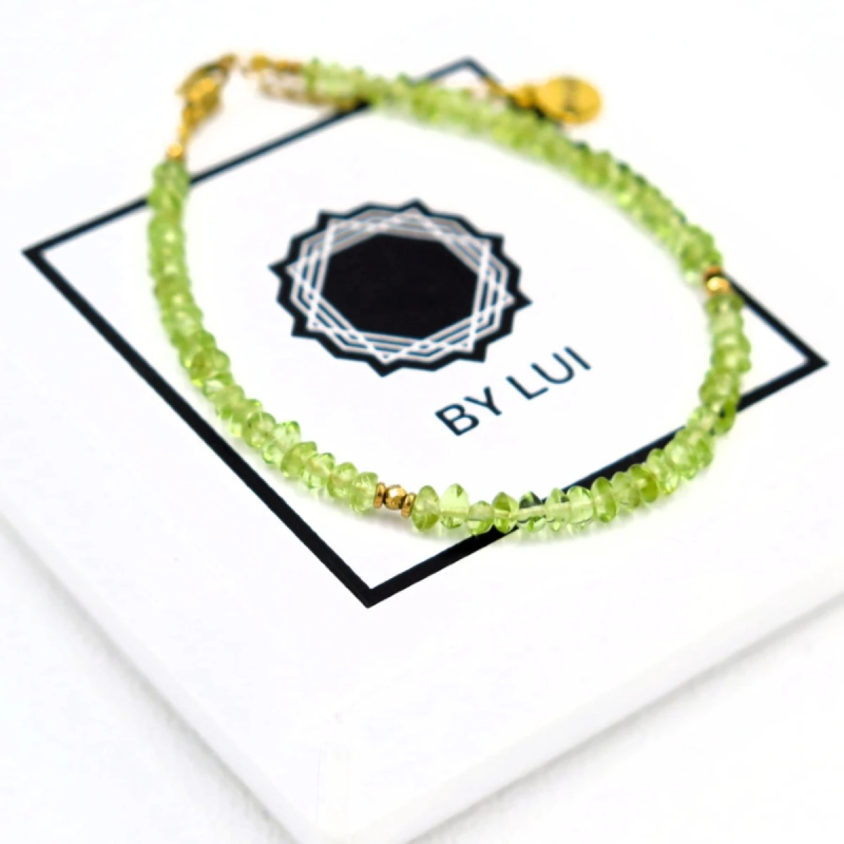 Bransoletka została wykonana z szlifowanych mini dysków kamieni oliwinu, które pięknie załamują światło, nadając biżuterii subtelny połysk. Delikatne złote akcenty- hematyty dodają jej szlachetności, a wygodne zapięcie sprawia, że noszenie jej jest czystą przyjemnością ( możliwość regulacji 16-20cm)