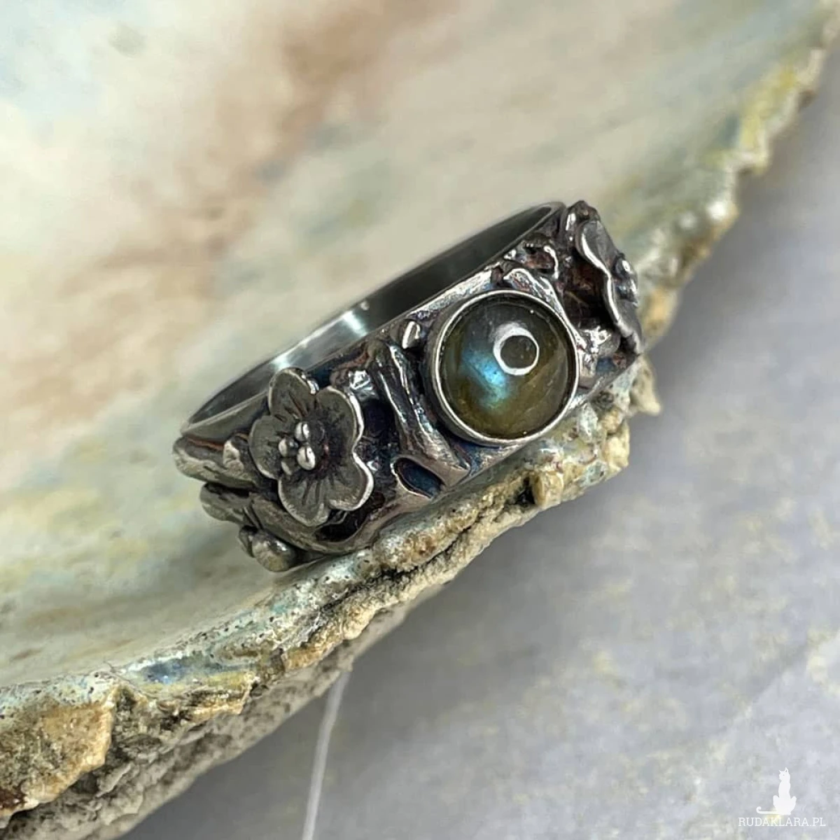 Srebrna obrączka z labradorytem to subtelna biżuteria inspirowana naturą, łącząca delikatność kwiatowych zdobień z hipnotyzującym blaskiem kamienia. Labradoryt, osadzony w ozdobnej oprawie, mieni się odcieniami błękitu i złota, przyciągając spojrzenia. Ręcznie wykonana ze srebra próby 925, czerniona i przecierana dla podkreślenia detali, stanowi wyjątkowy dodatek zarówno na co dzień, jak i na specjalne okazje.