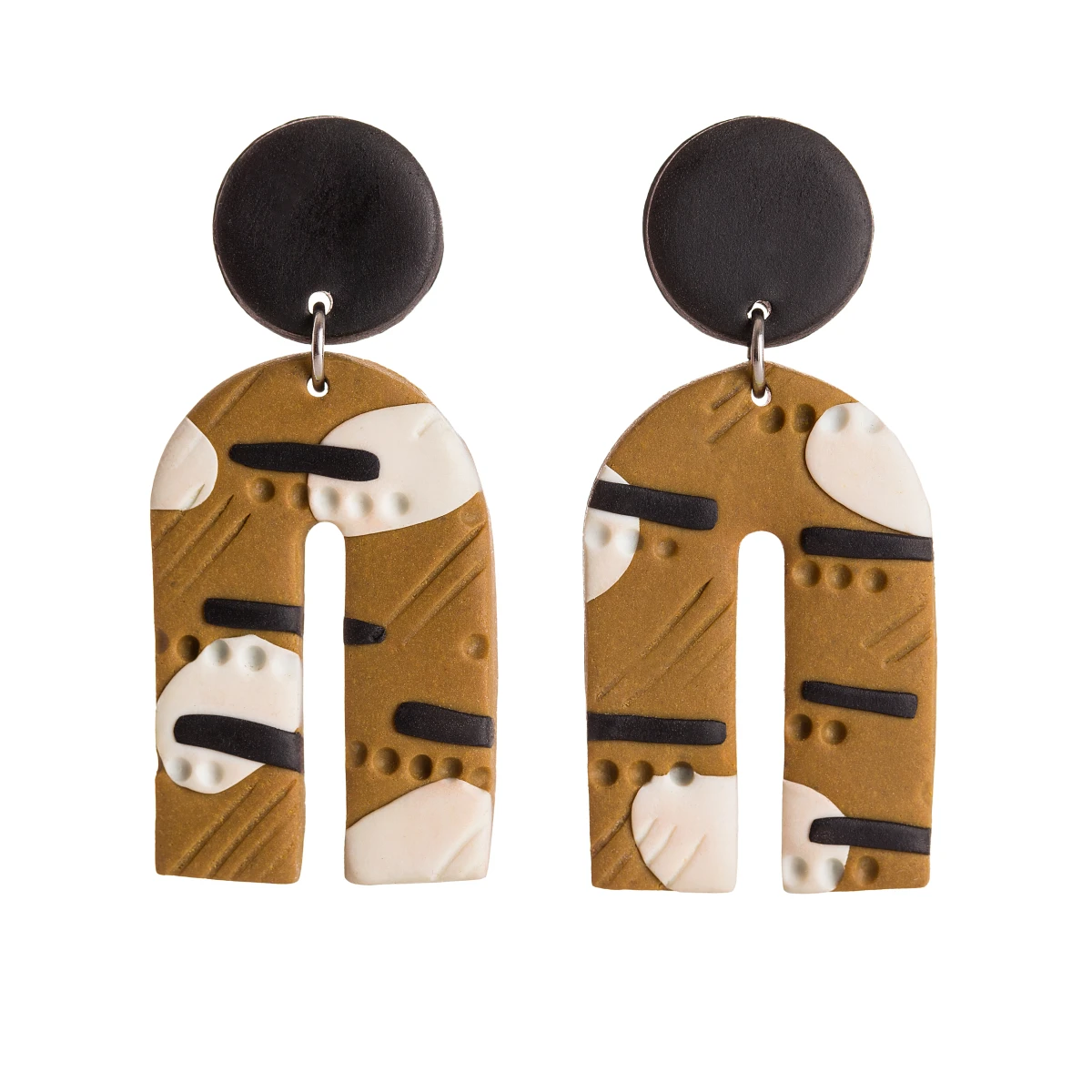 Ręcznie wykonane kolczyki łuki z unikatowymi, abstrakcyjnymi i nieregularnymi wzorami. Kompozycja trzech kolorów: karmelowego/camel, czarnego i białego.