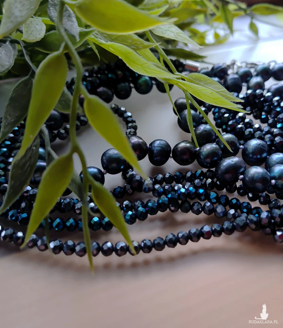 Naszyjnik z pięknych, dużych pereł w grafitowo granatowym kolorze. Perła regularna 8 mm, drugi odrębny naszyjnik z korali szklanych kryształków 4 mm, dobrane kolorami sznury tworzą duży naszyjnik, ale mozna je nosić oddzielnie. , długość 25 cm, szkło, perła hodowlana, sznurek syntetyczny, metal, stal