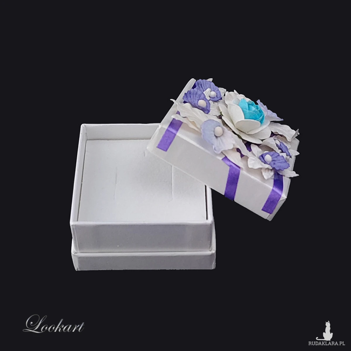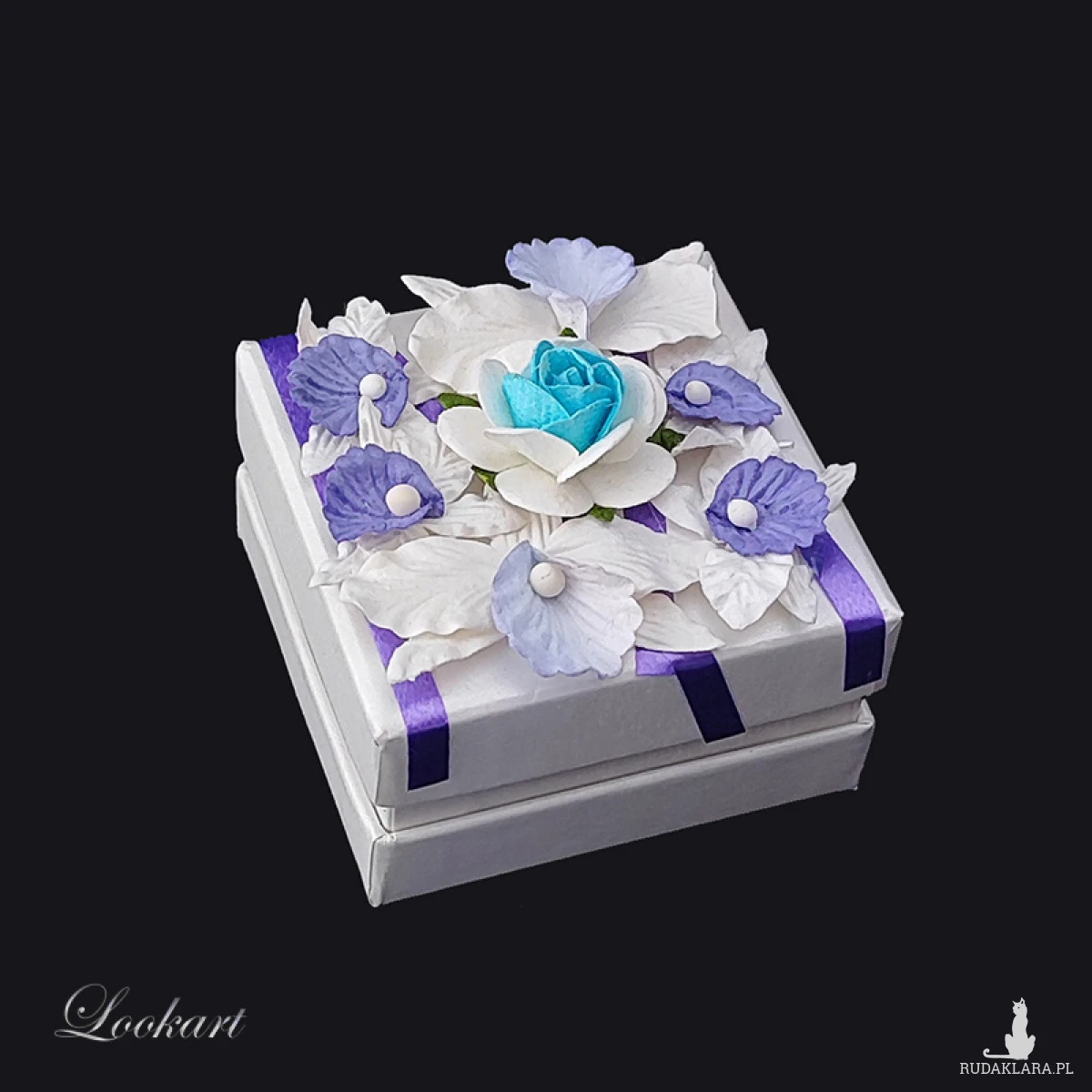 Zostało ręcznie ozdobione papierowymi kwiatami. Kompozycja na wieczku przyciąga wzrok i nadaje pudełku wyjątkowego charakteru.