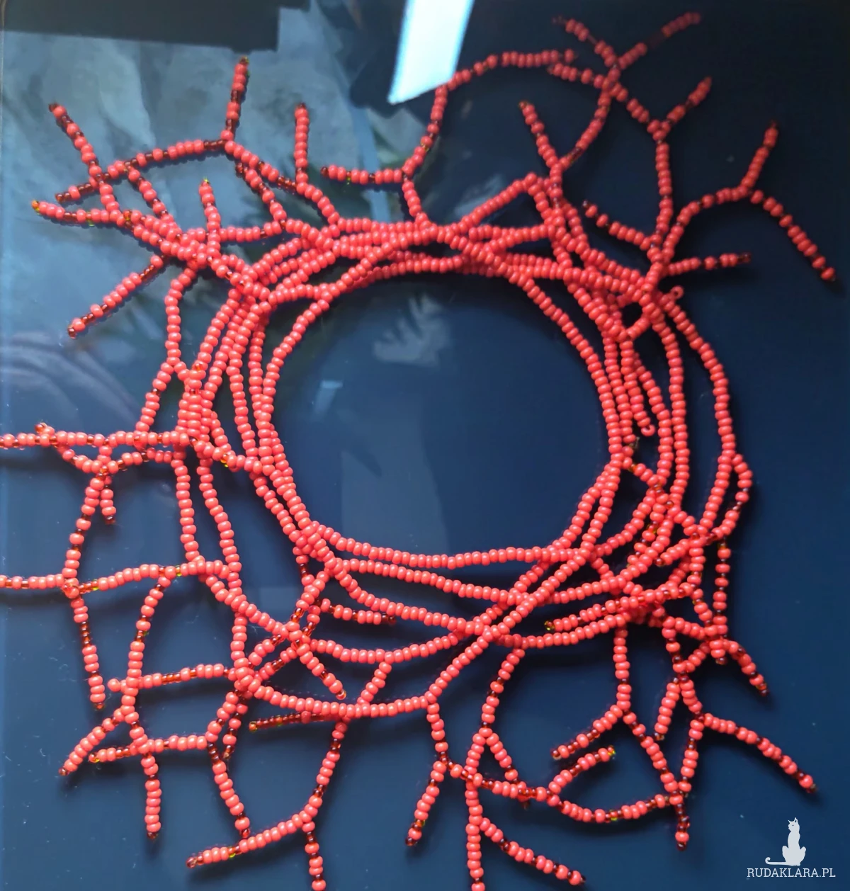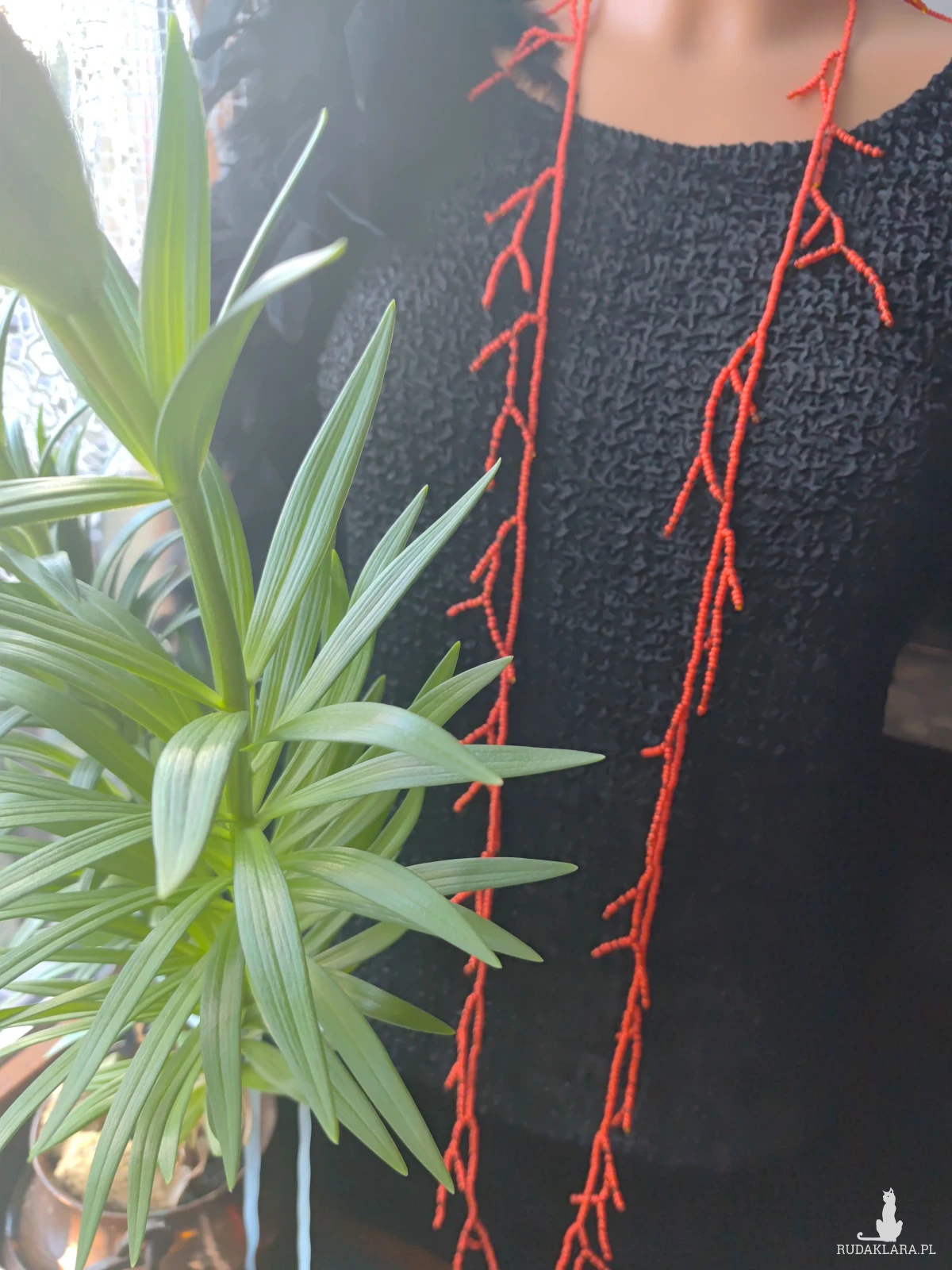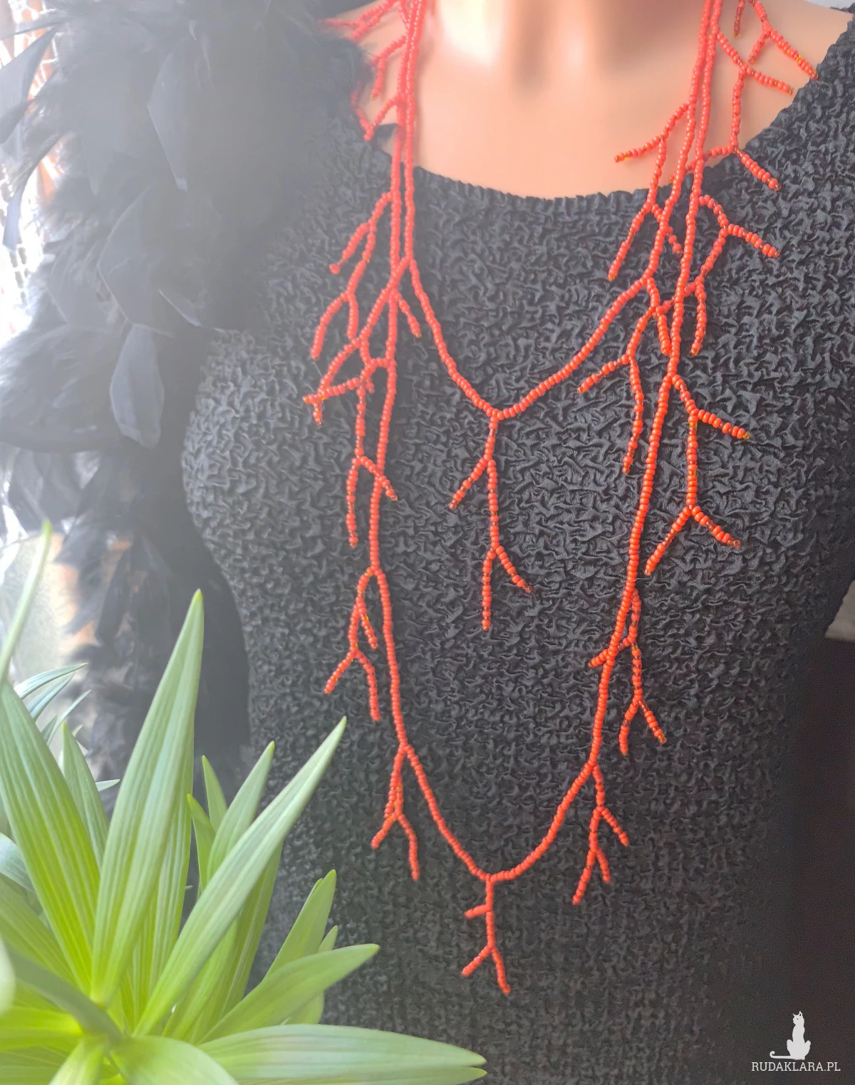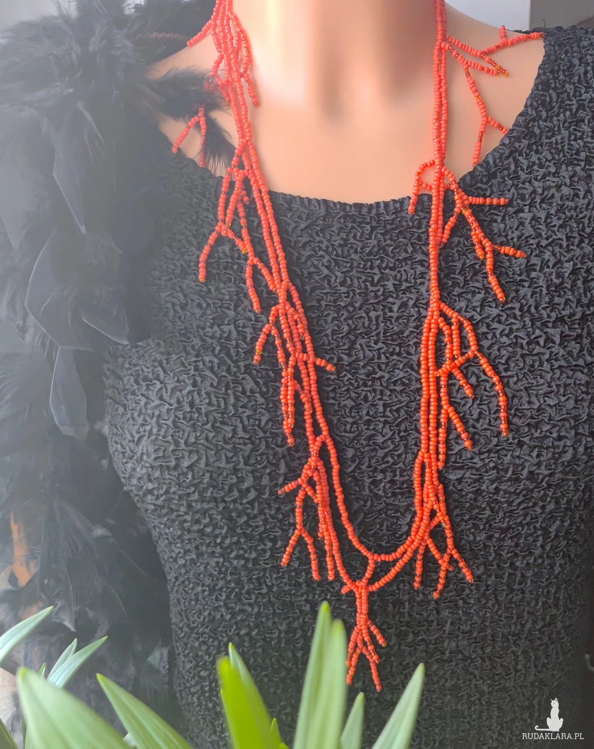 Naszyjnik bardzo długi ręcznie wypleciony, gałązki z pomarańczowych drobnych koralików. Można owinąć trzykrotnie wokół szyi. Długość 77 cm