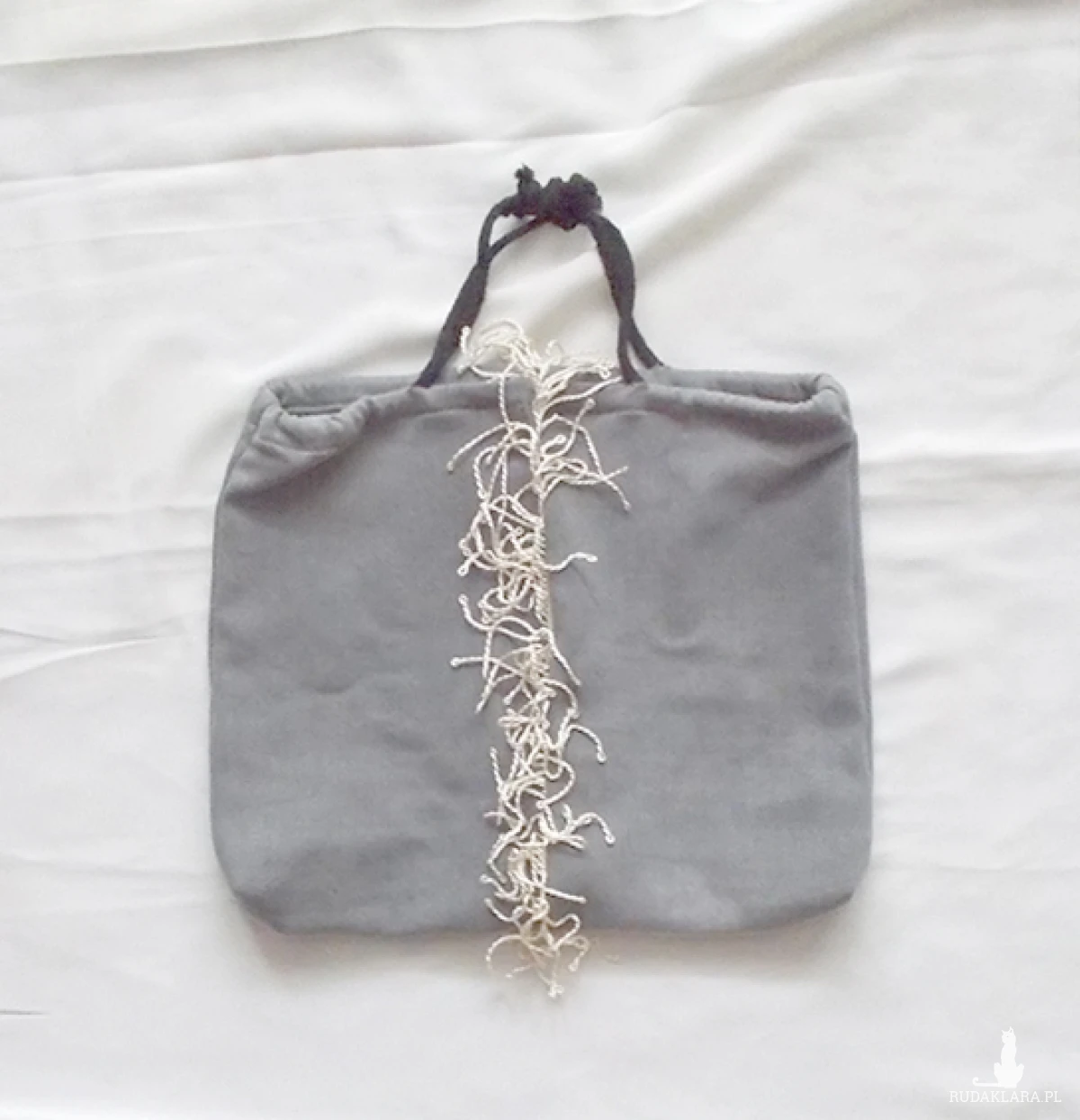 Wymiary: wysokość: 30 cm, szerokość 35 cm, uszka 12 cm. Eko torba na zakupy, zmieści format A4, torba z szarego dżinsu, może być także noszona do szkoły na strój do wf, na obuwie zmienne, na drobiazgi itp. Prać w 40 stopniach.