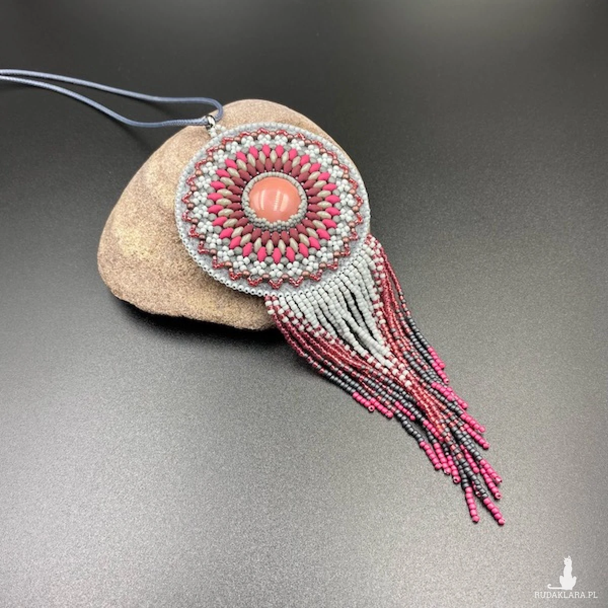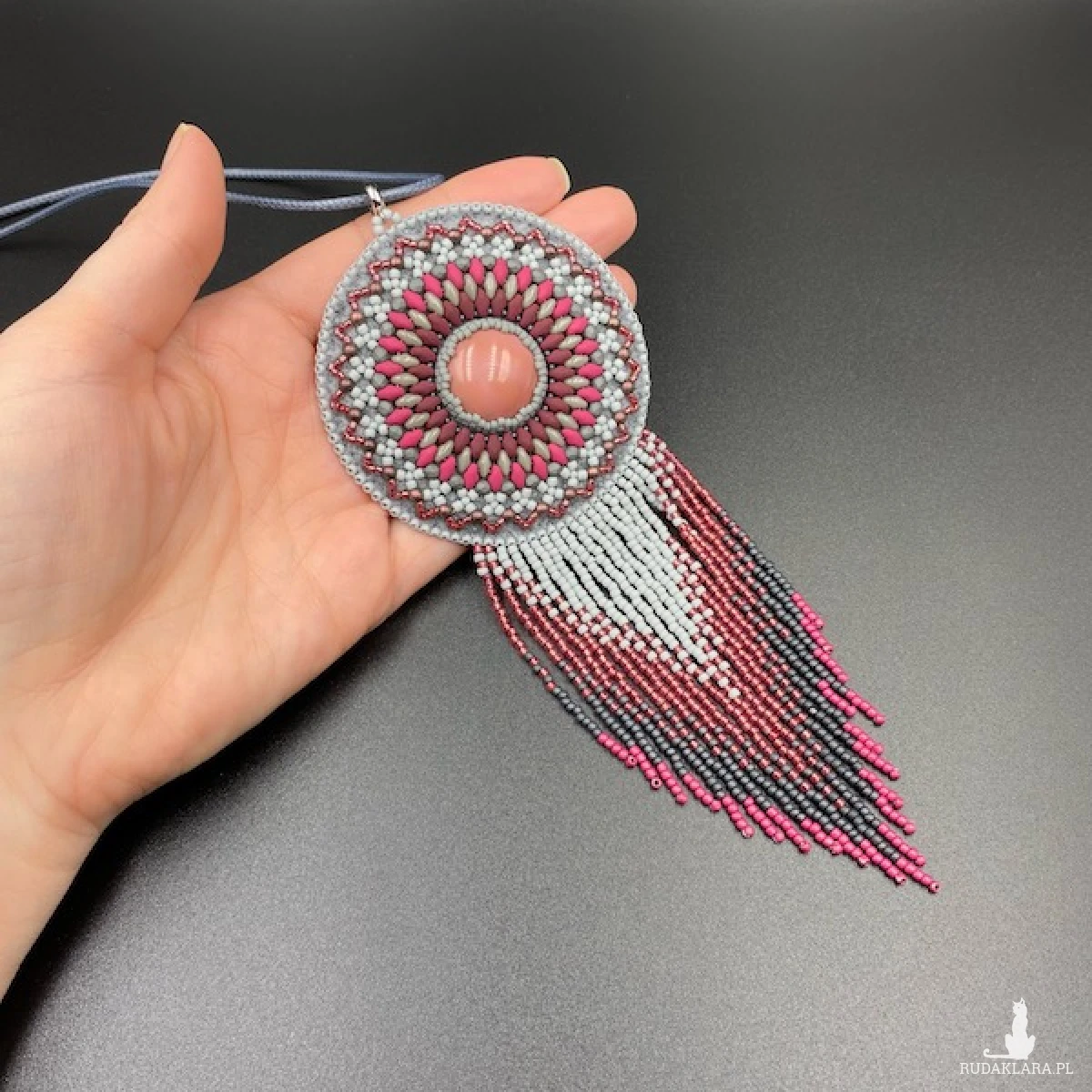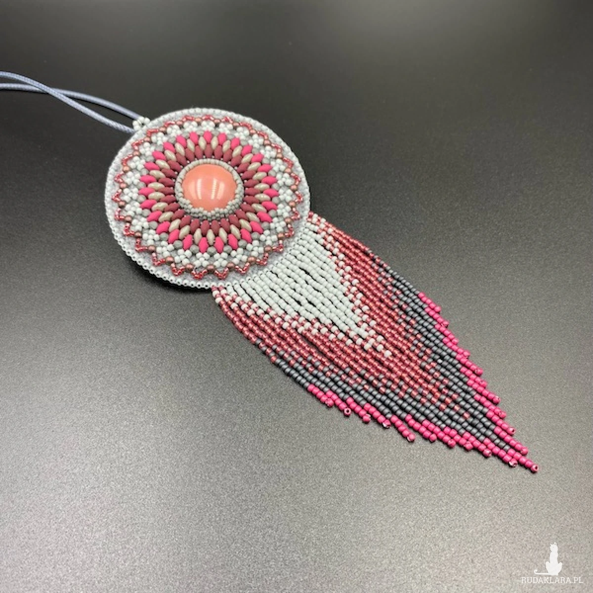 Medalion został wykonany techniką haftu koralikowego w kolorze szarym, stalowym, burgundowym, malinowym, różowym. Jego centrum to szklany kaboszon 20 mm, opleciony koralikami Toho, Fire Polish, SuperDuo. Całość zakończona ozdobnymi frędzelkami z efektem cieniowania. Medalion zawieszony został na sznurku lakierowanym w kolorze ciemno szarym. Tył podszyty szarą eko skórką. Elementy metalowe ze stali chirurgicznej.