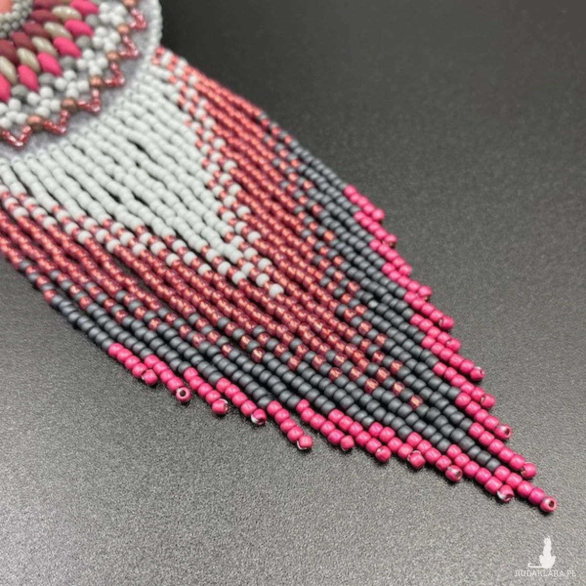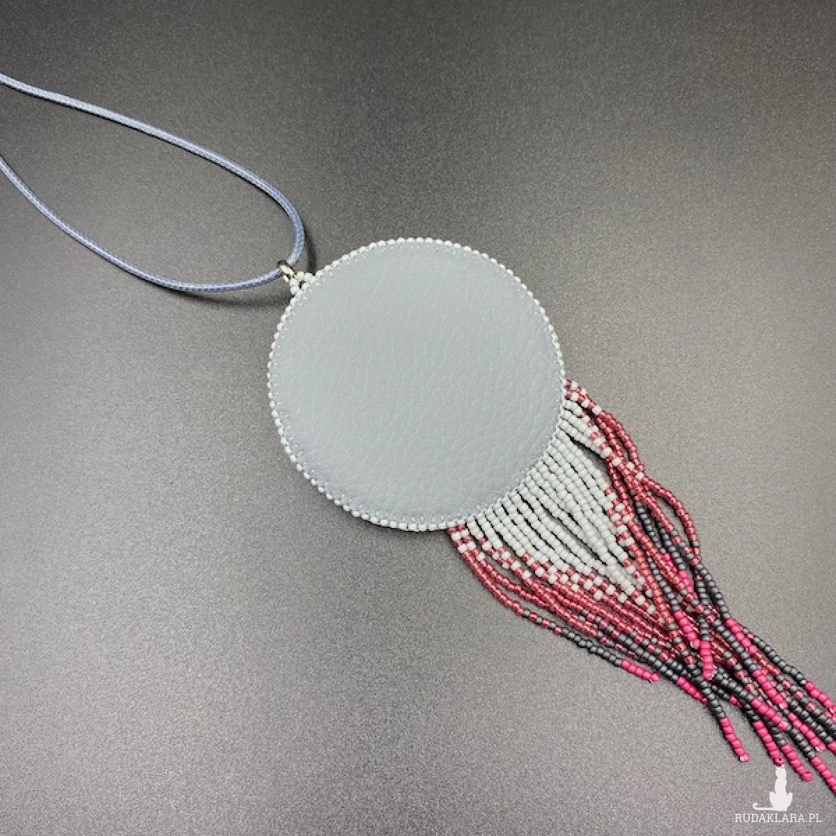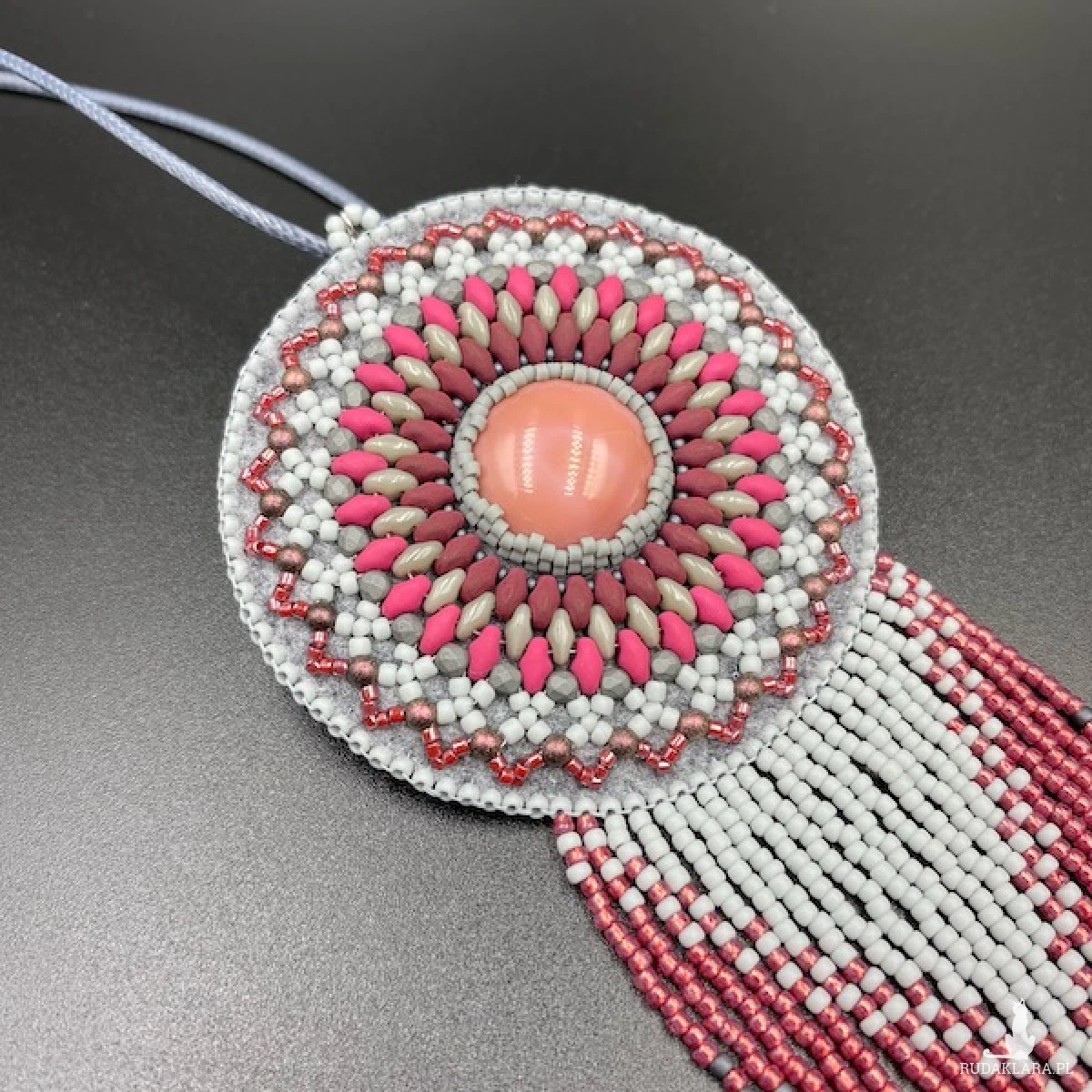 Medalion został wykonany techniką haftu koralikowego w kolorze szarym, stalowym, burgundowym, malinowym, różowym. Jego centrum to szklany kaboszon 20 mm, opleciony koralikami Toho, Fire Polish, SuperDuo. Całość zakończona ozdobnymi frędzelkami z efektem cieniowania. Medalion zawieszony został na sznurku lakierowanym w kolorze ciemno szarym. Tył podszyty szarą eko skórką. Elementy metalowe ze stali chirurgicznej.