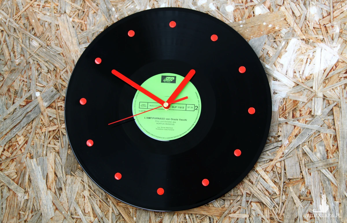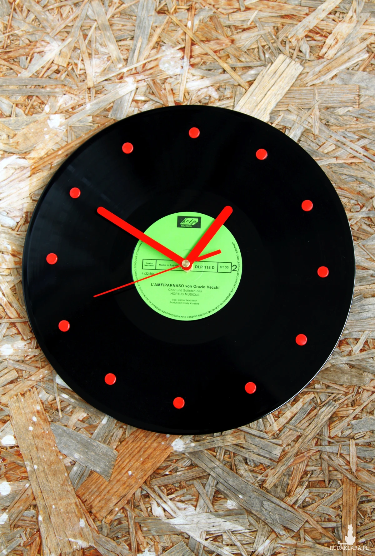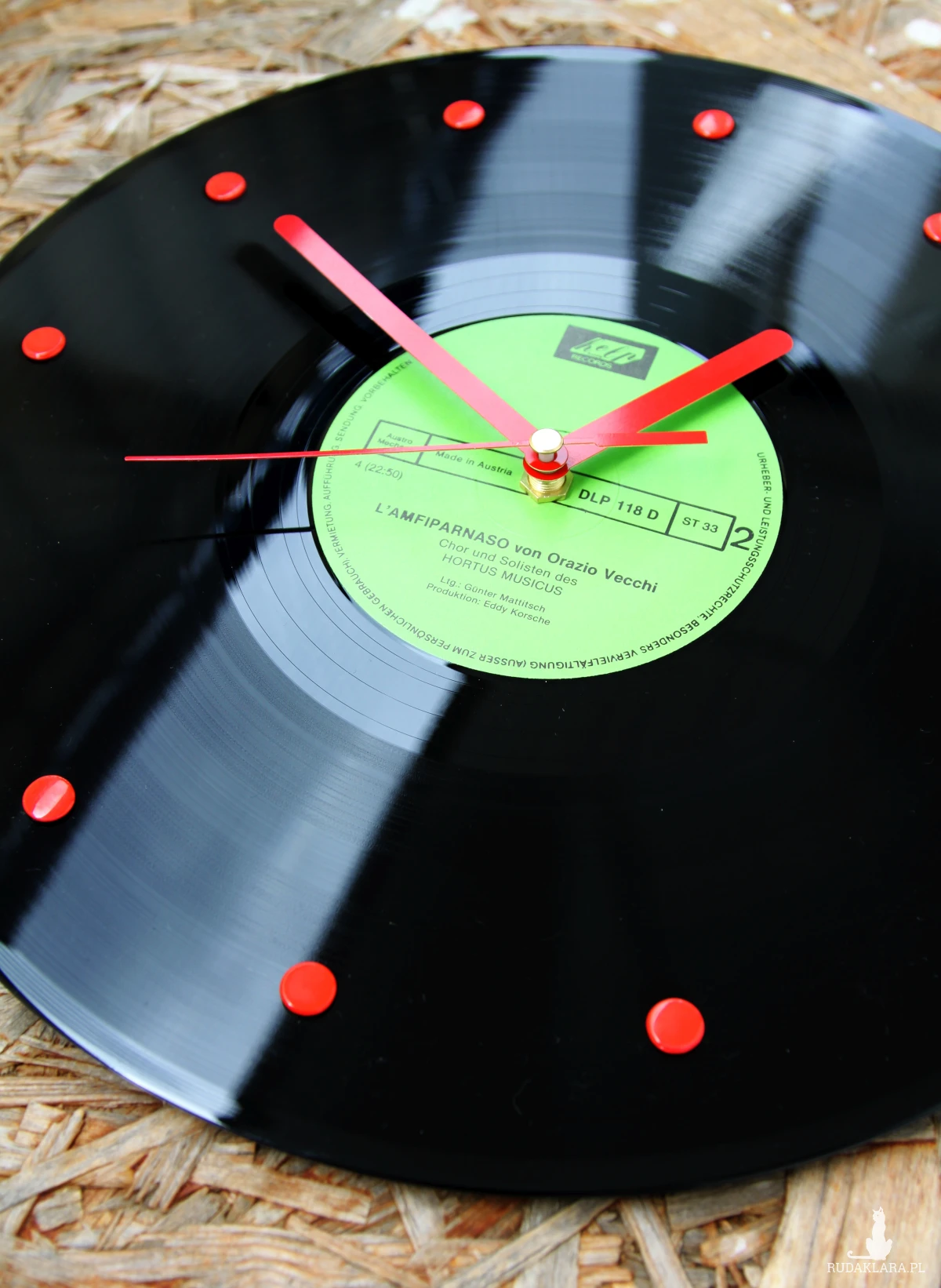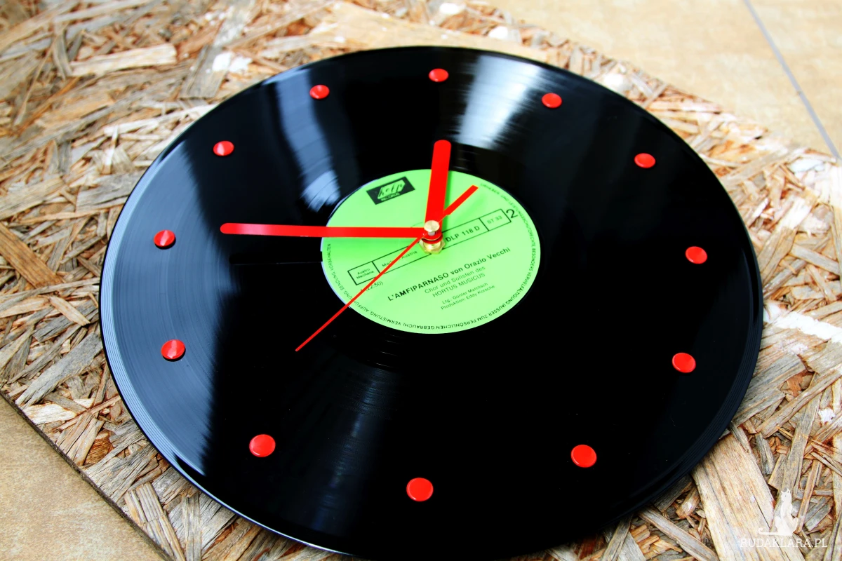 Muzyczny zegar wykonany z prawdziwej płyty winylowej pochodzącej z rodzinnej kolekcji. Wielka gratka dla melomanów oraz wielbicieli winyli!