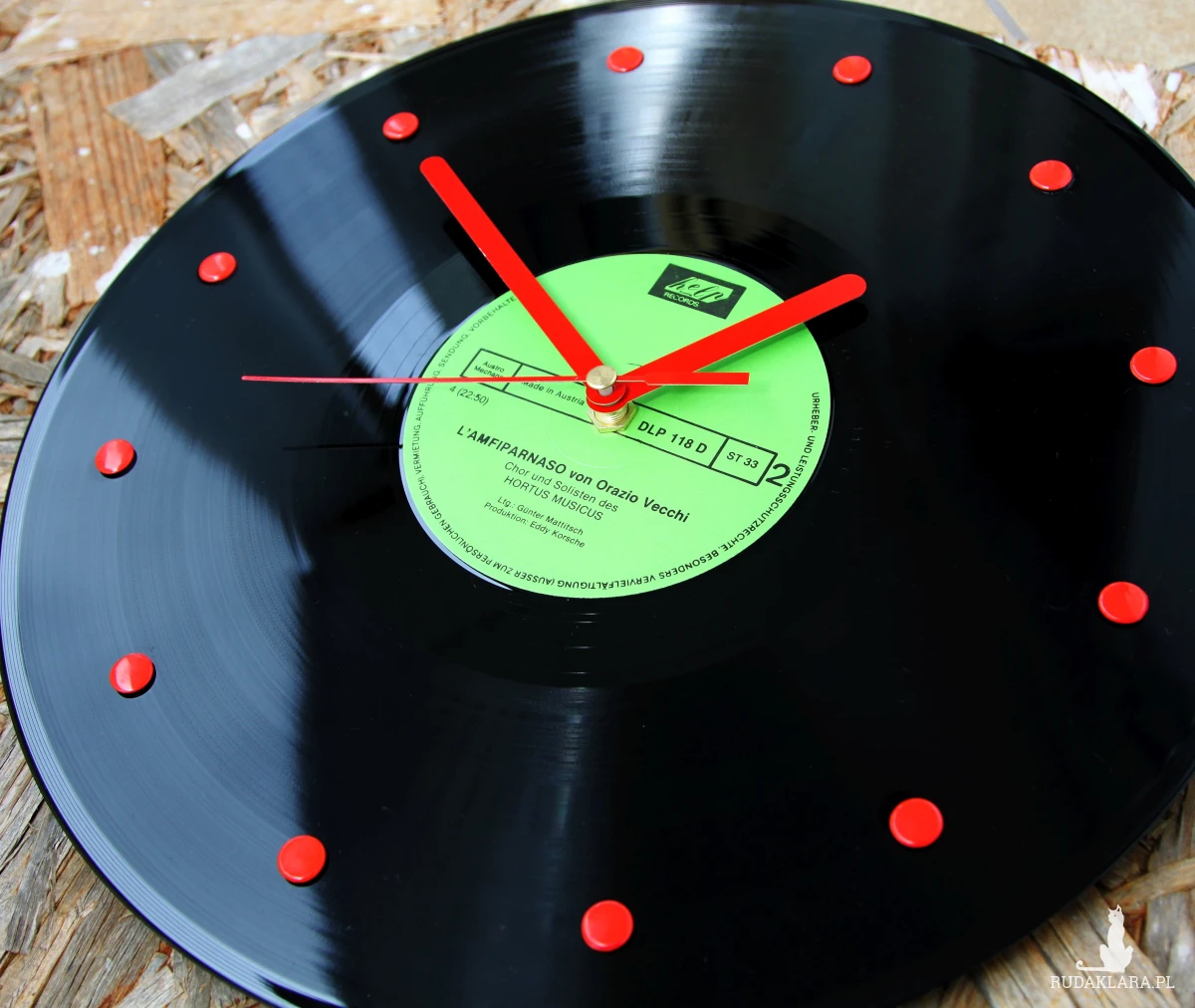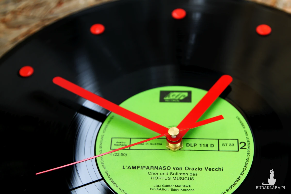 Etykieta płyty winylowej ma kolor jasnozielony. Zegar posiada czerwone wskazówki oraz czerwone znaczniki poszczególnych godzin.