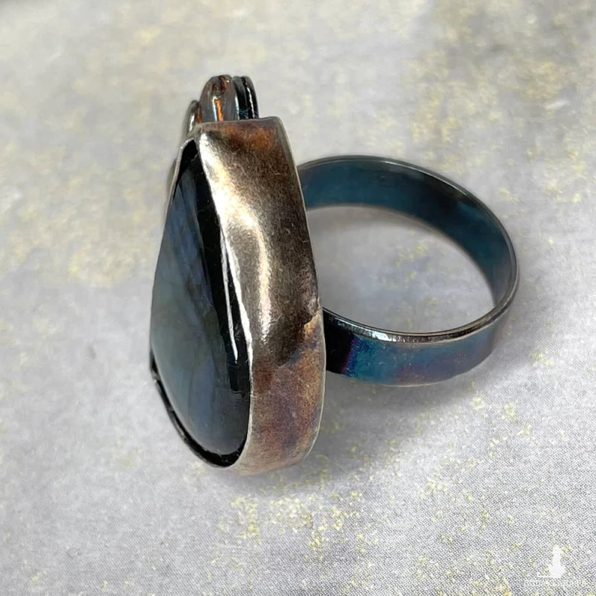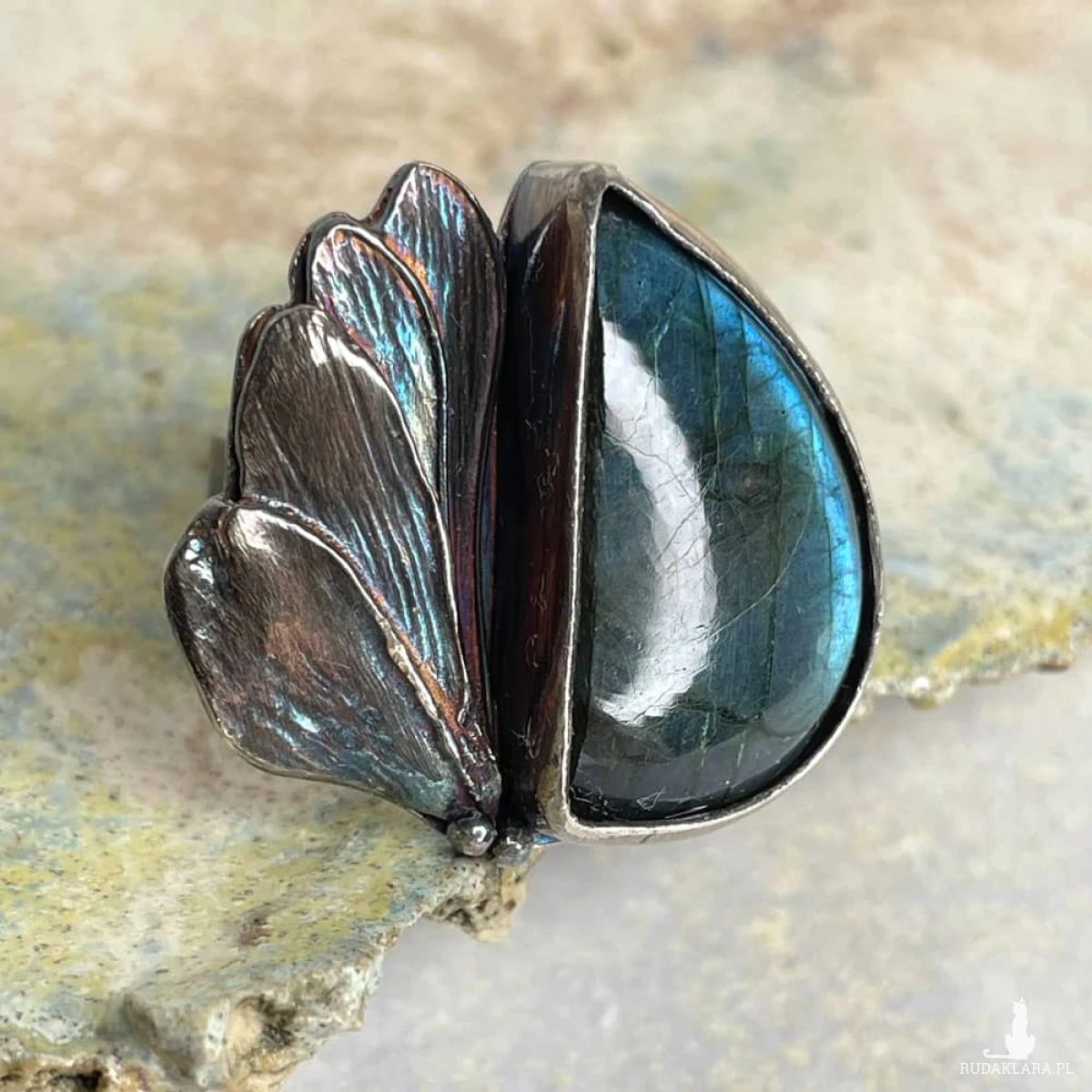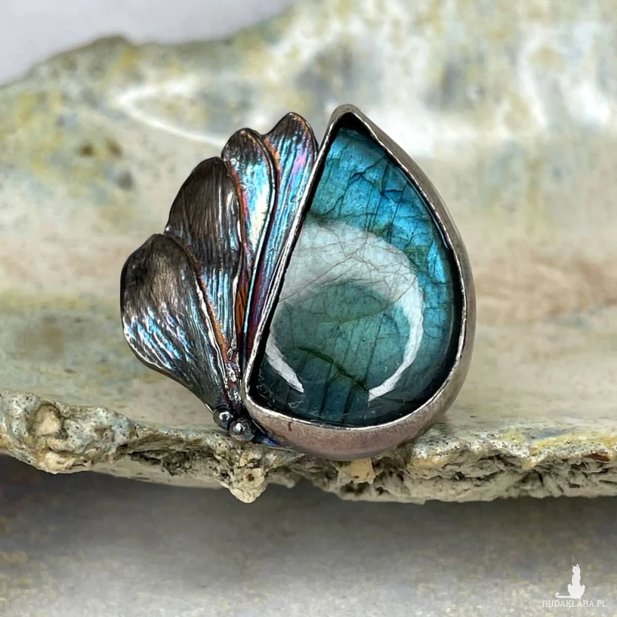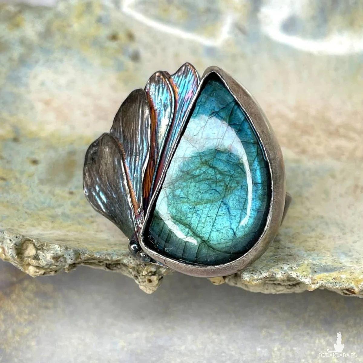 Labradoryt o magnetycznym blasku błękitu i turkusu przywodzi na myśl morską głębię rozświetloną srebrzystym światłem księżyca. Jego niezwykła gra barw została podkreślona srebrną oprawą o organicznej, falistej formie inspirowanej naturą. Oksydowane i przecierane detale nadają pierścionkowi artystycznego wyrazu, czyniąc go wyjątkowym dodatkiem dla miłośniczek biżuterii z charakterem. Pierścionek został wykonany w autorskiej pracowni Artseko z najwyższą dbałością o detale.