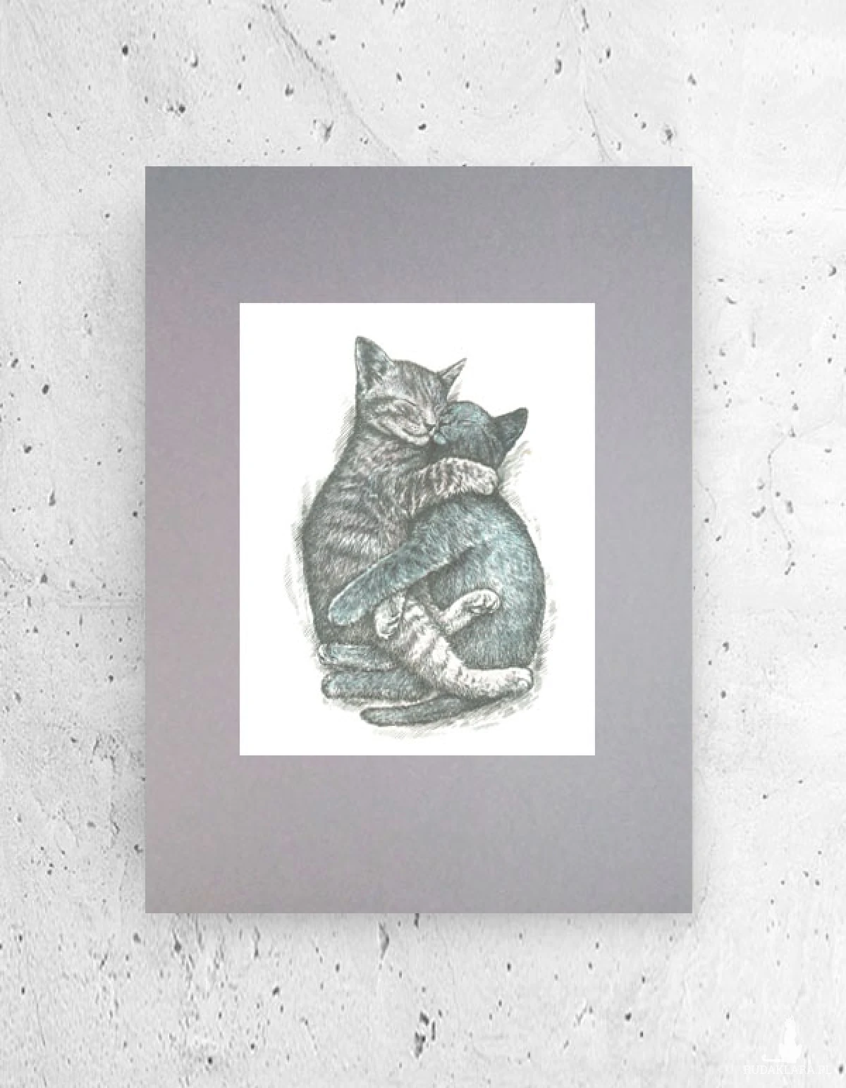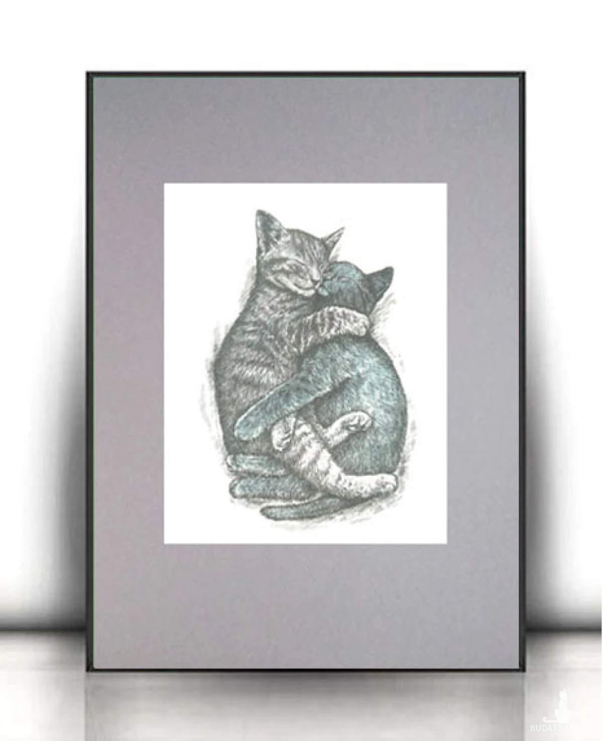 Nowy plakat w stylu retro. Obrazek z dwoma kotkami na szarym kartoniku 21 x 30 cm. Poster wystarczy tylko umieścić w ramce A4. Grafika na ścianę do sypialni, salonu, przedpokoju, jadalni, pokoju młodzieżowego lub dziecięcego, biura, gabinetu, holu, kawiarni, restauracji, hotelu itp. Obrazek będzie pasował do każdego stylu urządzania wnętrz.