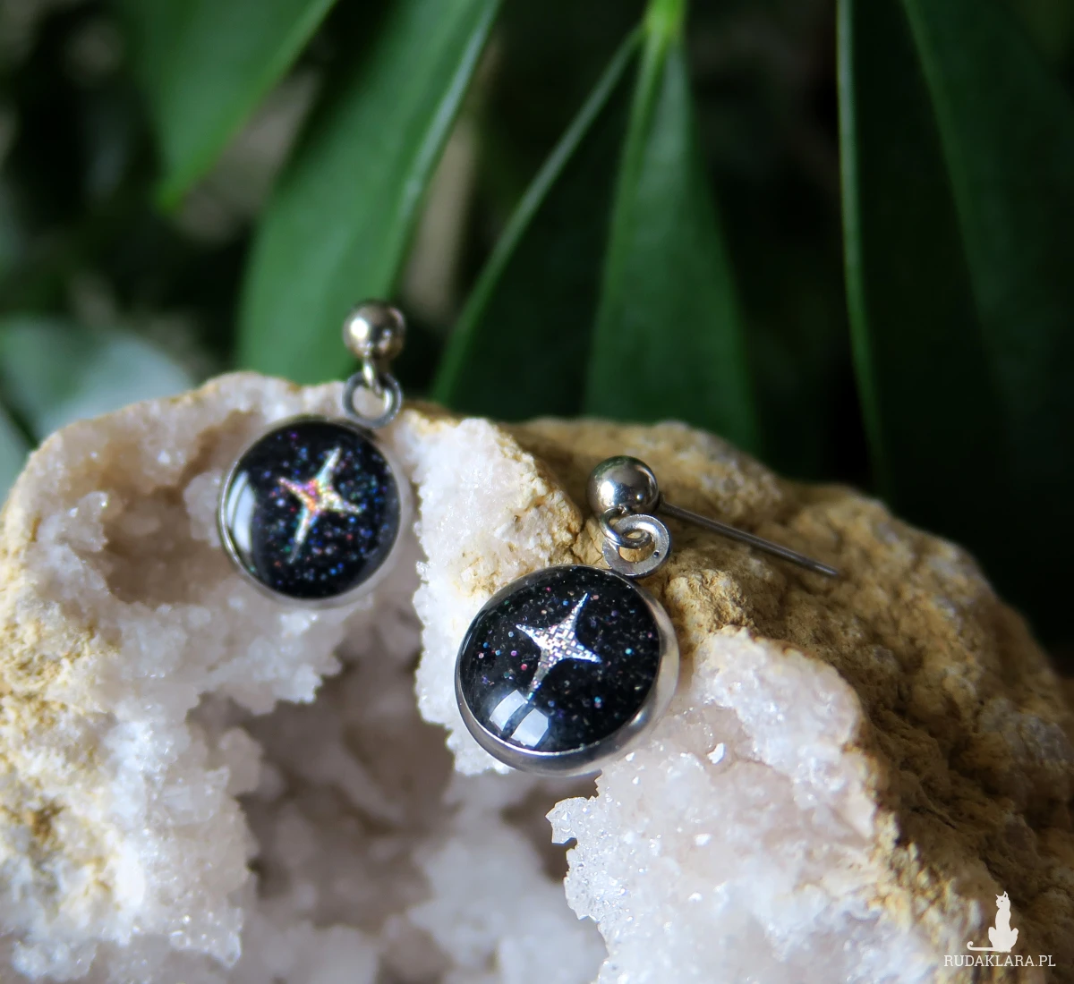 Piękne wiszące kolczyki z brokatowymi gwiazdkami na czarnym brokatowym tle.