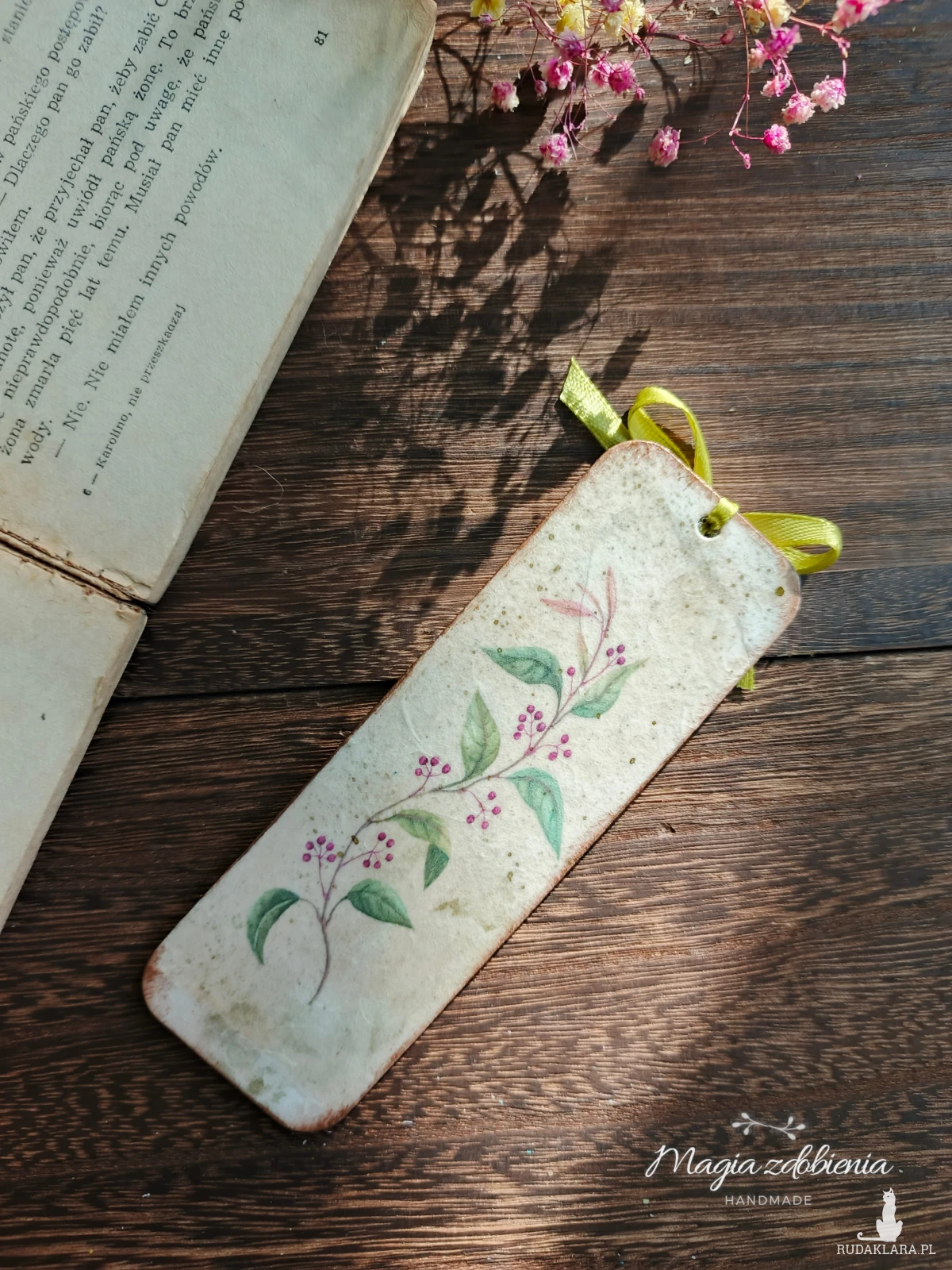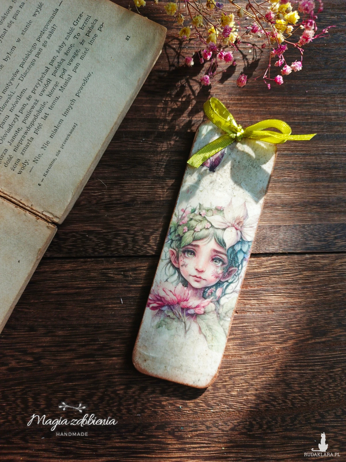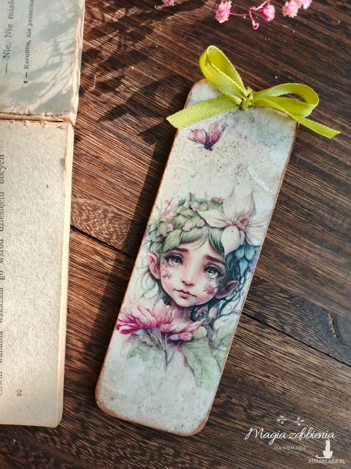 Drewniana zakładka do książki, zdobiona techniką Decoupage. Grafika - papier ryżowy po obu stronach zakładki. Kilkakrotnie lakierowana ( mat ). Wymiary: 14,5x4,5cm.