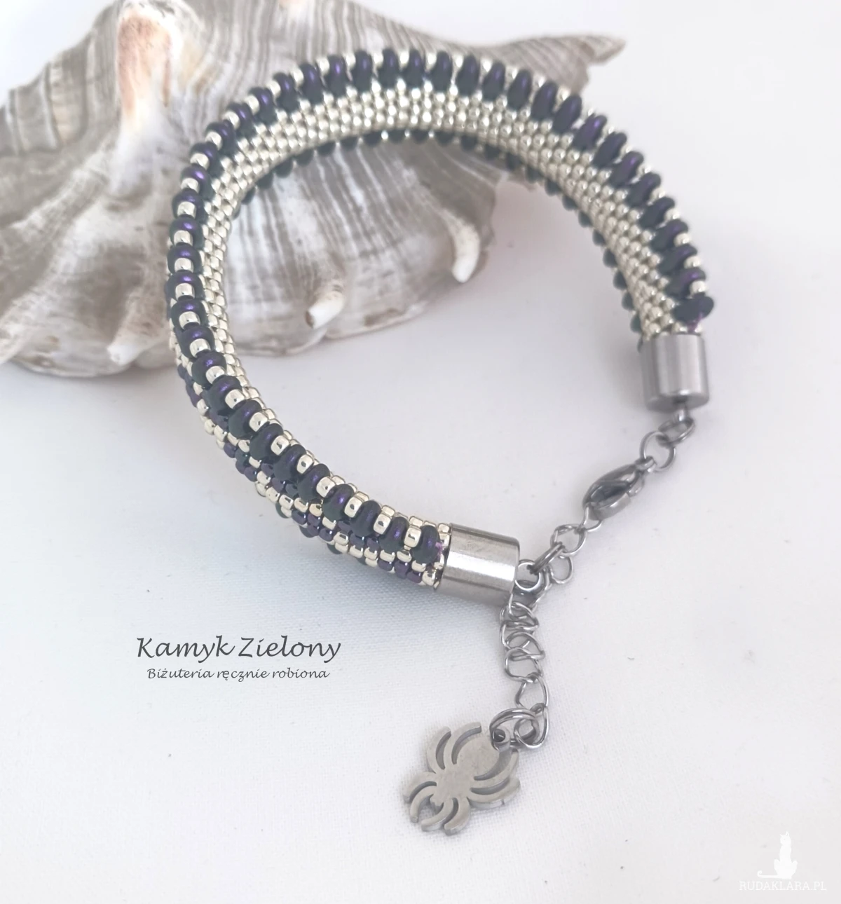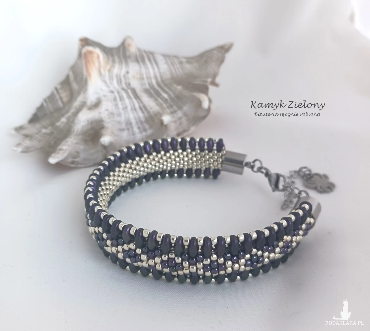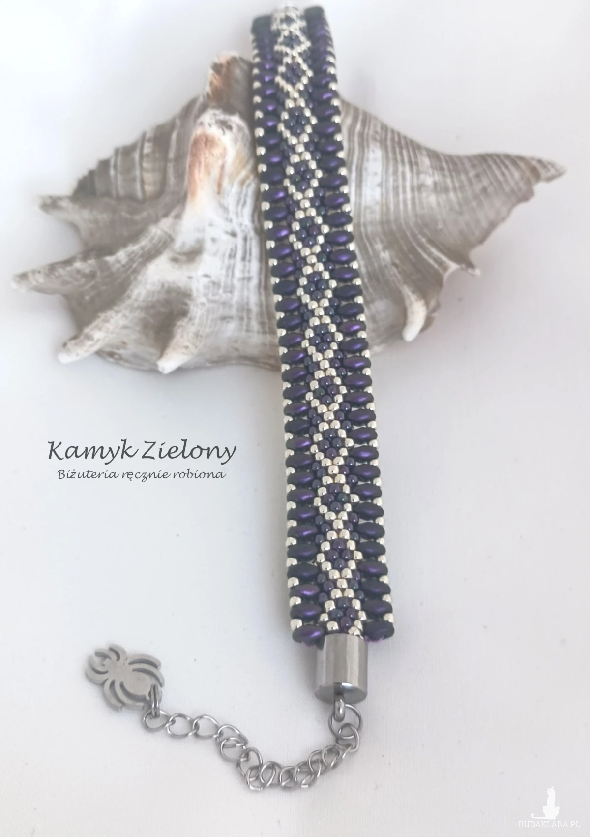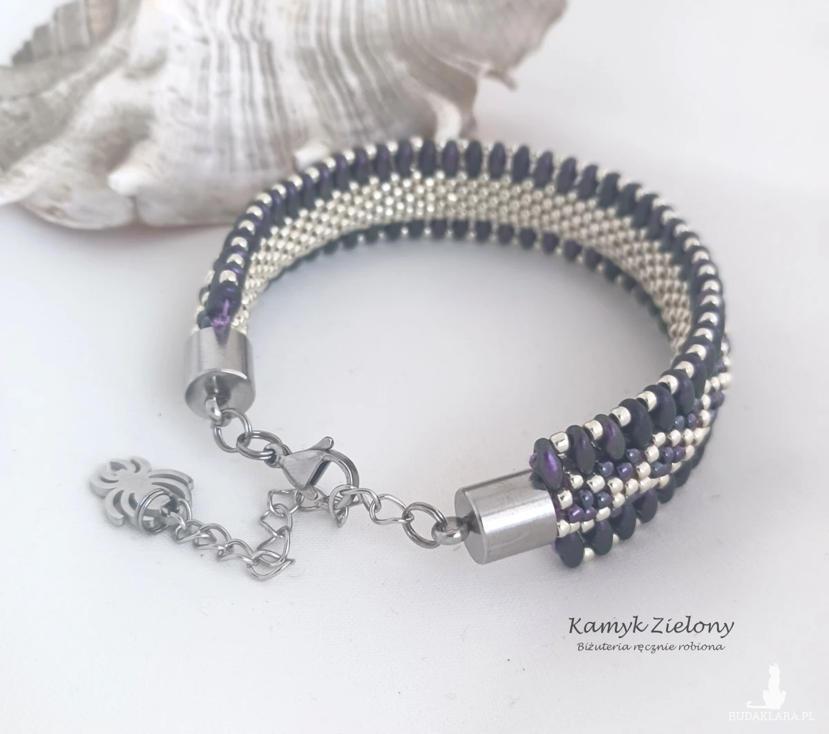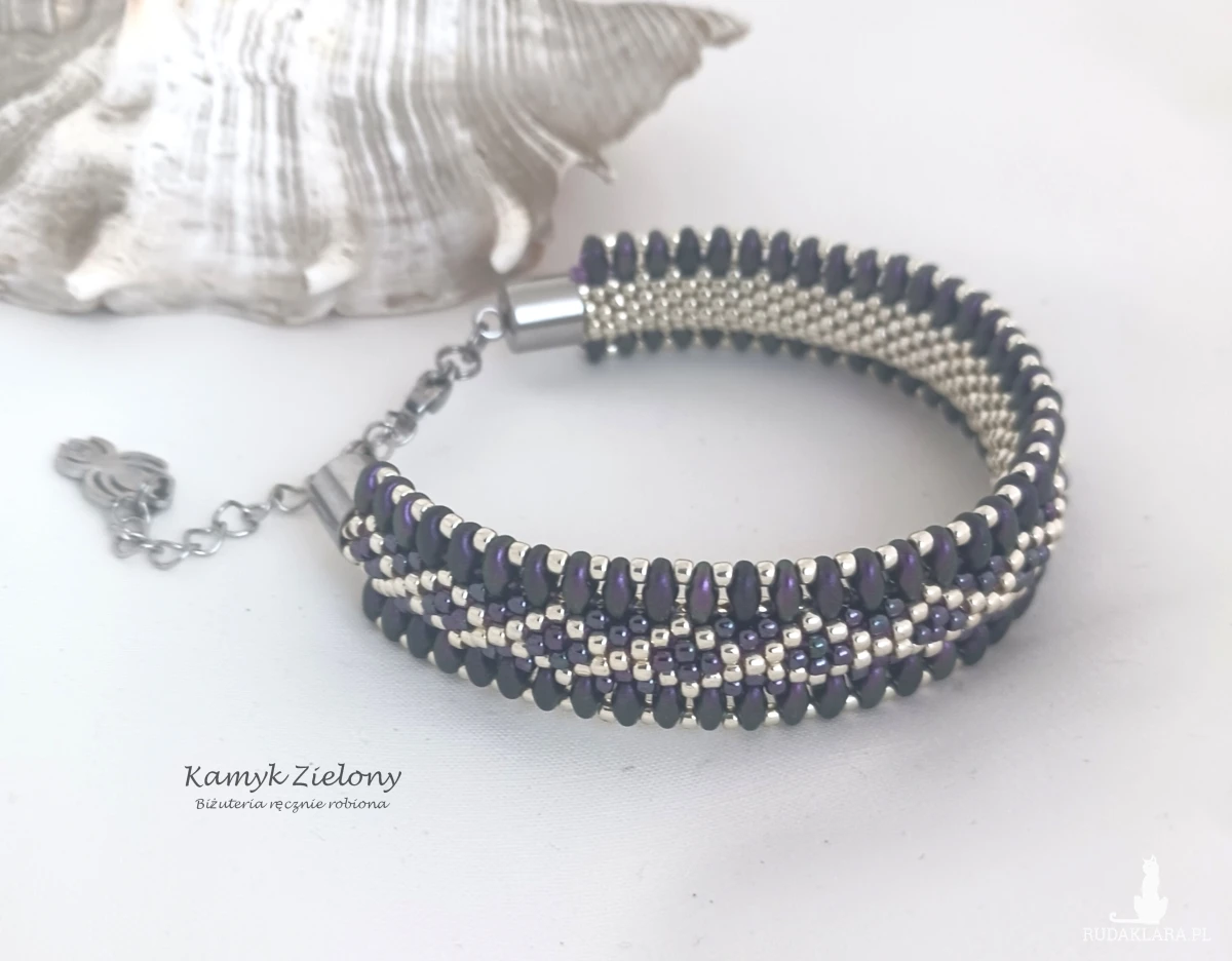 Dwustronna bransoletka o płaskim kształcie wykonana z wysokiej jakości szklanych koralików Toho w srebrnym i fioletowym kolorze oraz umieszczonych na brzegach koralików SuperDuo w kolorze ciemnego fioletu o satynowym wykończeniu.