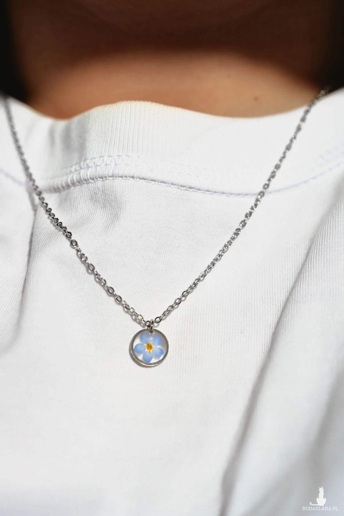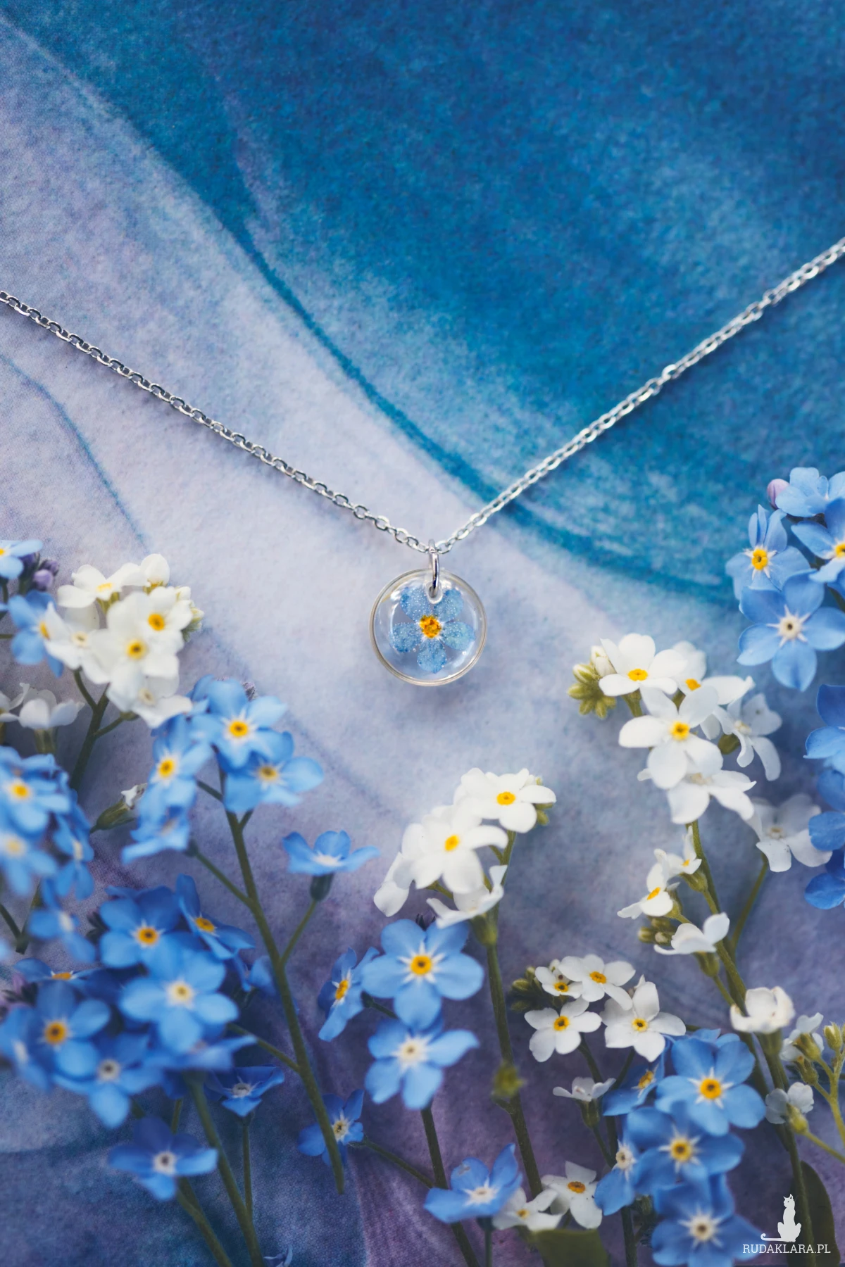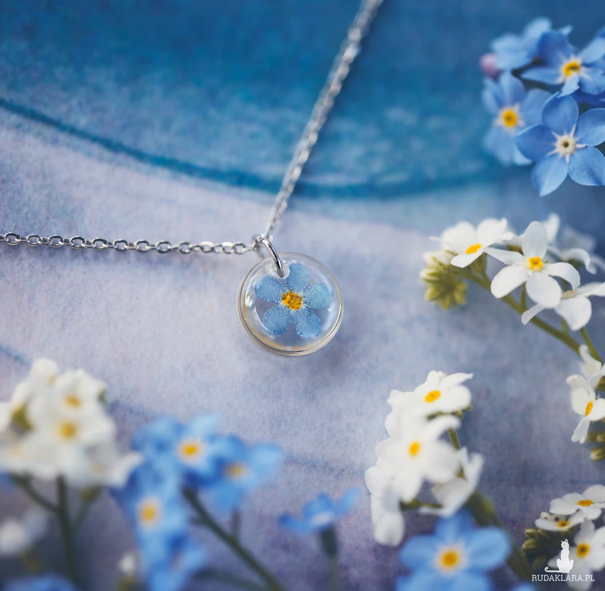 Naszyjnik z prawdziwymi kwiatami to niepowtarzalny prezent o oryginalnym kształcie, który zachwyci każdego! Biżuteria wykonana jest z wysokiej jakości żywicy epoksydowej, odpornej na działanie promieni UV, oraz dodatków ze stali chirurgicznej. W środku naszyjnika znajduje się zasuszony przeze mnie kwiat niezapominajki polskiej, symbolizujący pamięć i wierność.