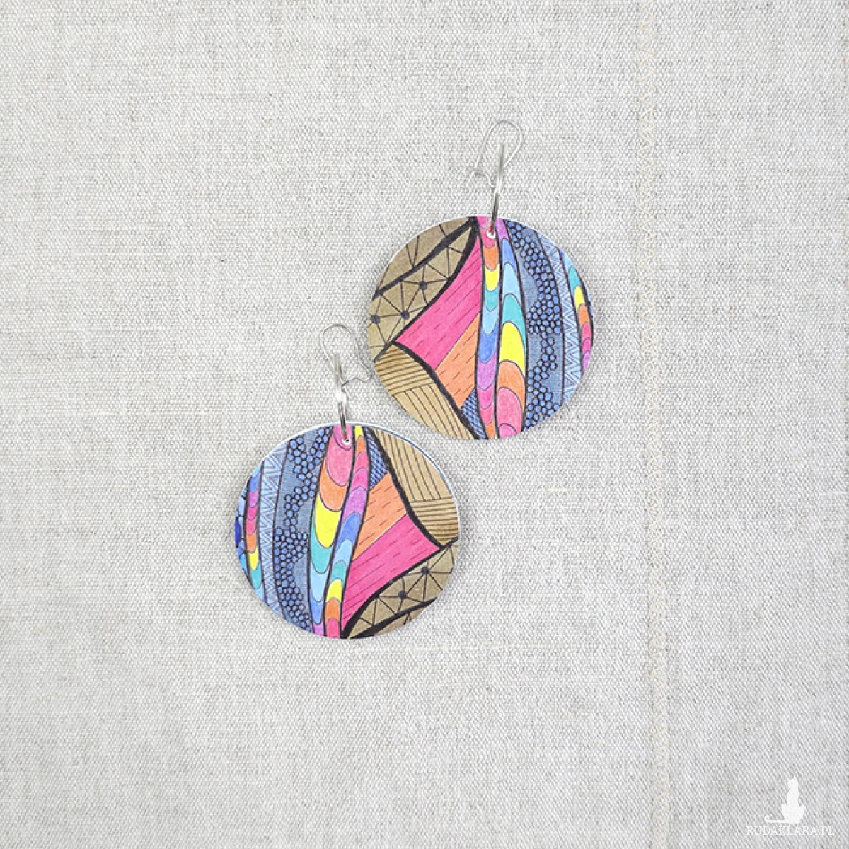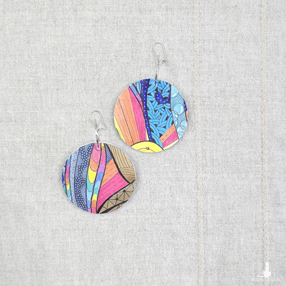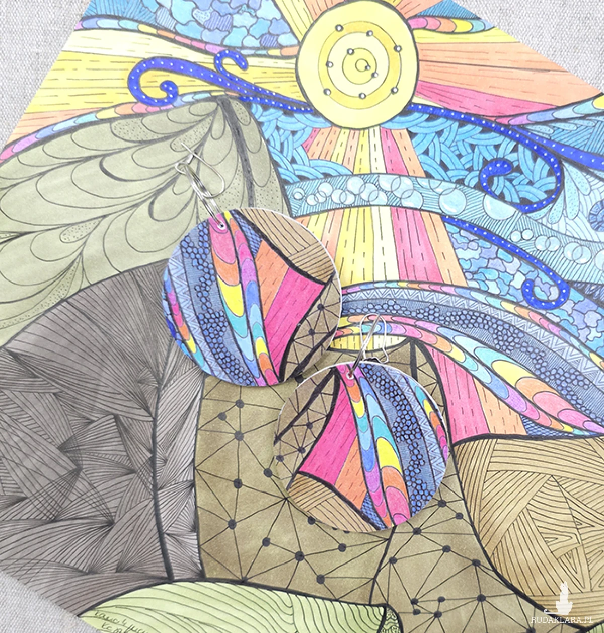 Kolczyki wykonane z drewnianej bazy oraz części mojego autorskiego rysunku "Pogoda w kratkę".