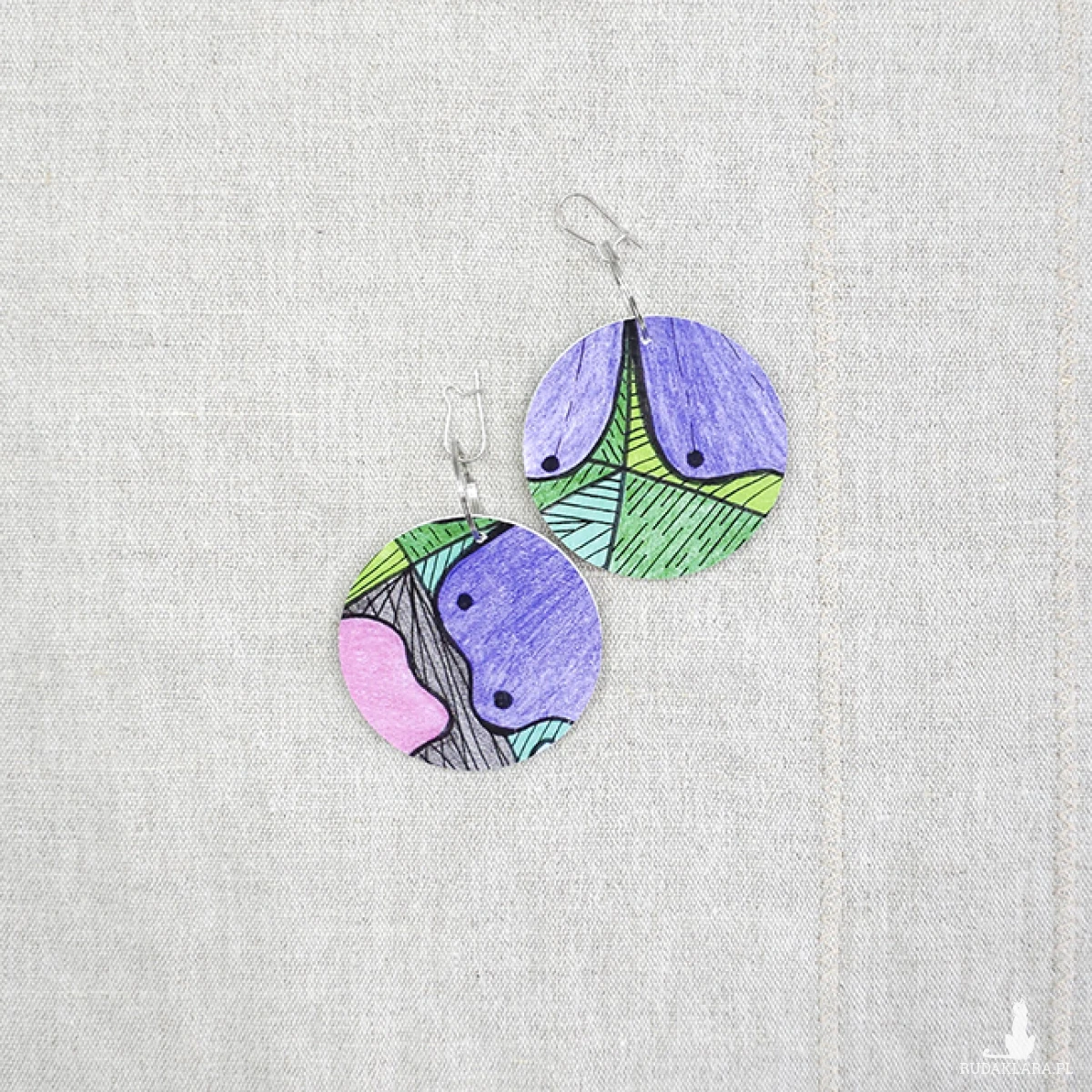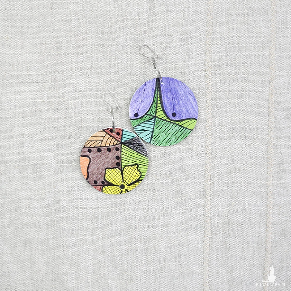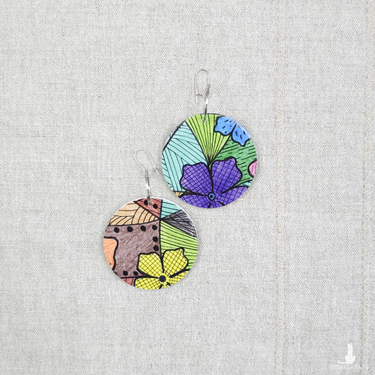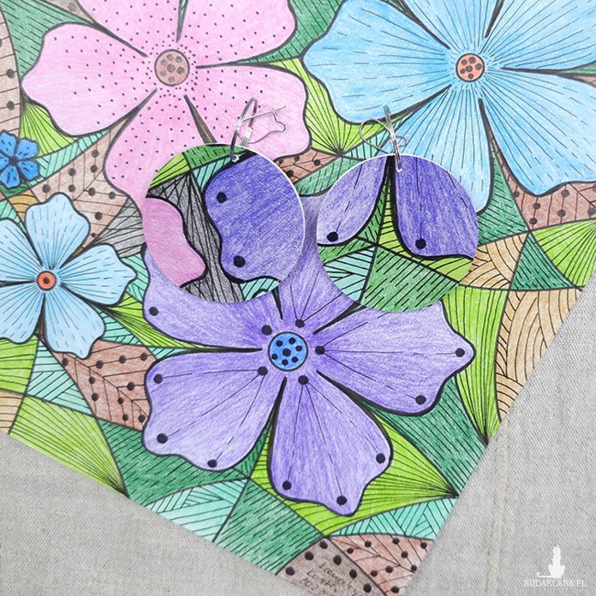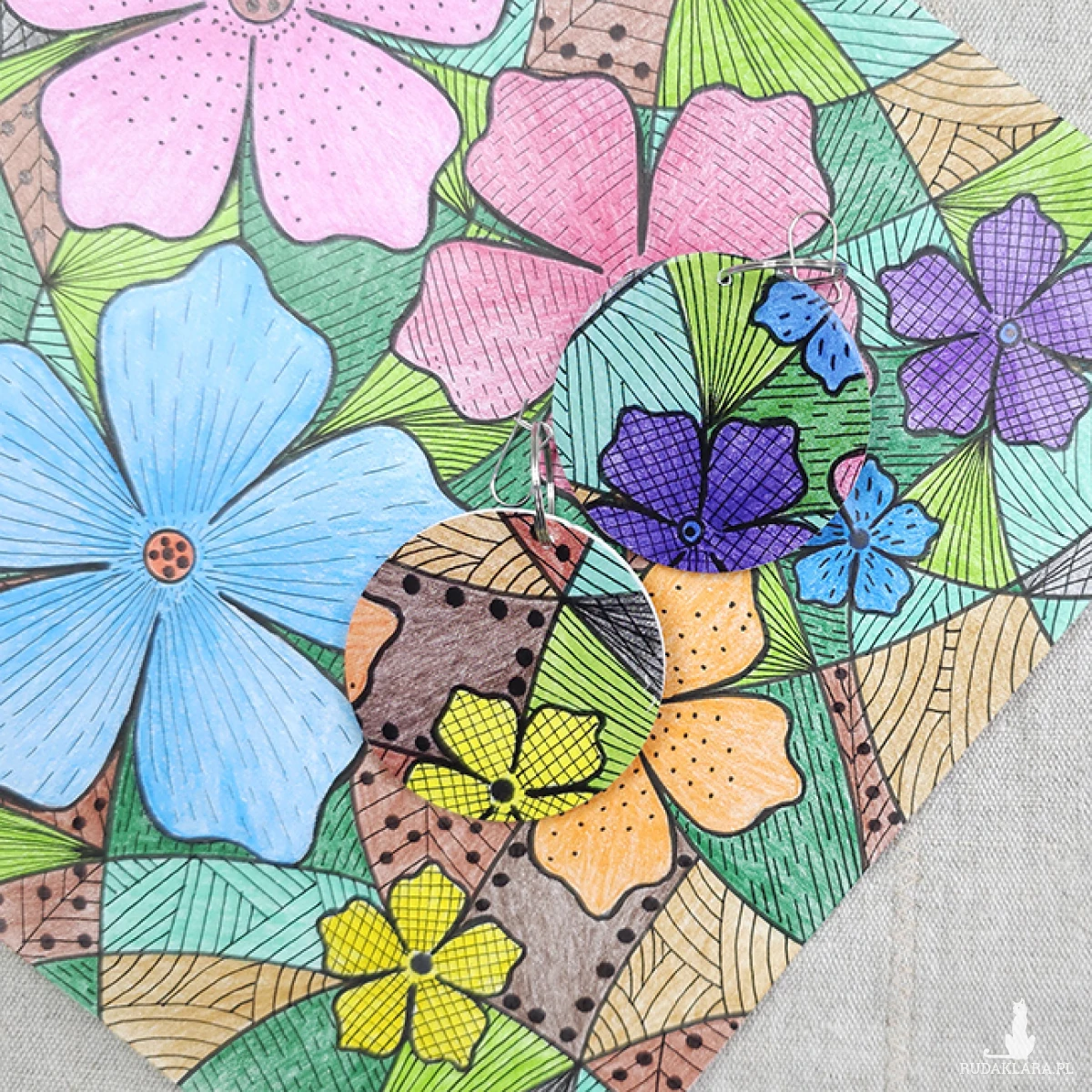 Kolczyki wykonane z drewnianej bazy oraz części mojego autorskiego rysunku "Kolorowe kwiaty".