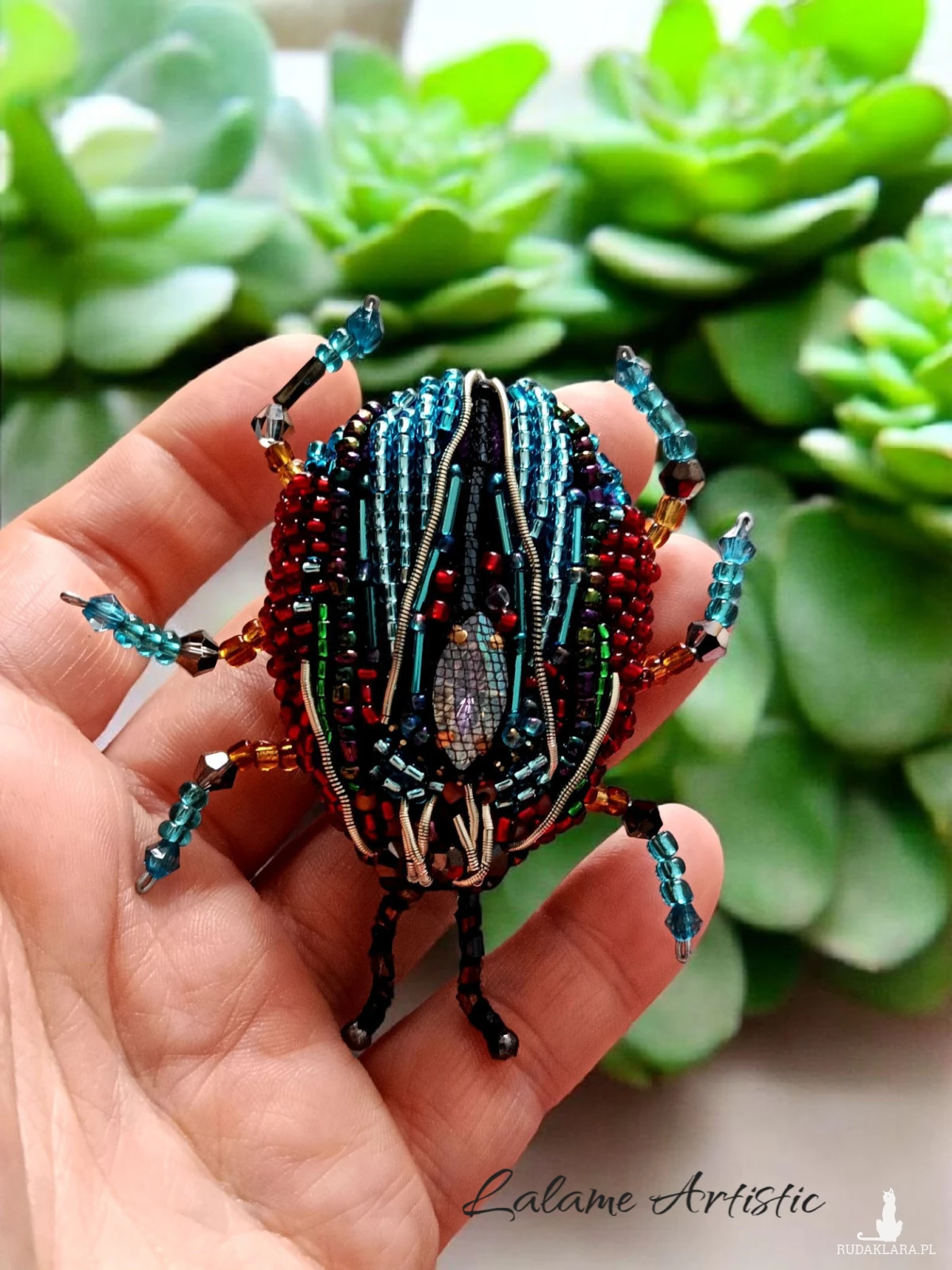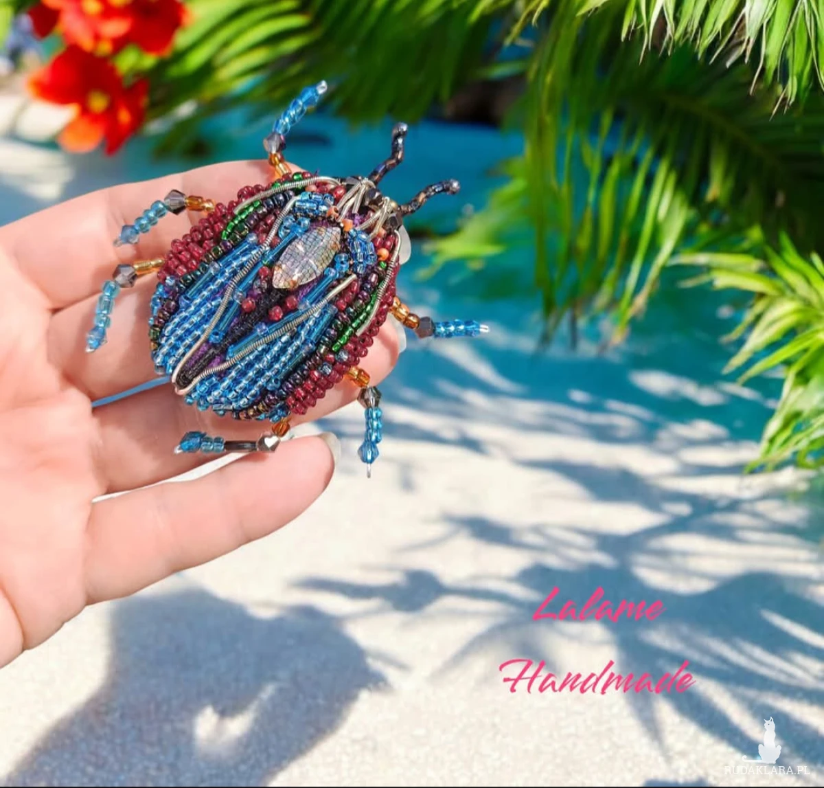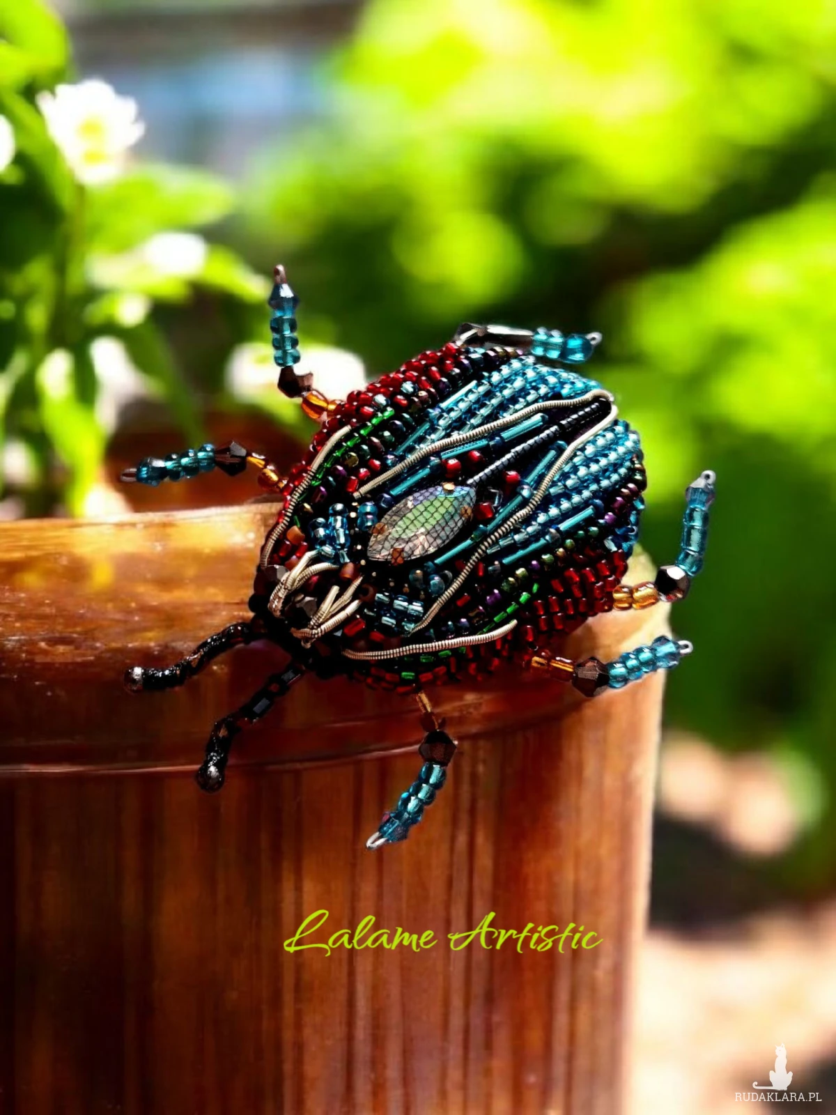 Ten wyjątkowy, ręcznie wykonany żuk to prawdziwy klejnot w świecie biżuterii. Inspirowany egzotycznymi owadami