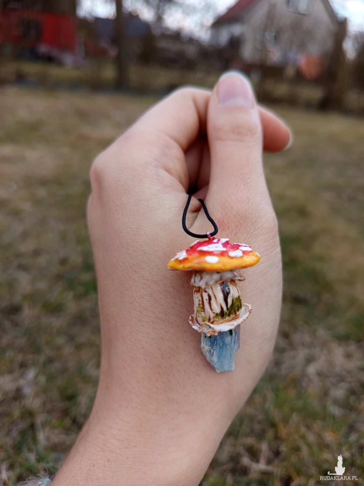 naszyjnik z masy polimerowej z kyanitem, ręcznie rzeźbiony oraz malowany