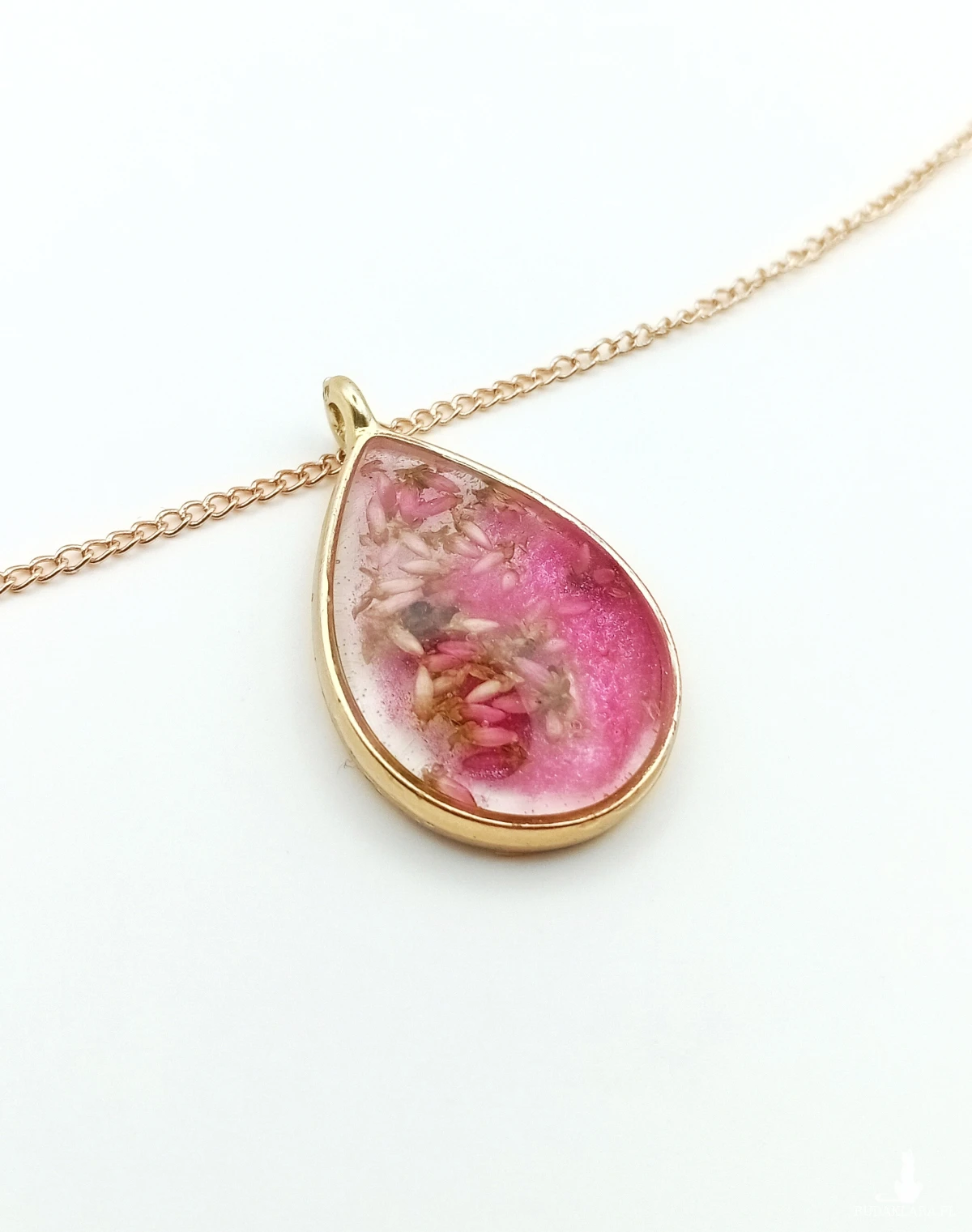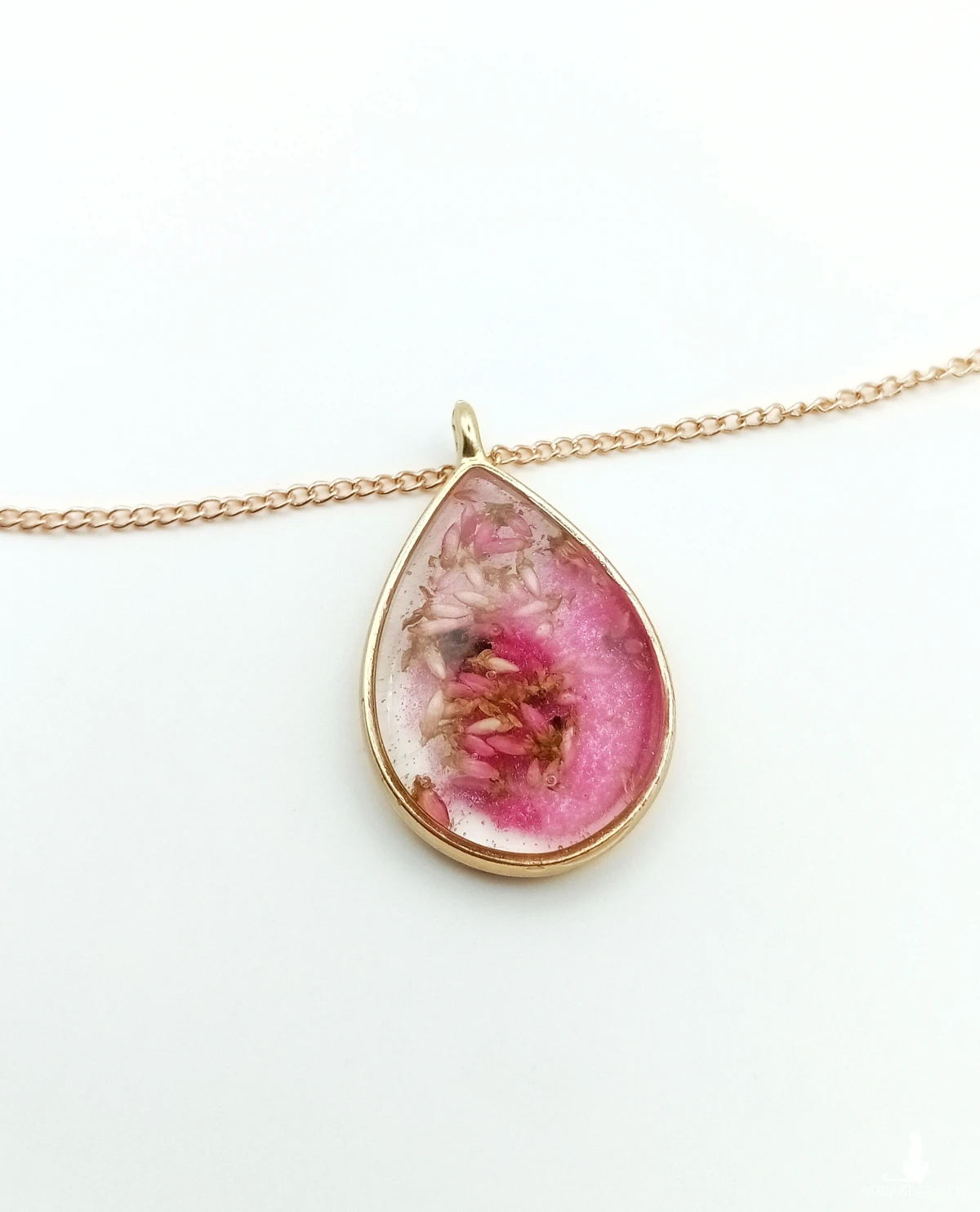 Zapraszam do odkrycia unikalnego wisiorka, który połączył urok ciemnego różu z delikatnością suszonego wrzosu. To nie tylko biżuteria, to wyjątkowe dzieło sztuki stworzone z pasją do detali.