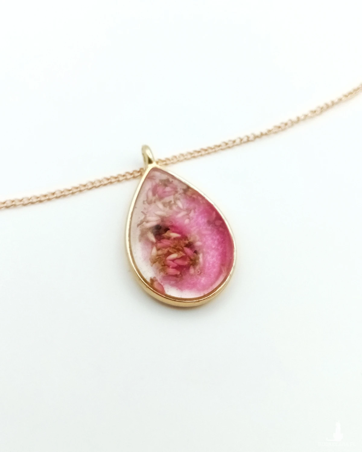 Kolorystyka: Żywica w odcieniu ciemnego różu i transparentna tworzą harmonijną całość, podkreślając wyjątkowy charakter wisiorka.