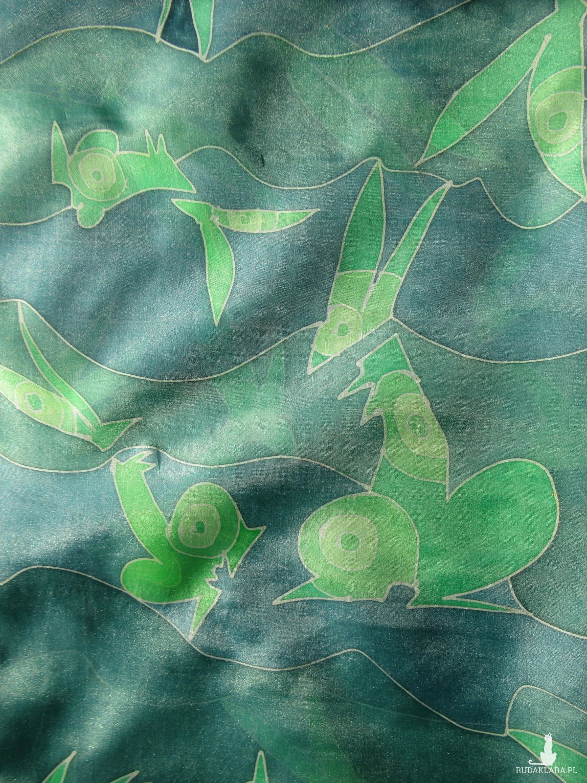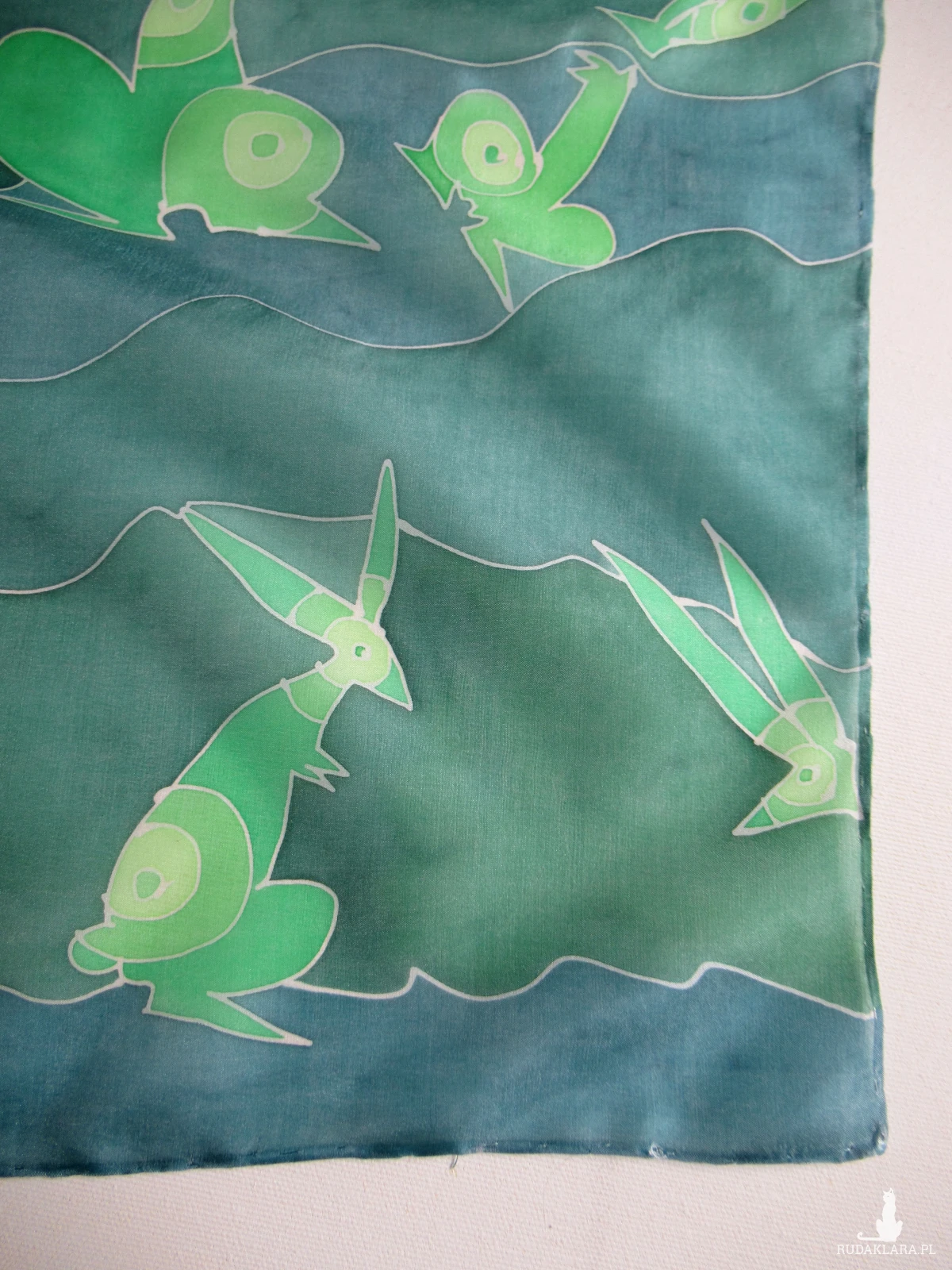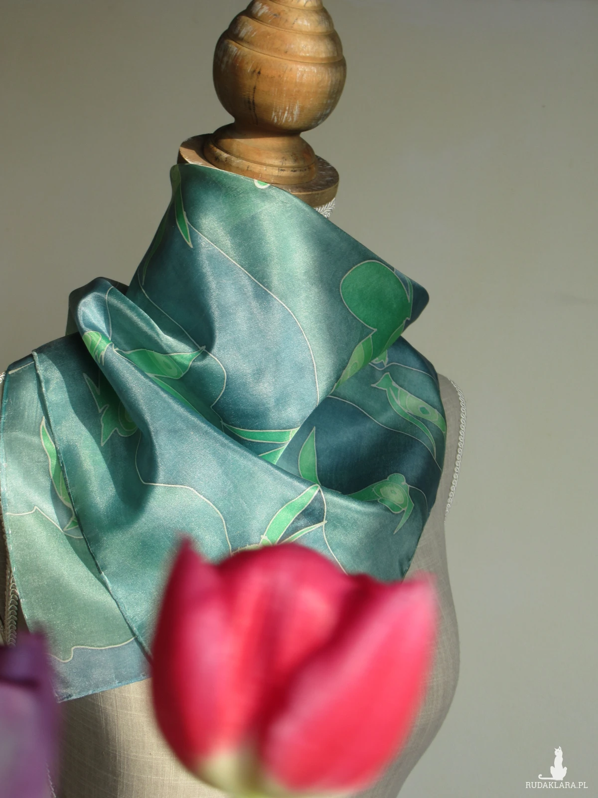 Jedwabna ręcznie malowana apaszka z motywem zajączków. Artystyczna, malarska, niepowtarzalna. Wiosenna, w różnych odcieniach zieleni.