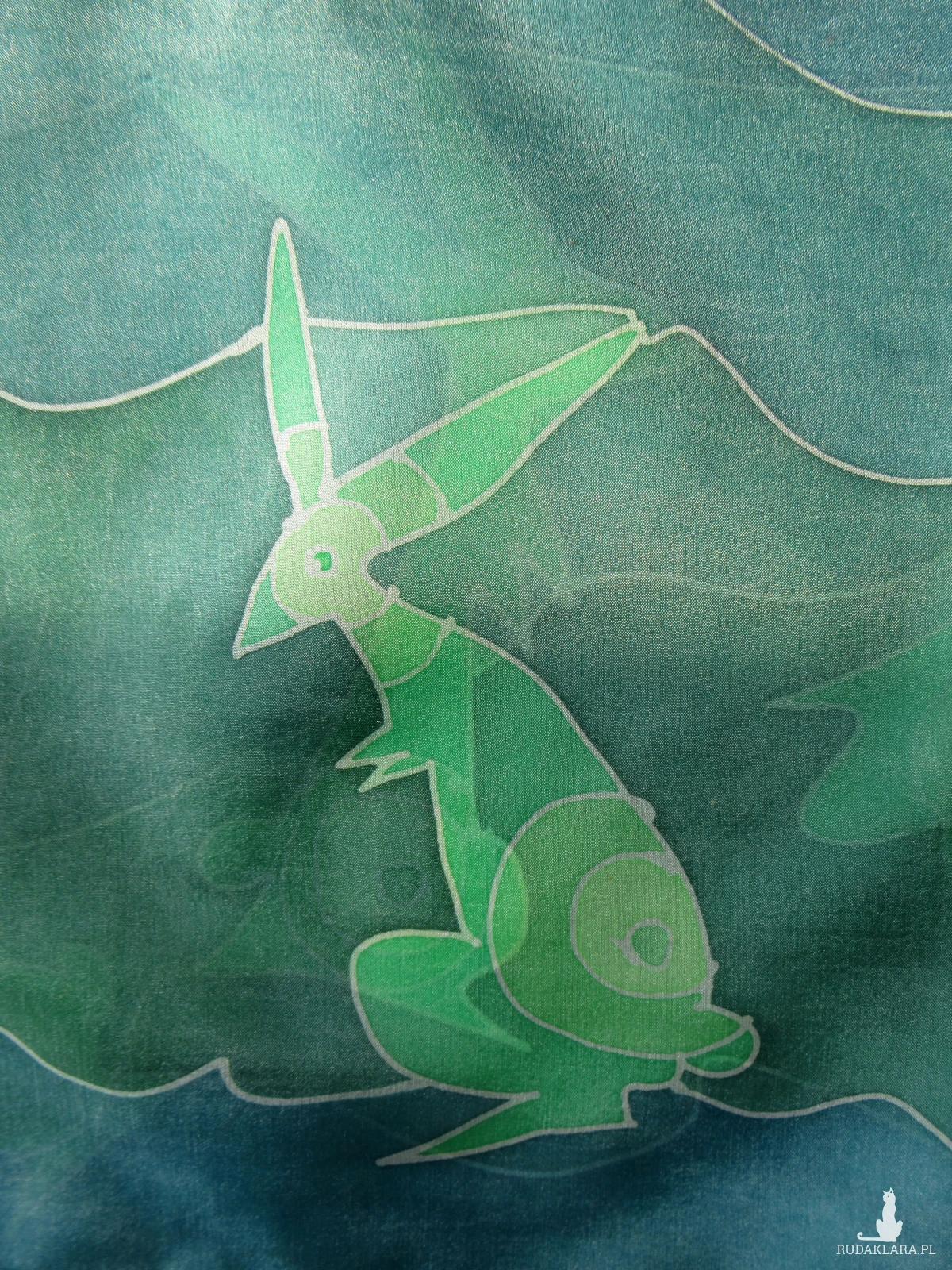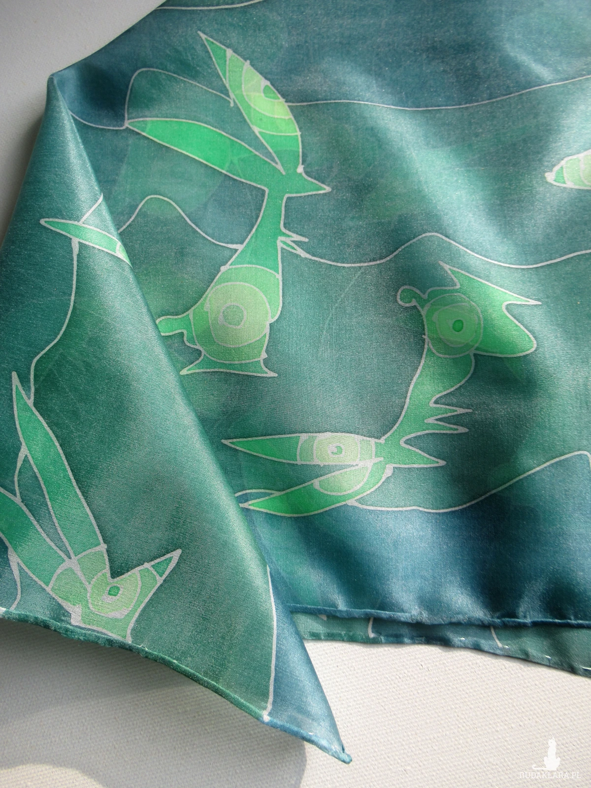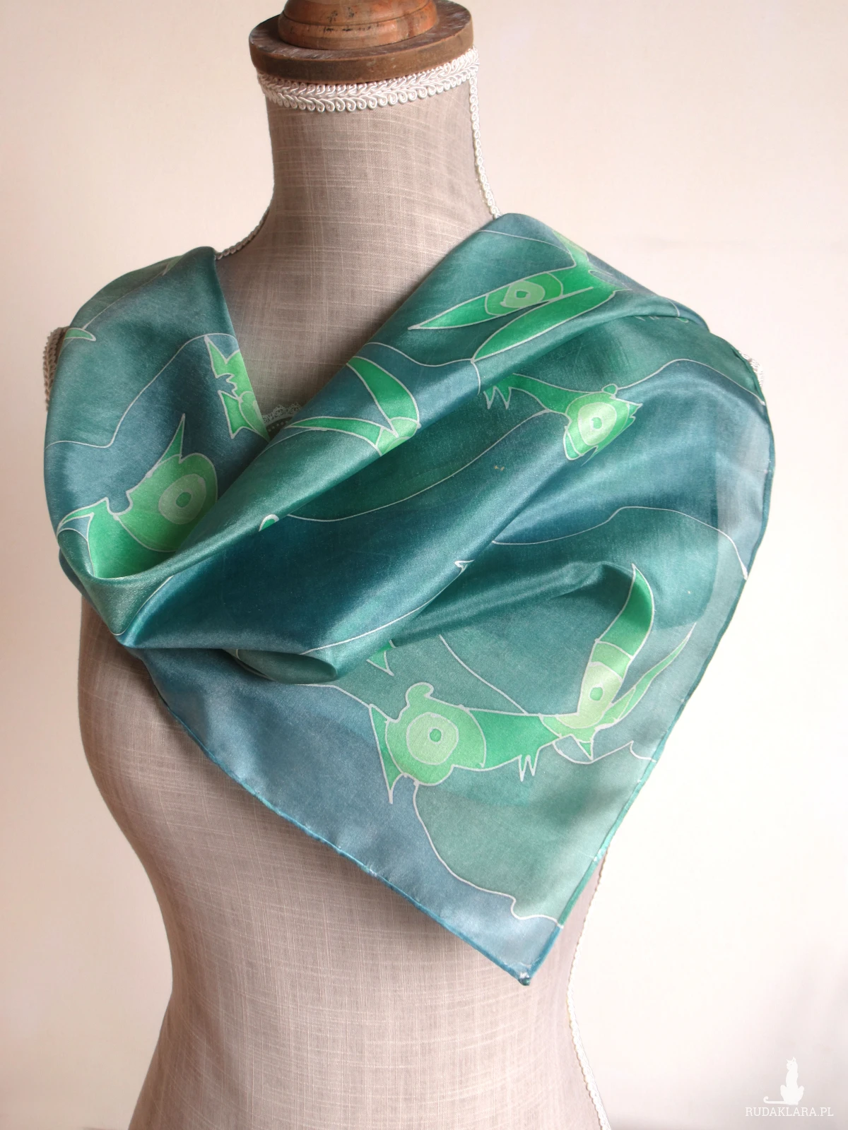 Jedwabna ręcznie malowana apaszka z motywem zajączków. Artystyczna, malarska, niepowtarzalna. Wiosenna, w różnych odcieniach zieleni.