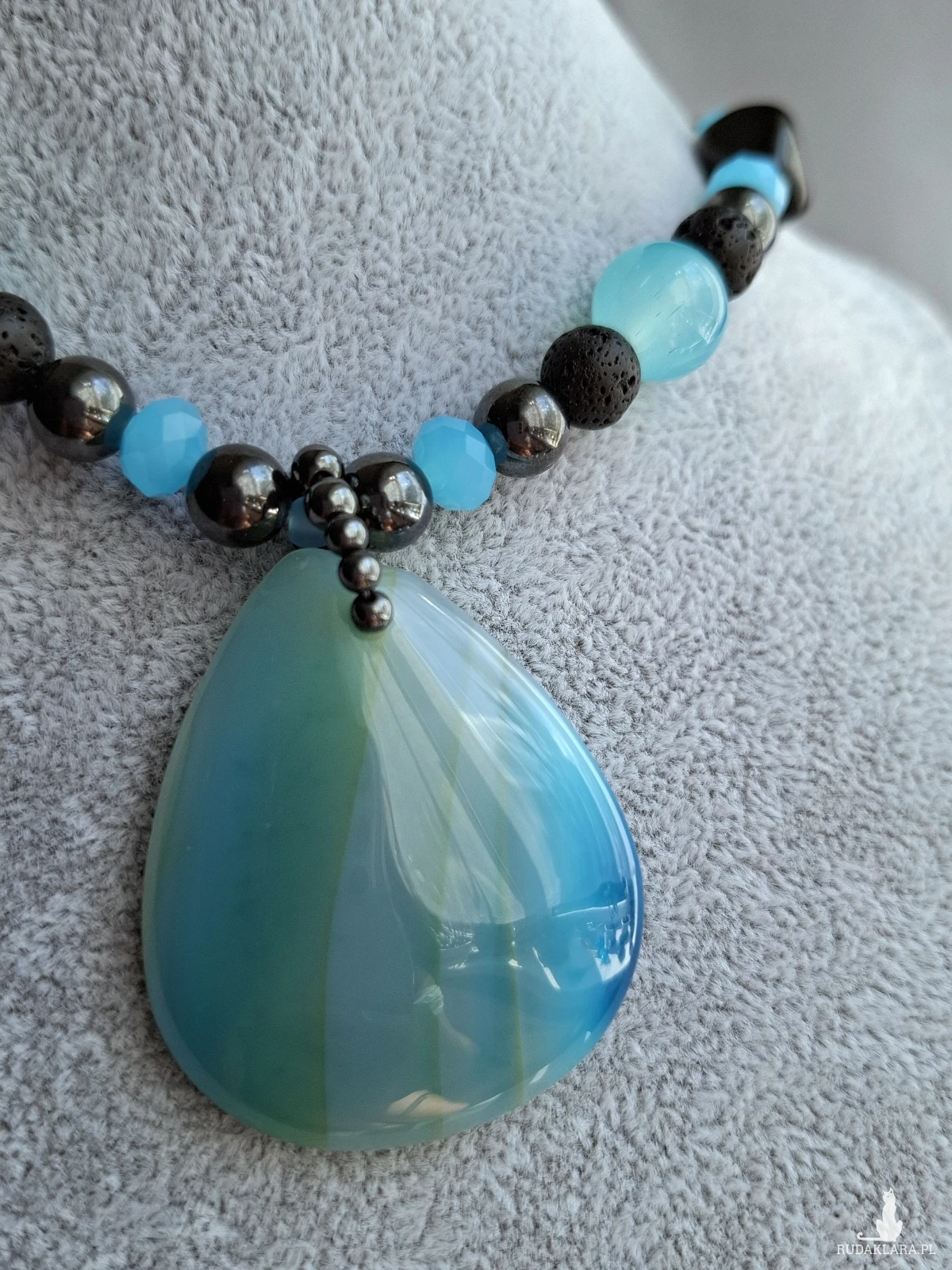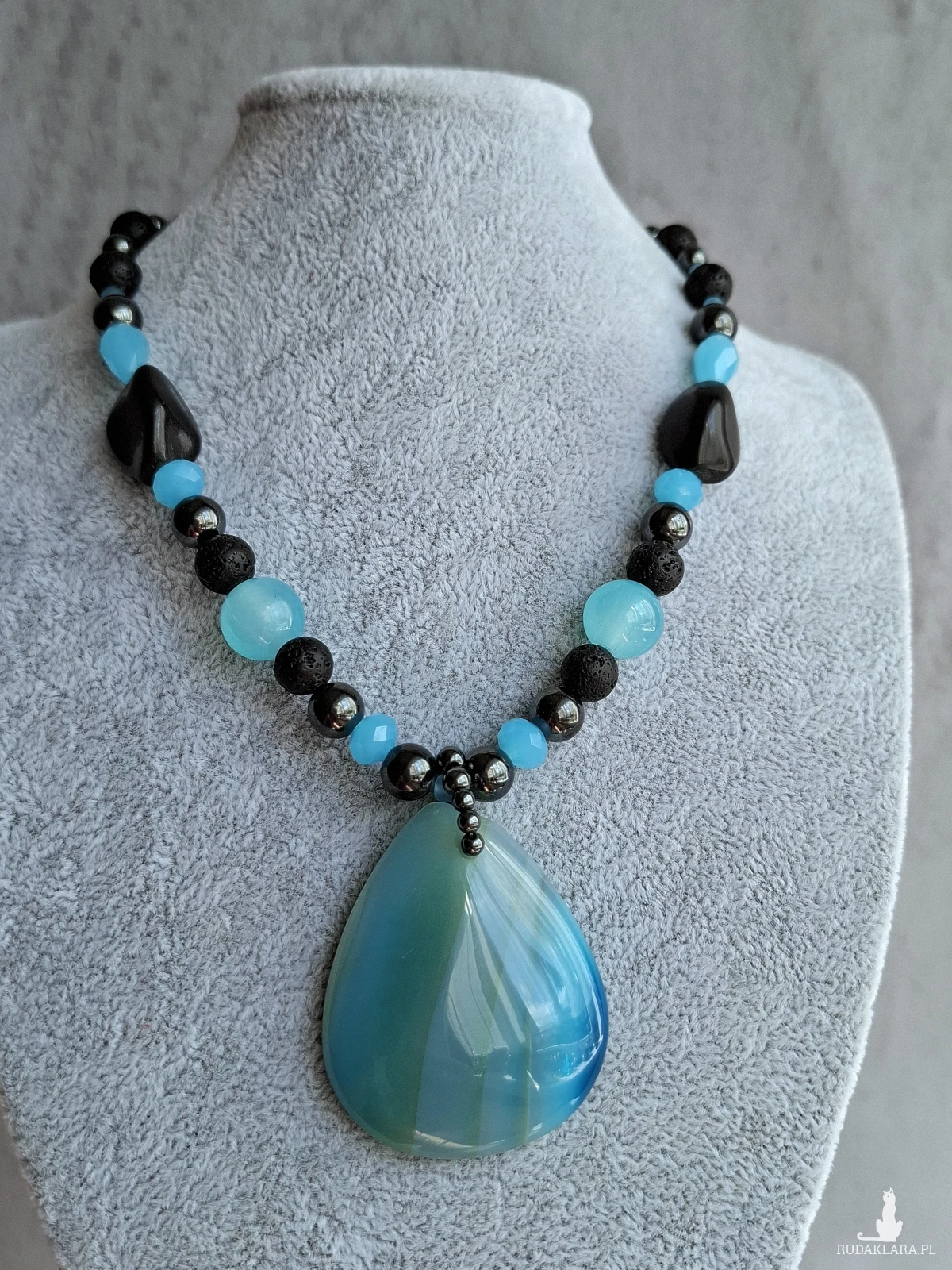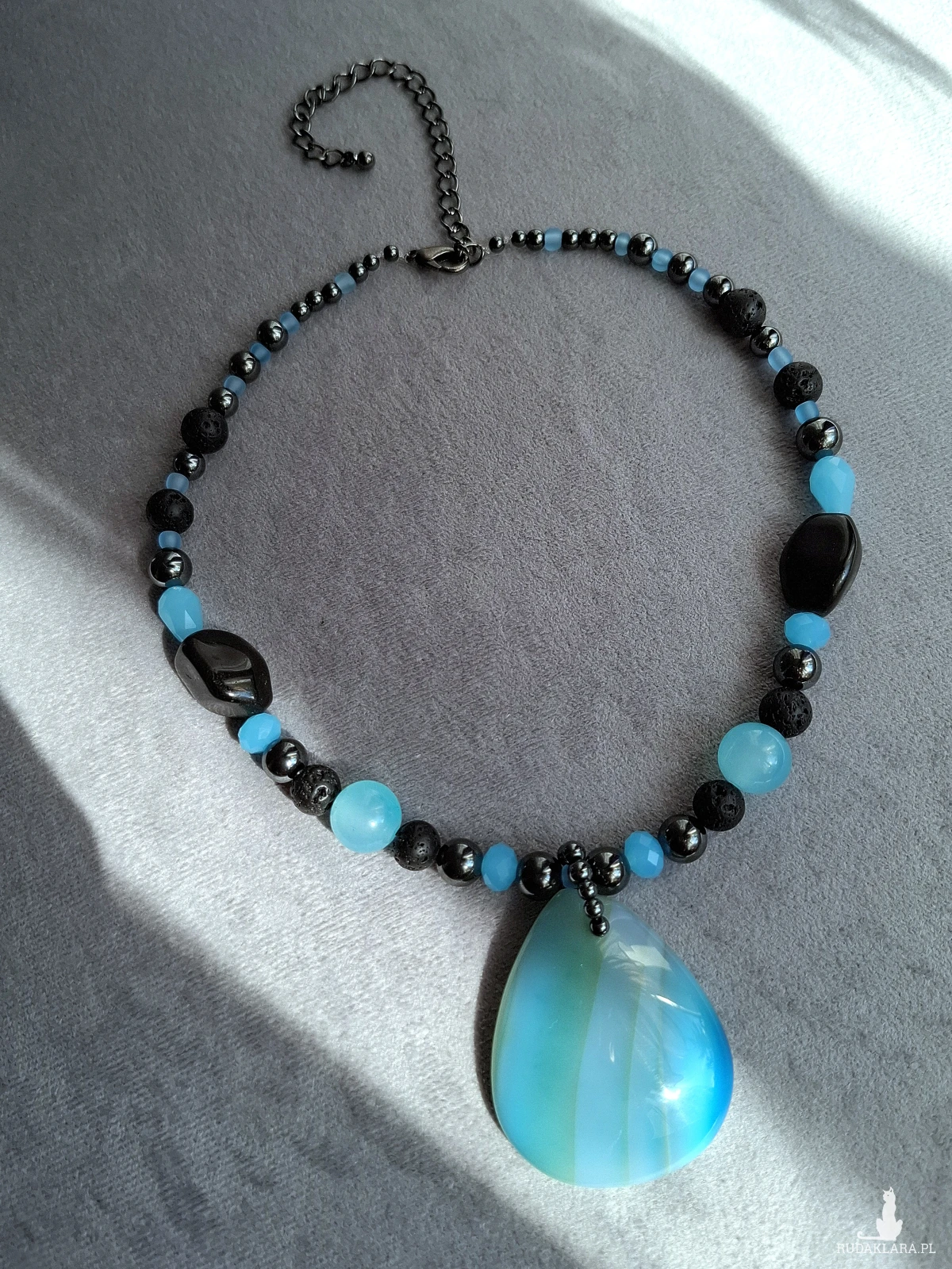 Krotki naszyjnik, kolia z dużym, pięknym agatem. Całość utrzymana w błękitach i czerni. Poza dużym wisiorem z agatu naszyjnik został skomponowany z drobniejszych agatów, lawy wulkanicznej, hematytu i szkła. Długość regulowana jest łańcuszkiem i wynosi od 38 do 48 cm.