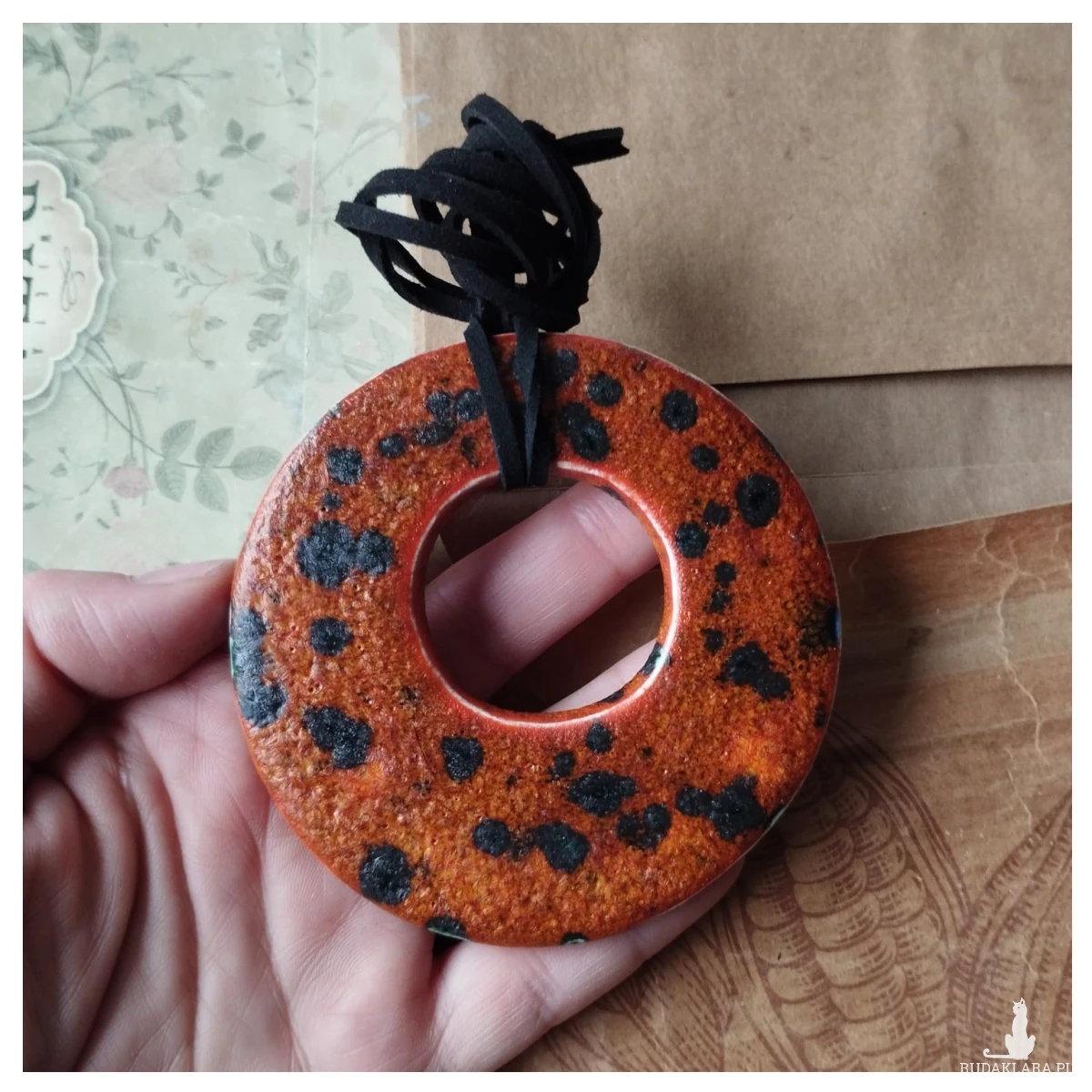 Wisior ceramiczny, wykonany z gliny szamotowej, wypalony na biskwit a następnie szkliwiony w temperaturze 1260 stopni C. Wymiary: 8 x 8 cm. W ciekawym zestawieniu kolorystycznym. Polecam Paniom poszukującym nietuzinkowej biżuterii. Serdecznie polecam!