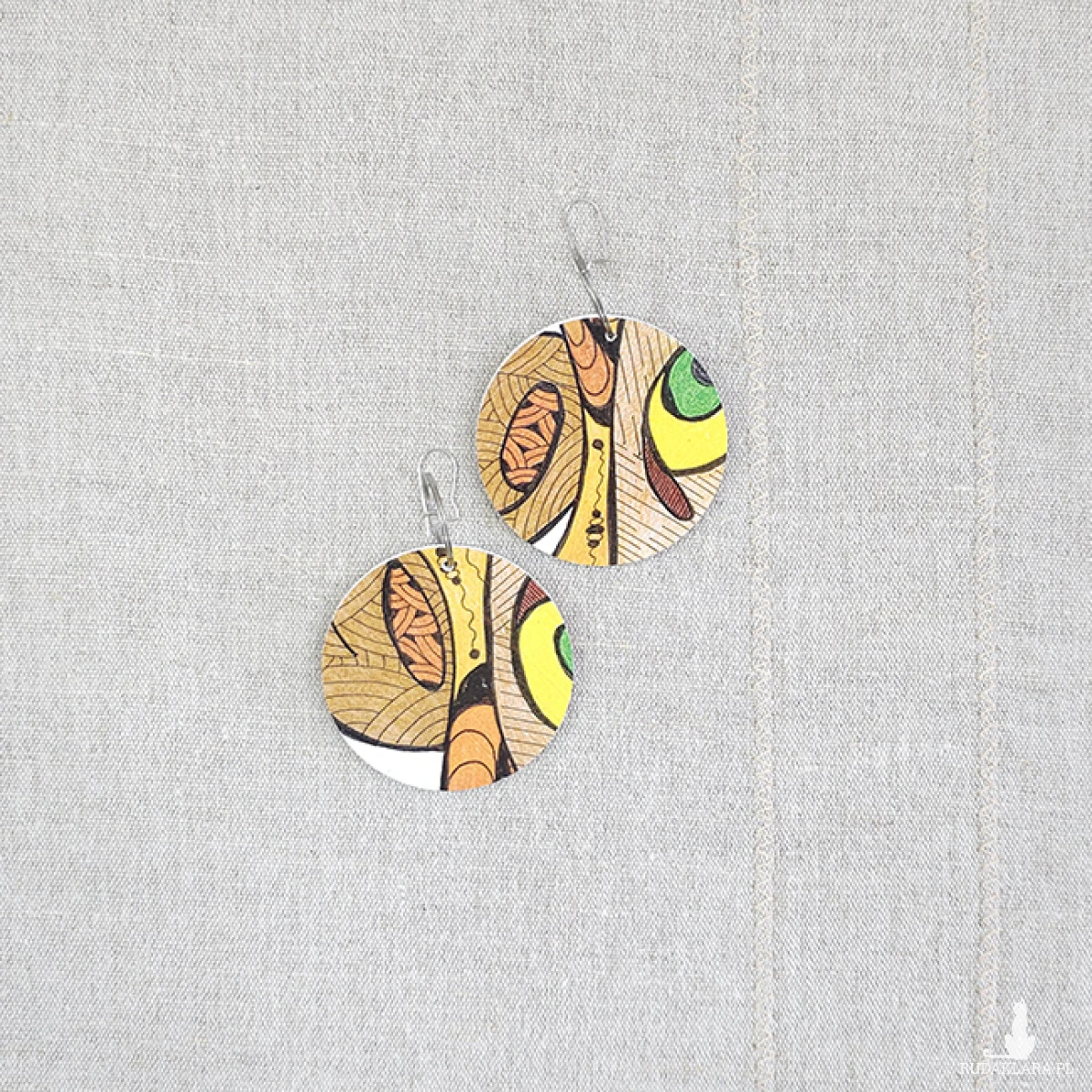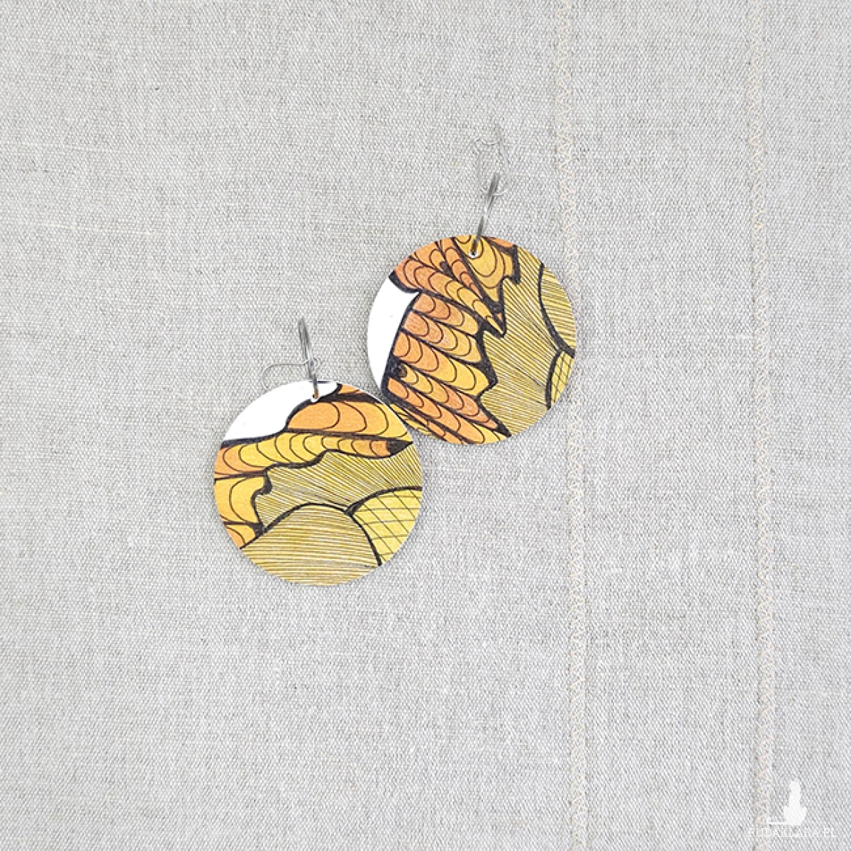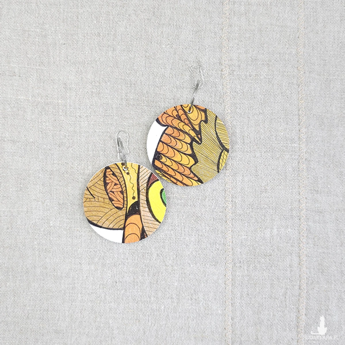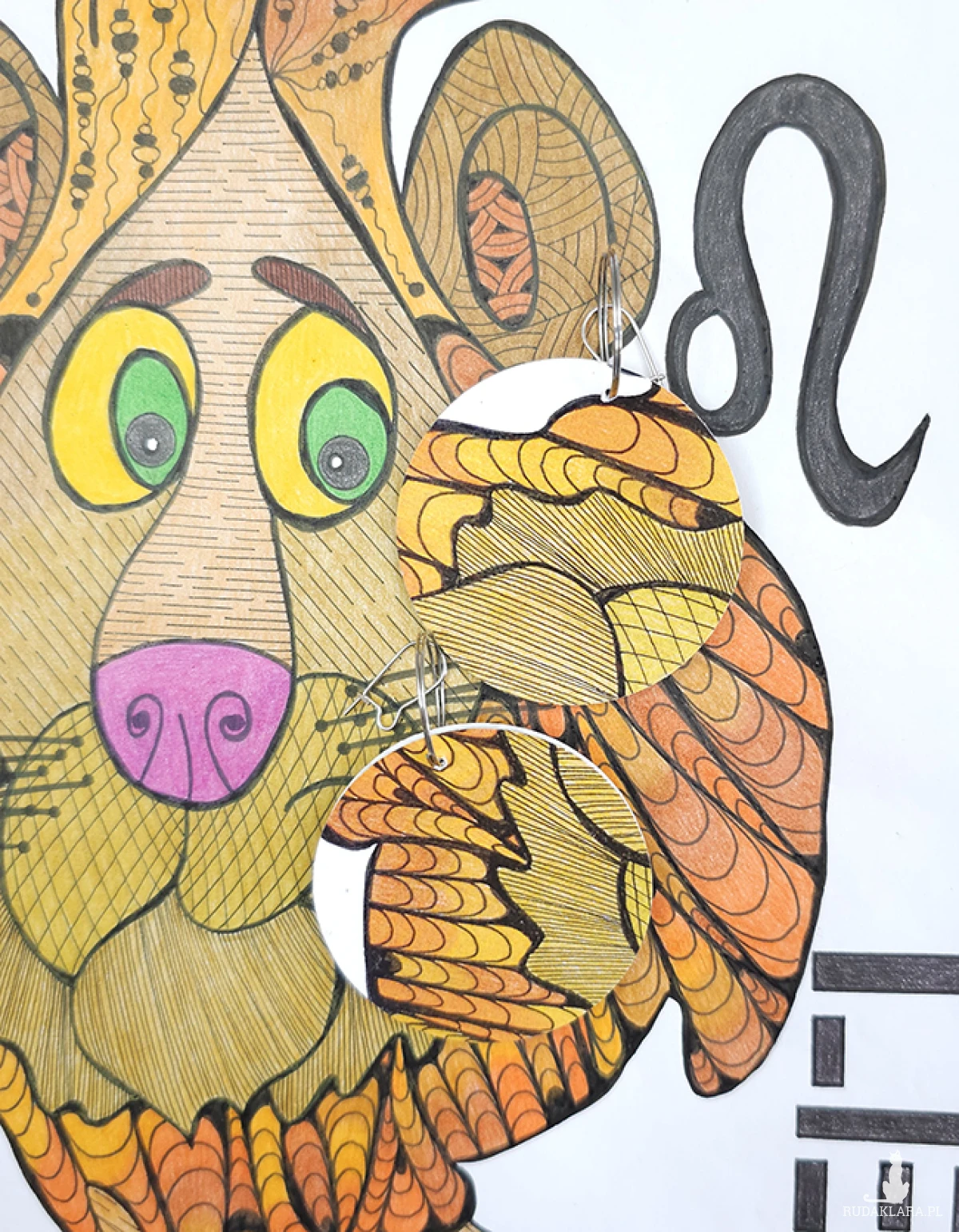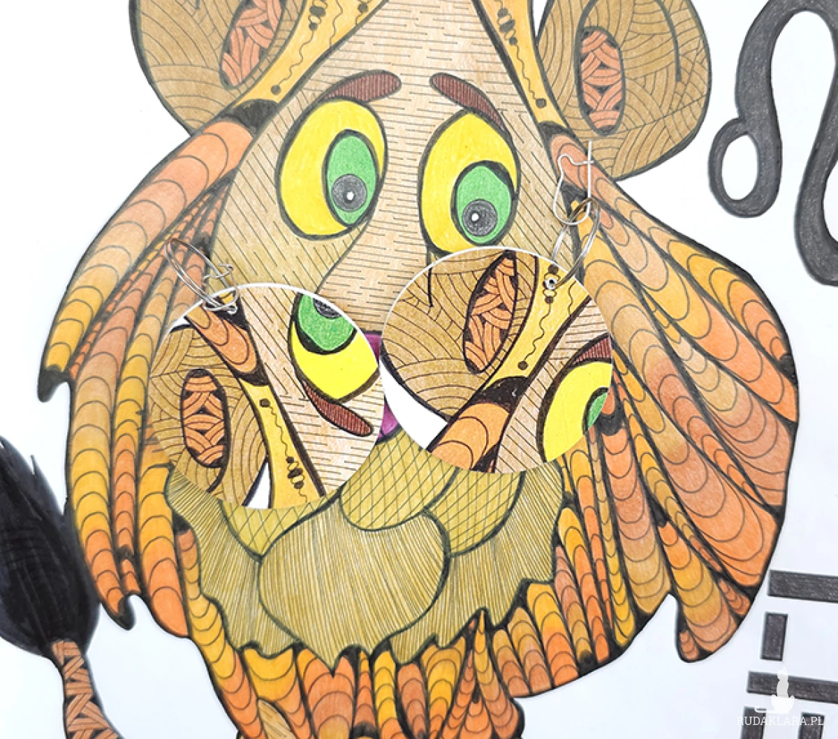 Kolczyki wykonane z drewnianej bazy oraz części mojego autorskiego rysunku "Lew".