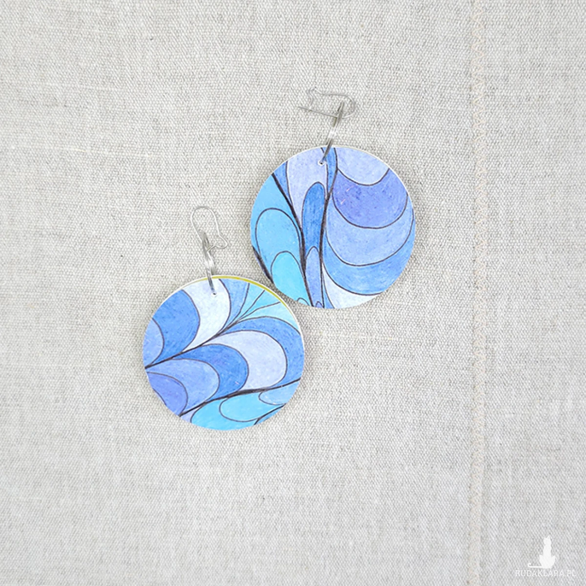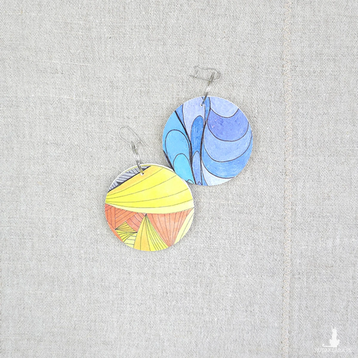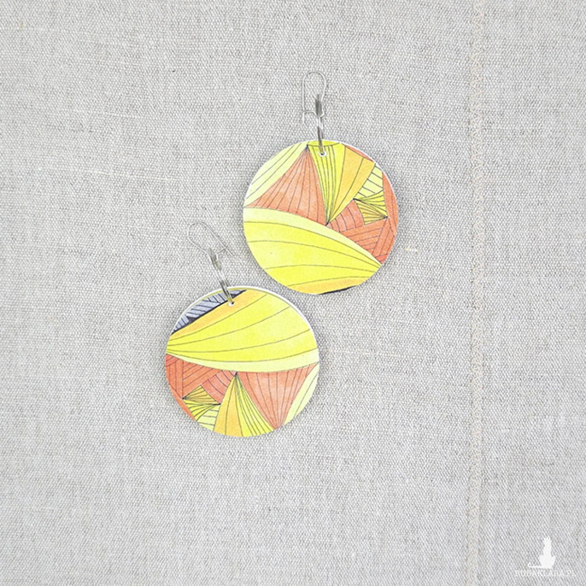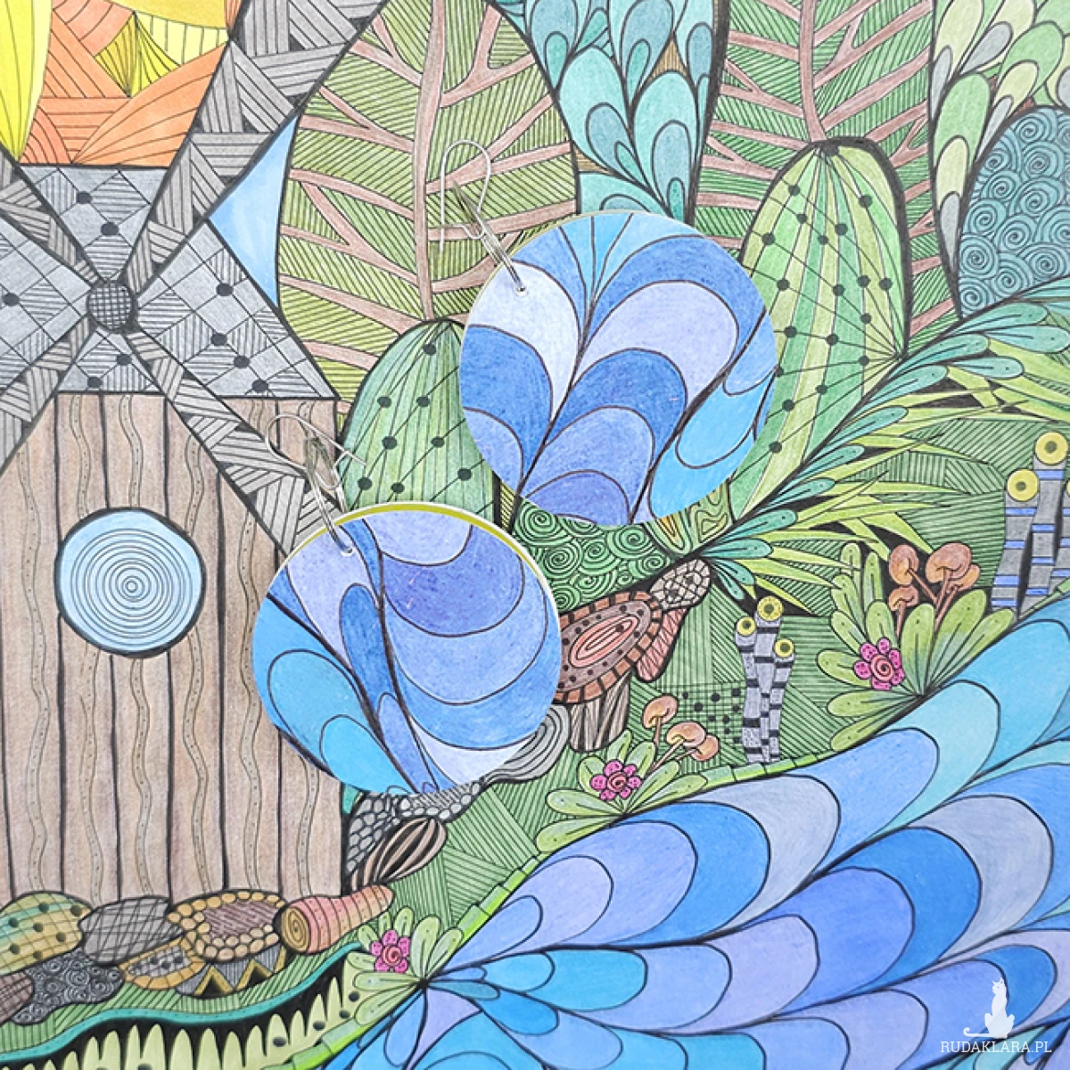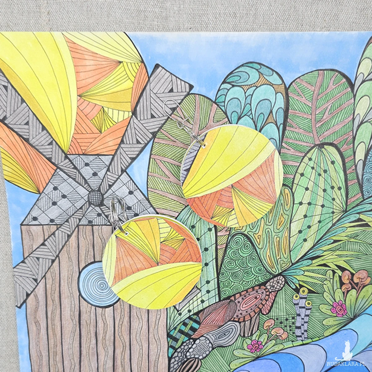 Kolczyki wykonane z drewnianej bazy oraz części mojego autorskiego rysunku "Wiatrak".