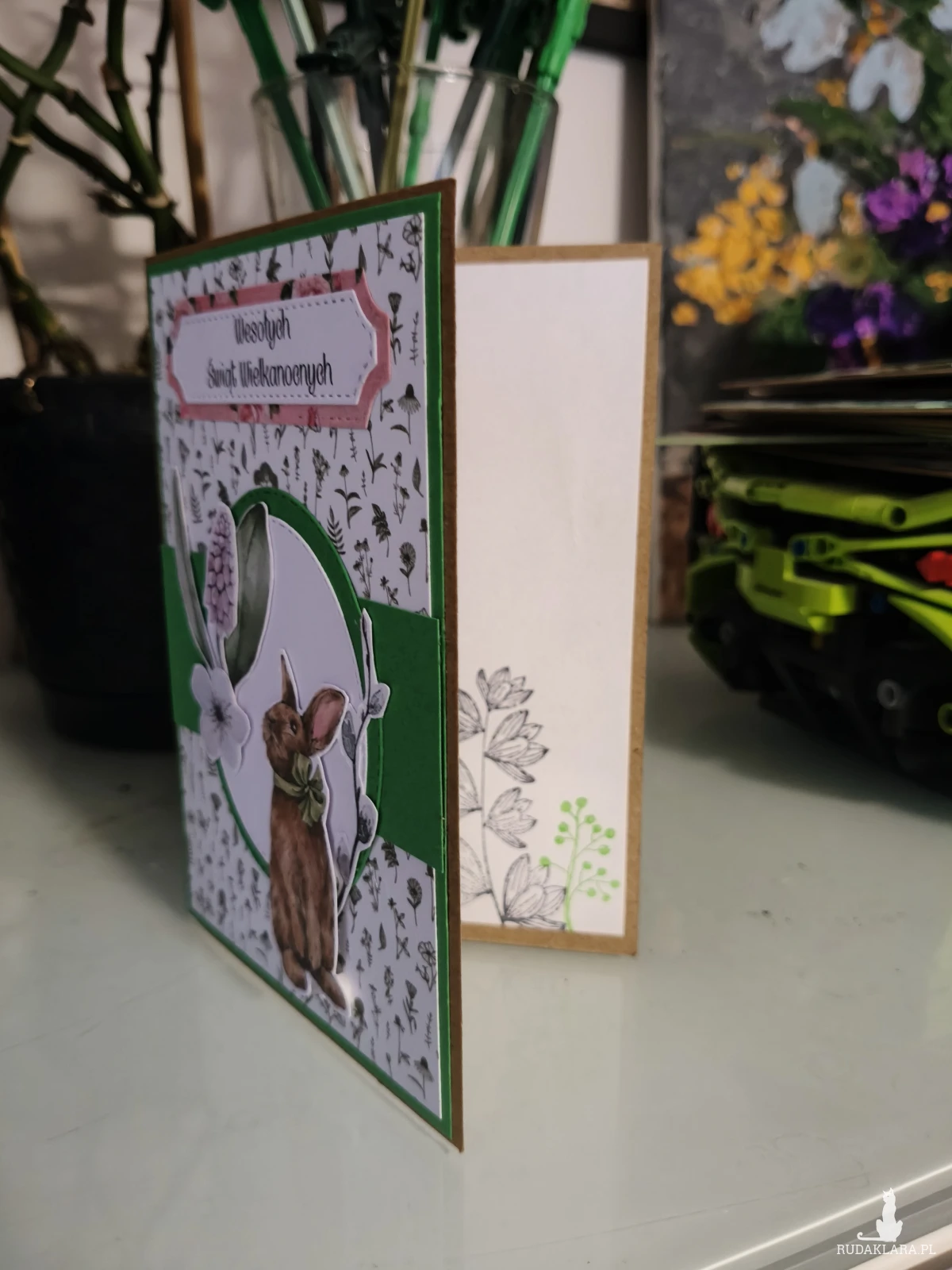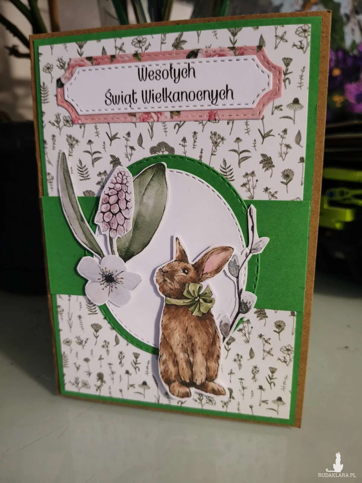 Subtelna i stylowa kartka wielkanocna z uroczym zajączkiem w pastelowych odcieniach brązu i różu. Delikatne wzory i harmonijna kolorystyka nadają jej wyjątkowy, klasyczny wygląd. Idealna do przekazania ciepłych, świątecznych życzeń bliskim!