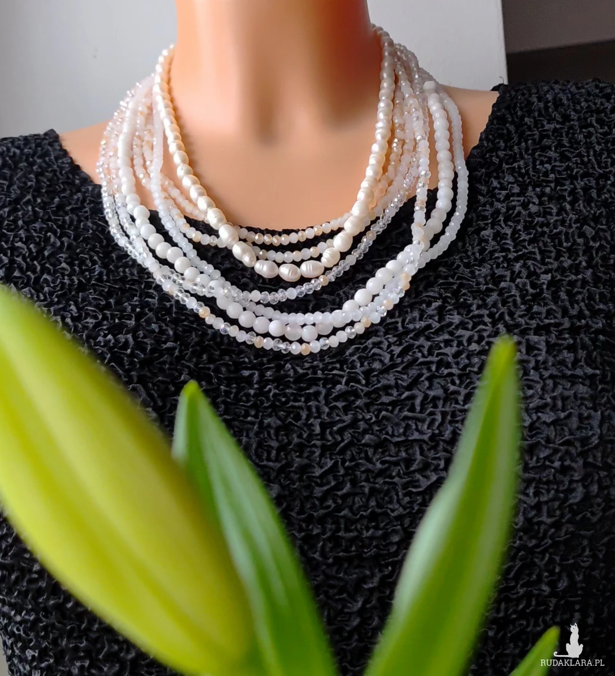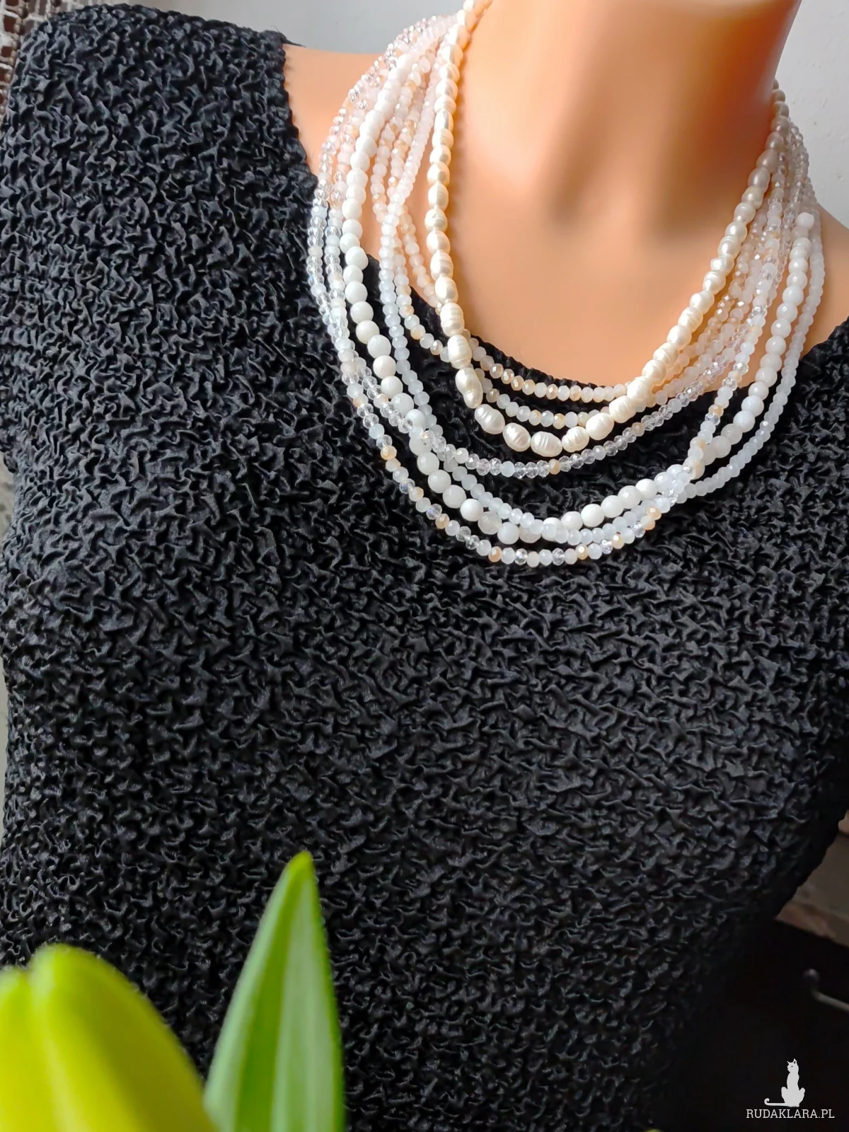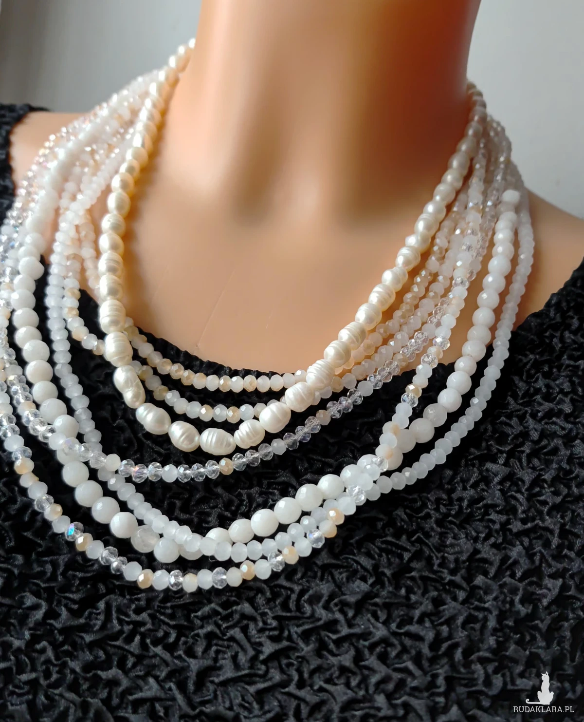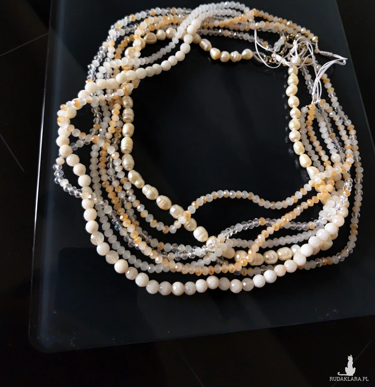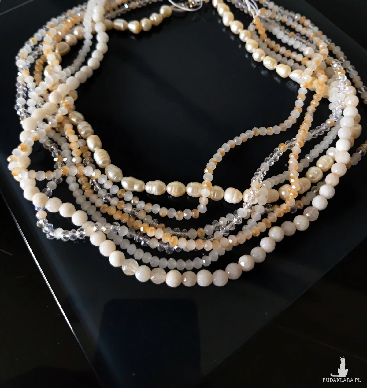 Naszyjnik złożony z czterech części, każdą można nosić oddzielnie, chociaż w całości naszyjnik wygląda pięknie i okazale. Sznur pereł rzecznych i trzy  naszyjniki po dwa sznury korali szklanych kryształków i kulek jadeitu mlecznego. Sznurek syntetyczny ma zapięcie makramowe regulowane do 54 cm objętości głowy, nie otwiera się, należy przełozyć przez głowę. Sznur perełek ma zapięcie na karabińczyk ze stali nierdzewnej.