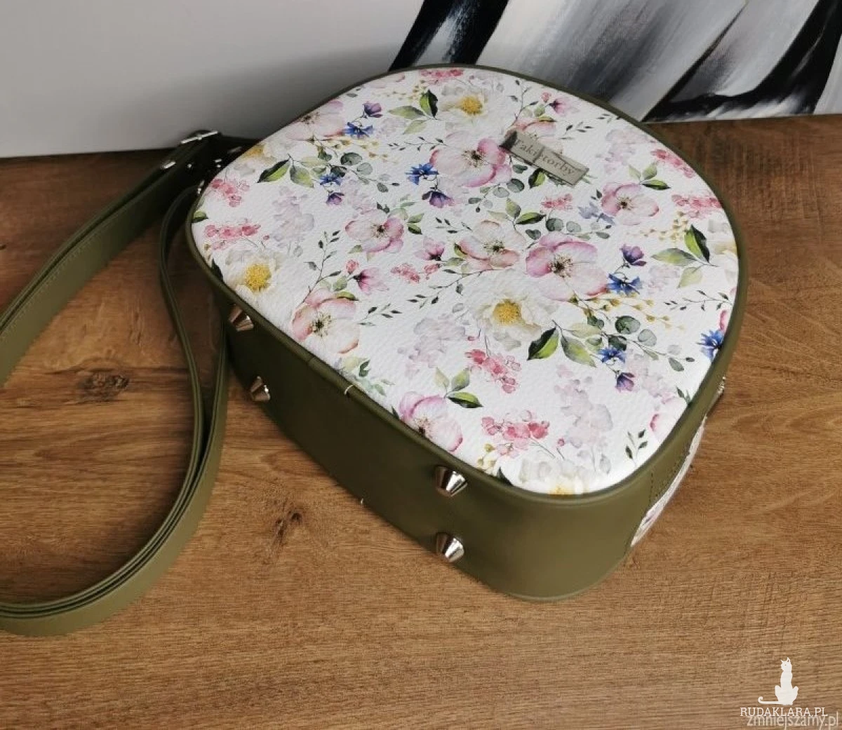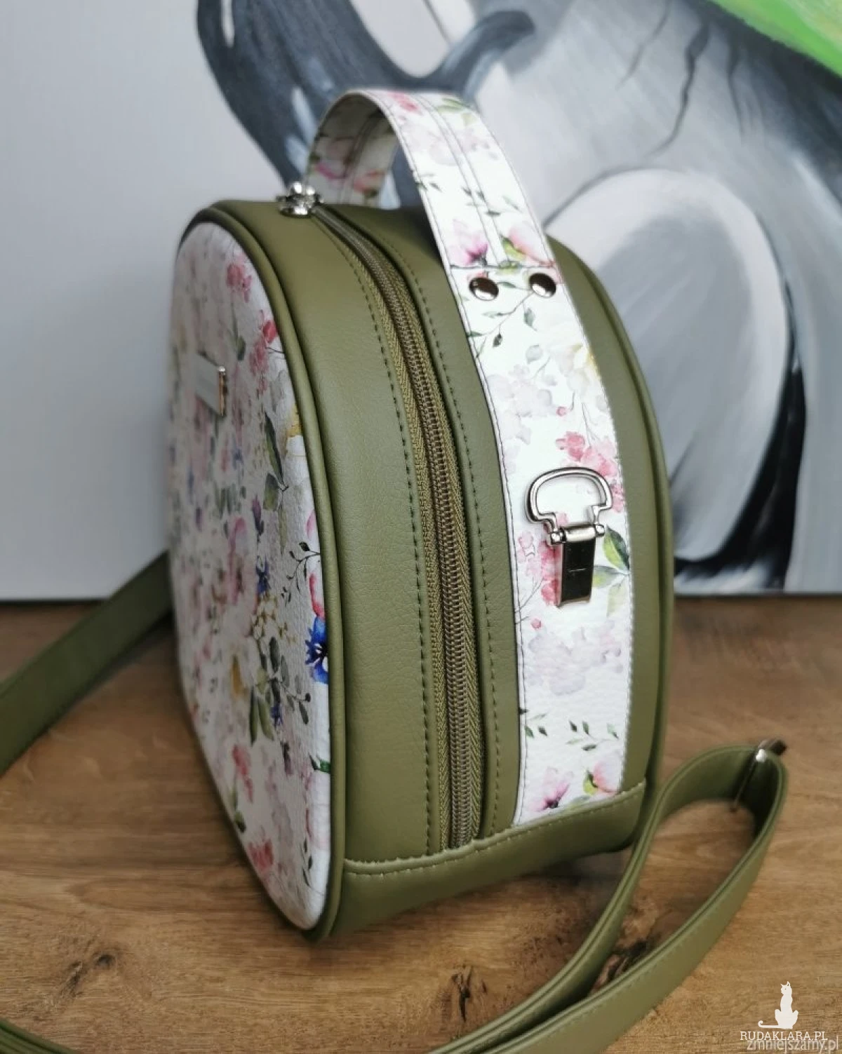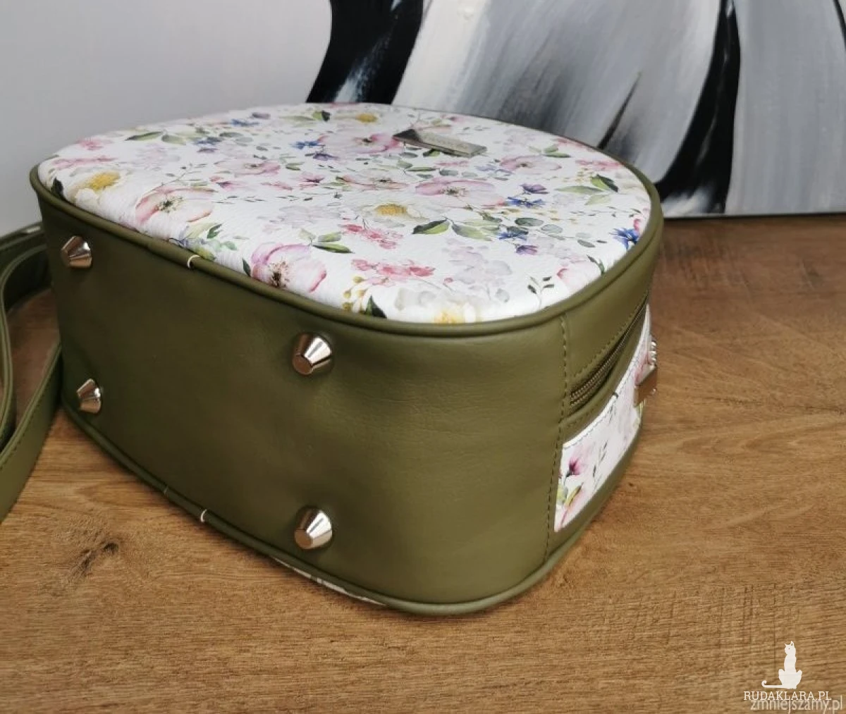 Torebka typu kuferek, uszyta z kolorowej drukowanej ekoskóry i ekoskóry gładkiej w kolorze zielonym / khaki. U góry wygodny uchwyt. Zapinana na zamek. Kieszeń na zamek na tyle torebki. Wewnętrzna podszewka poliestrowa wodoodporna w kolorze zielonym / khaki wykończona czarną lamówką. Znajdziesz tu dwie kieszenie, kieszeń na zamek i kieszeń otwartą, oraz smycz z karabińczykiem na klucze. Od spodu torebki cztery metalowe pukle. Prezentowaną torebkę można nosić w dłoni lub na ramieniu na długim regulowanym odpinanym pasku. Okucia w kolorze srebrnym.