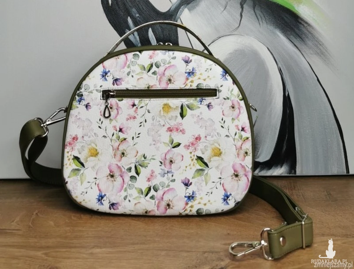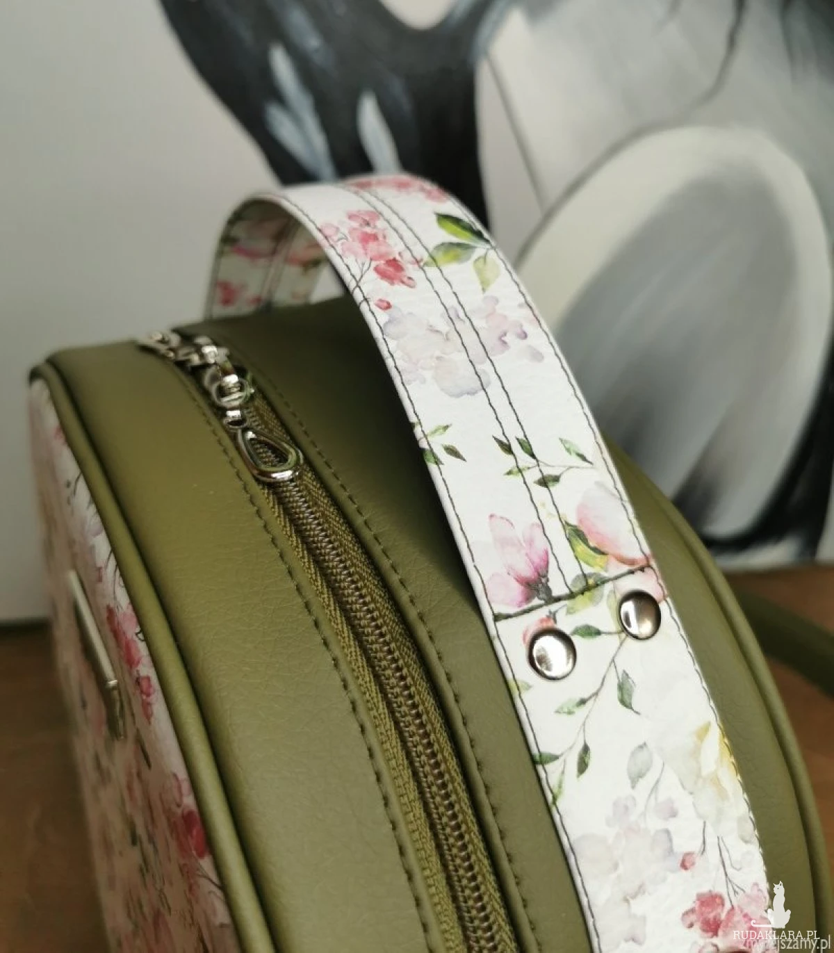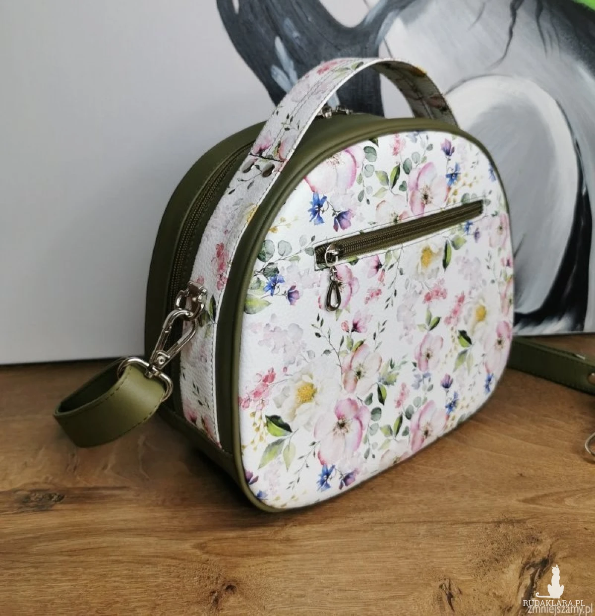 Torebka typu kuferek, uszyta z kolorowej drukowanej ekoskóry i ekoskóry gładkiej w kolorze zielonym / khaki. U góry wygodny uchwyt. Zapinana na zamek. Kieszeń na zamek na tyle torebki. Wewnętrzna podszewka poliestrowa wodoodporna w kolorze zielonym / khaki wykończona czarną lamówką. Znajdziesz tu dwie kieszenie, kieszeń na zamek i kieszeń otwartą, oraz smycz z karabińczykiem na klucze. Od spodu torebki cztery metalowe pukle. Prezentowaną torebkę można nosić w dłoni lub na ramieniu na długim regulowanym odpinanym pasku. Okucia w kolorze srebrnym.