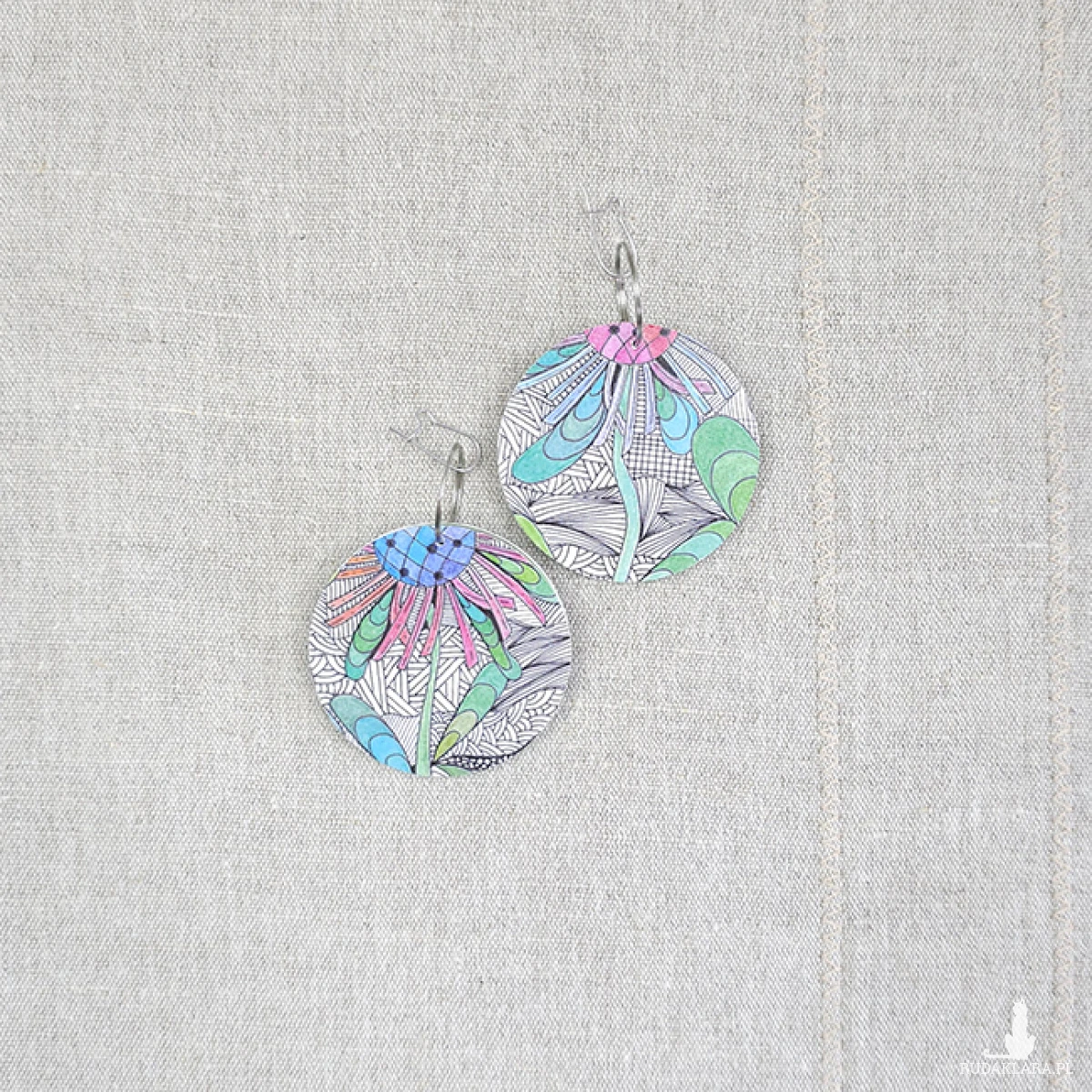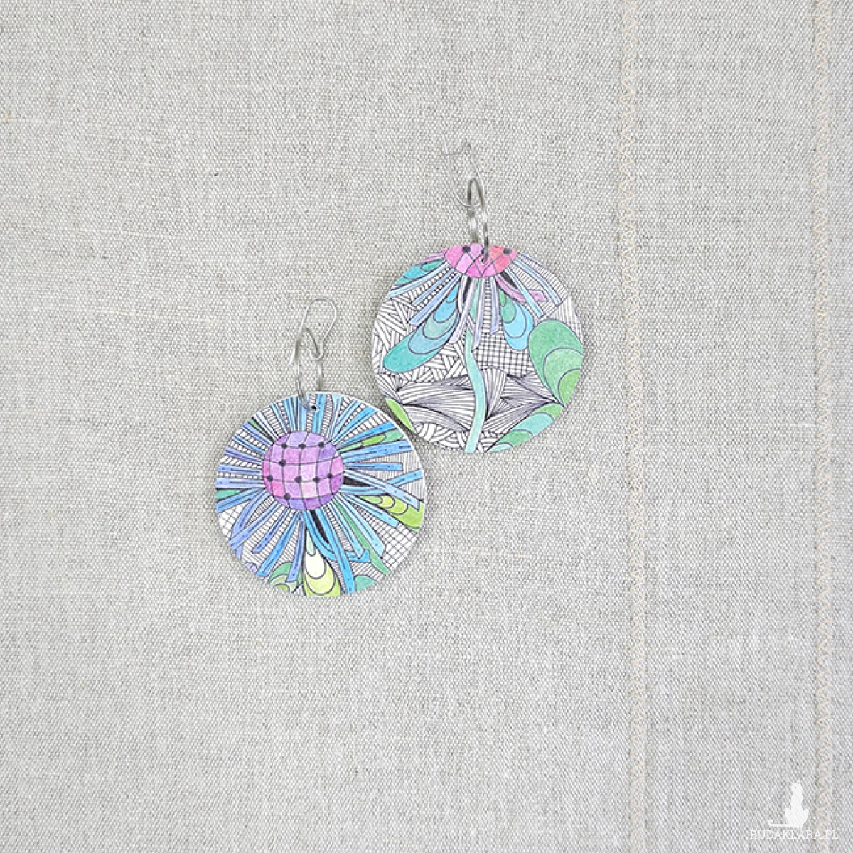 Kolczyki wykonane z drewnianej bazy oraz części mojego autorskiego rysunku "Pomimo".
