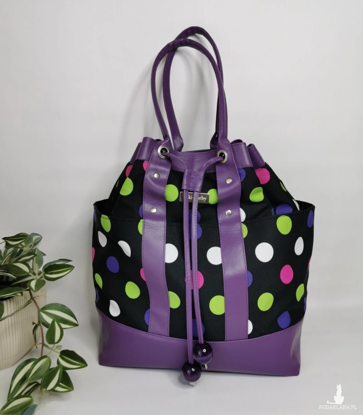 Duża pojemna torba miejska typu bucket bag z mnóstwem miejsca do przechowywania . Sprawdzi się jako torba do pracy , na uczelnię , na co dzień. Mieści format A4 oraz laptopa 14" . Do noszenia na krótkich , półokrągłych uchwytach na przedramieniu lub ramieniu . Mocne i solidnie przyszyte półokrągłe , wypełnione uchwyty pozwolą w komfortowy sposób nosić nawet większe obciążenia . Wlot do głównej torby zamykany jest poprzez zaciągnięcie cienkiego paska przebiegającego poprzez oczka przelotowe . Wewnątrz obszernej komory głównej znajdują się trzy kieszenie w tym jedna otwarta oraz smycz z karabińczykiem na klucze . Na zewnątrz cały korpus torby okala wsuwana kieszeń na drobiazgi " do szybkiego wrzucania " Podwójnie usztywnione dno oraz pukle dodają torbie stabilności i dobrze podtrzymują kształt . Torebka została wykonana z wzorzystej tkaniny poliestrowej wodoodpornej oraz fioletowej ekoskóry . Podszewka to czarna tkanina poliestrowa wodoodporna .